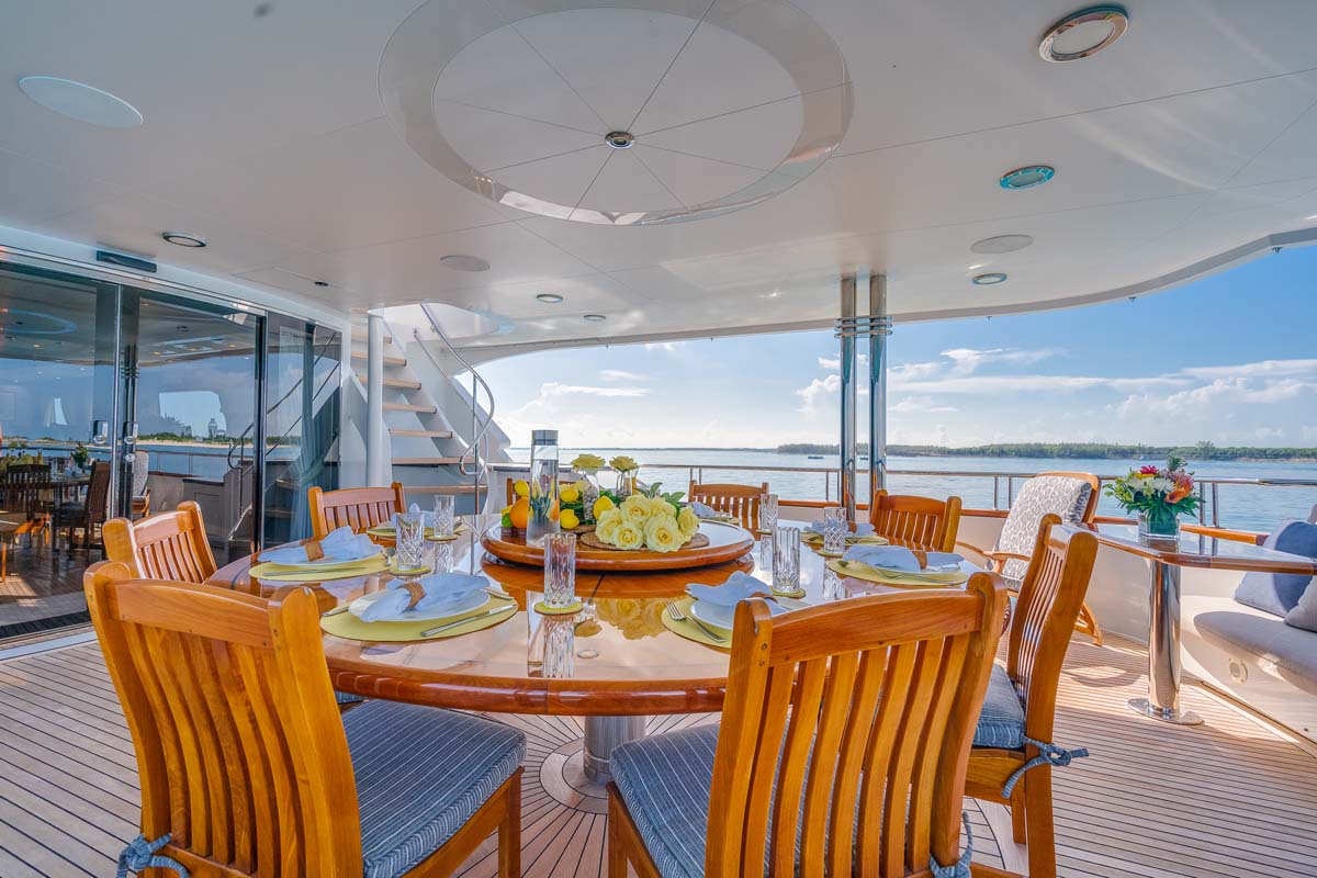 138′ Richmond yacht MISS STEPHANIE features an exterior just as spacious as her interior. This includes expansive seating areas, alfresco dining, and a large sun deck perfect for soaking up the stunning Bahamian views. The expansive seating areas provide ample space for relaxation and socializing, offering panoramic views of the breathtaking surroundings. The alfresco dining area is perfect for enjoying gourmet meals under the stars, while the large sun deck invites guests to bask in the sunshine or unwind in the shade. These outdoor spaces create an idyllic environment for leisure and entertainment, enhancing the overall experience onboard.