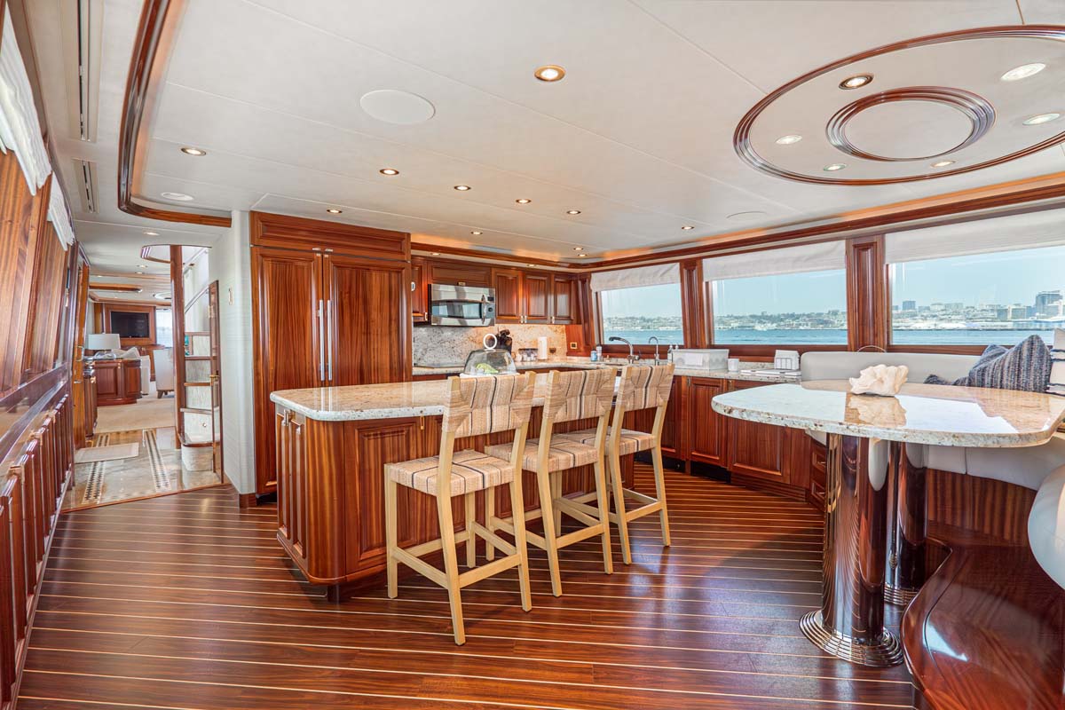 The bright, open salon invites relaxation with a comfortable lounge, bar, and dining area ideal for gathering. The galley forward offers a friendly, social atmosphere where guests can chat with the chef and enjoy the day’s culinary creations.