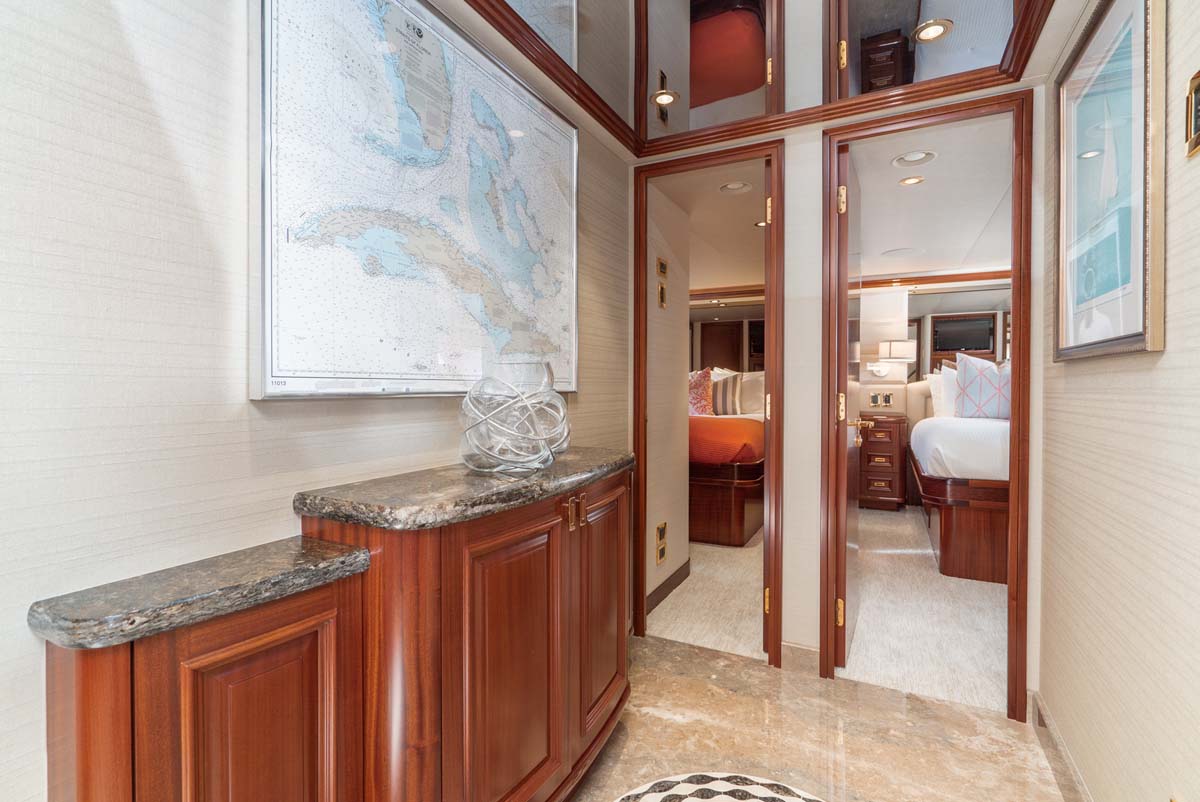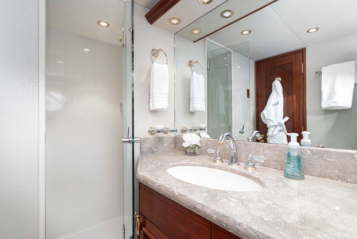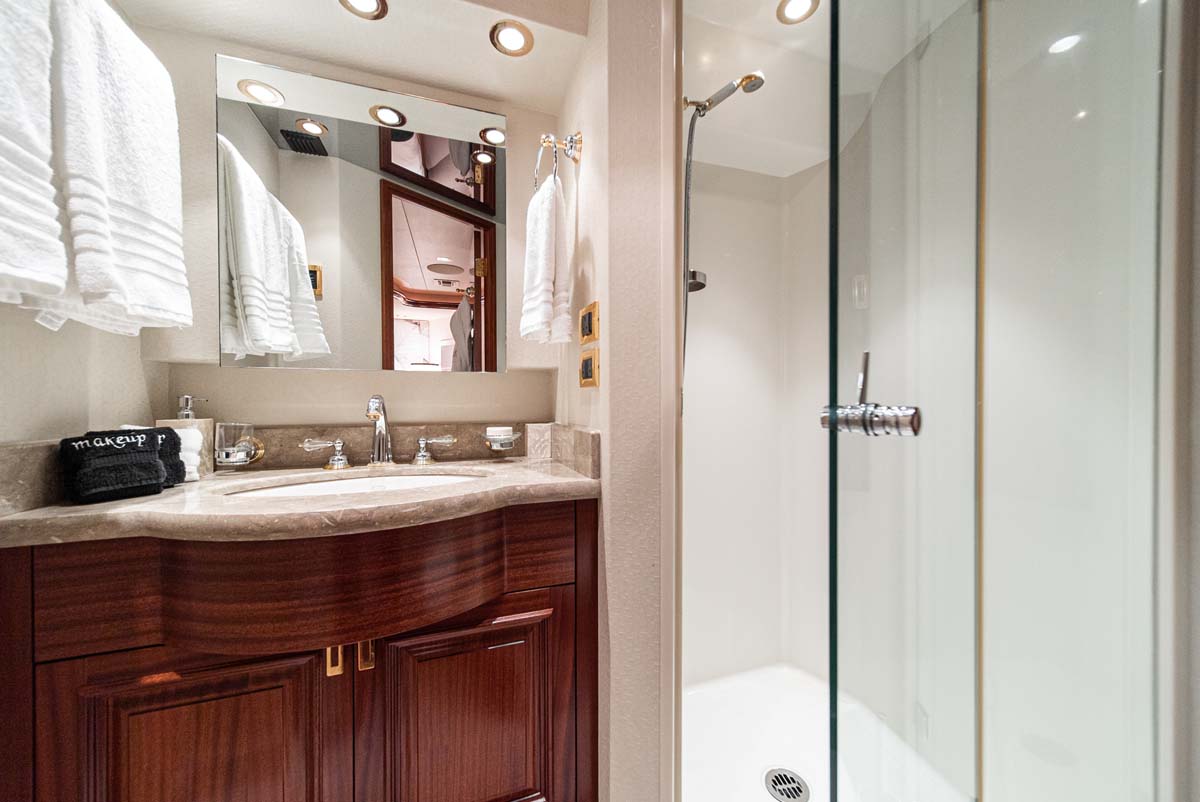Her four-cabin layout sleeps up to eight guests in total comfort, featuring a full-beam master suite with a king bed and walk-in wardrobe, two queen cabins, and a forward VIP past the country kitchen. Each cabin includes its own en suite and entertainment system.