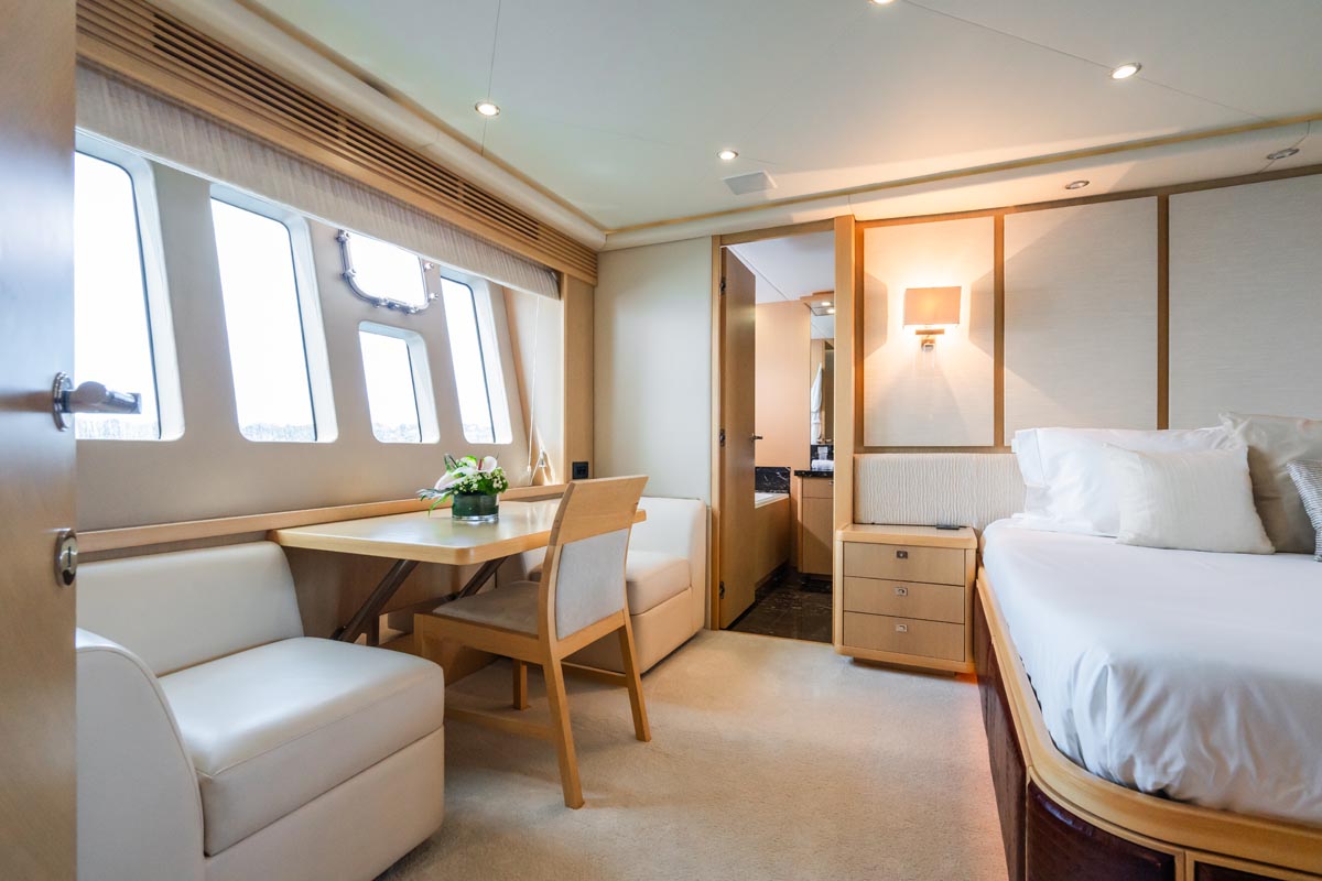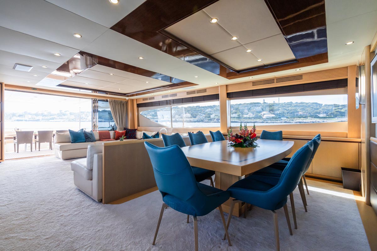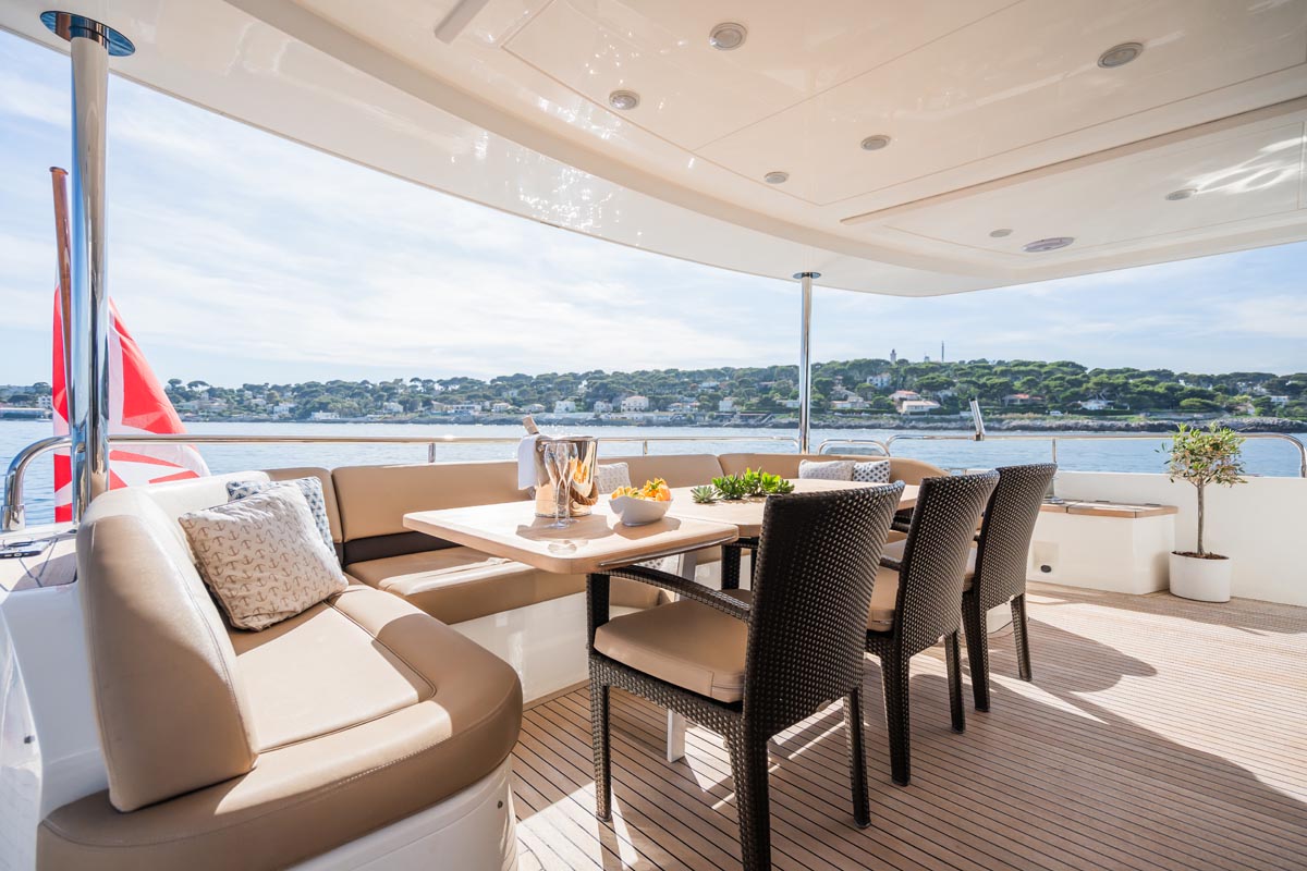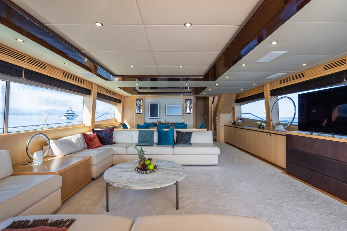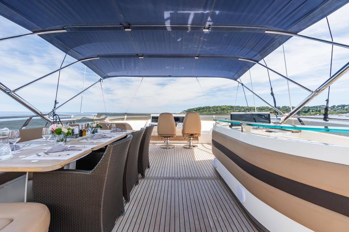 This yacht stands out for her spacious outdoor areas, including a large sundeck with loungers, a bar, and a shaded lounge area. The aft deck provides an inviting setting for relaxed lunches or dinners, while sunbeds at the bow offer the perfect spot to enjoy sunset cocktails with stunning views.