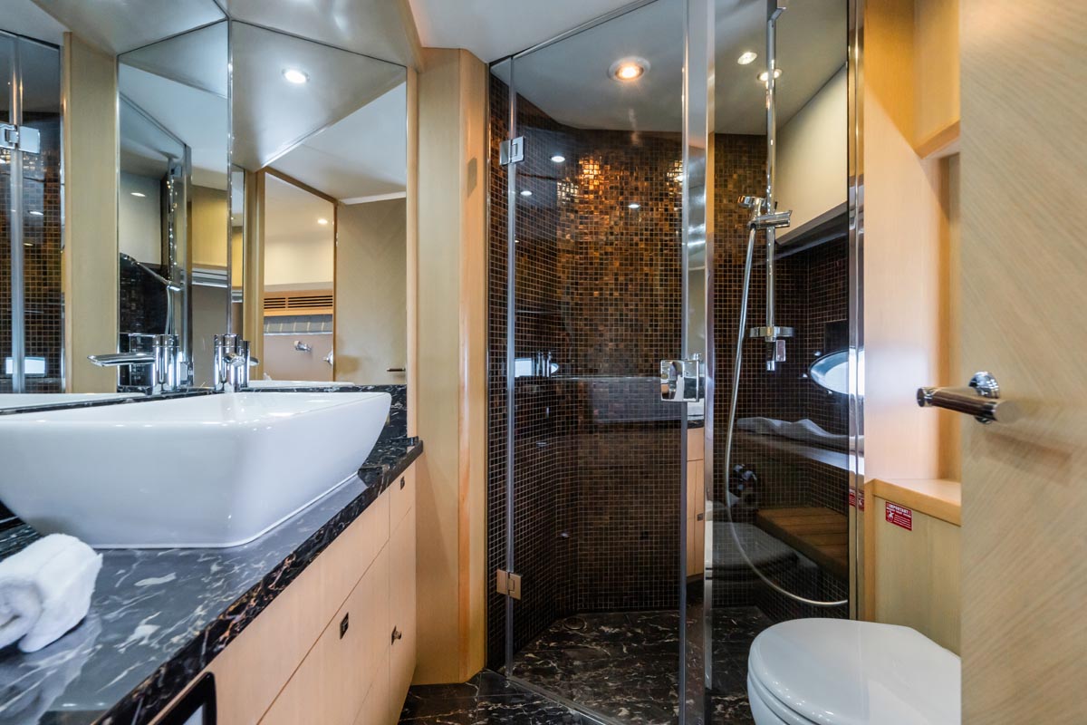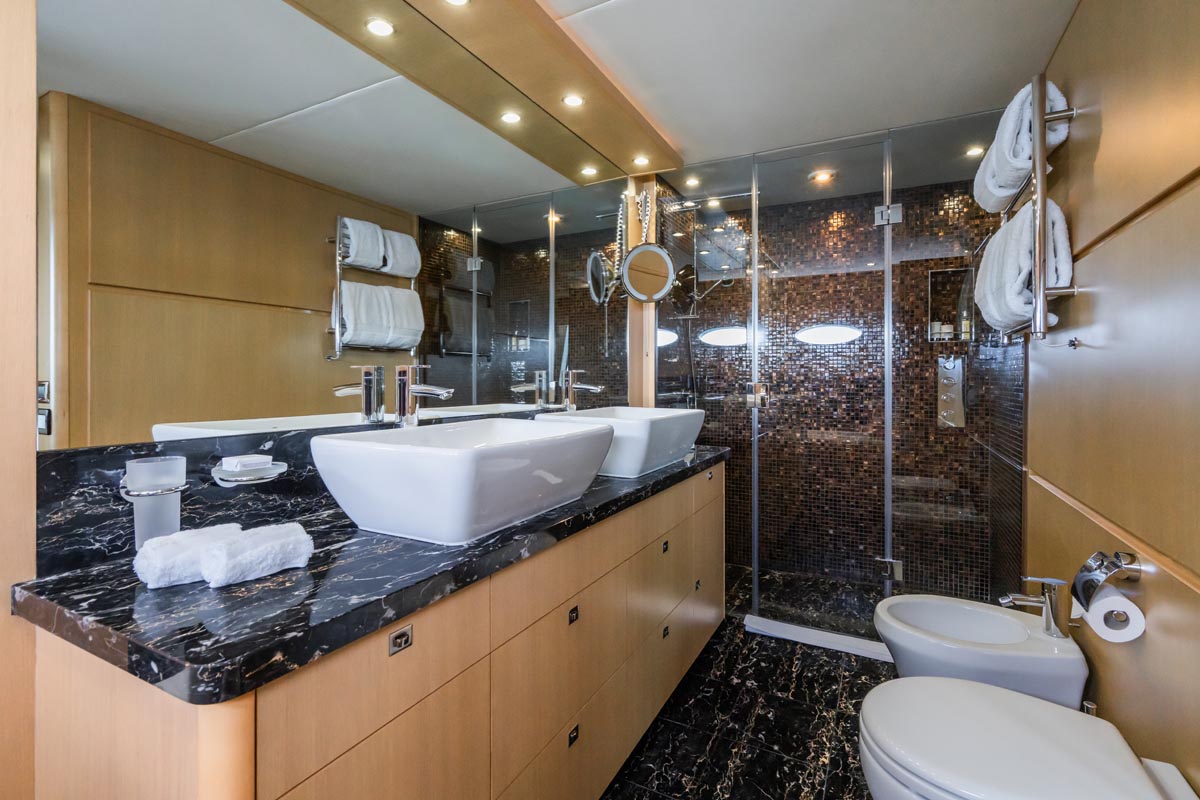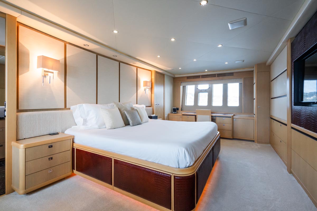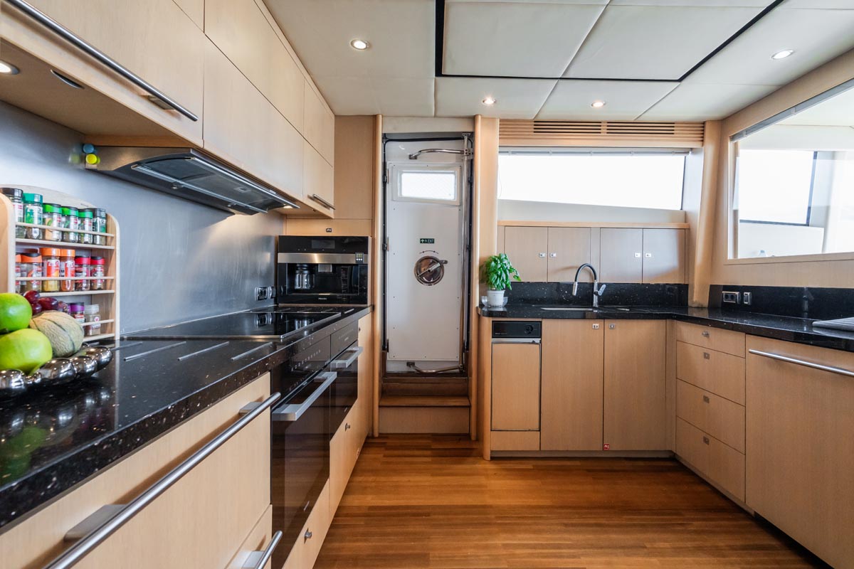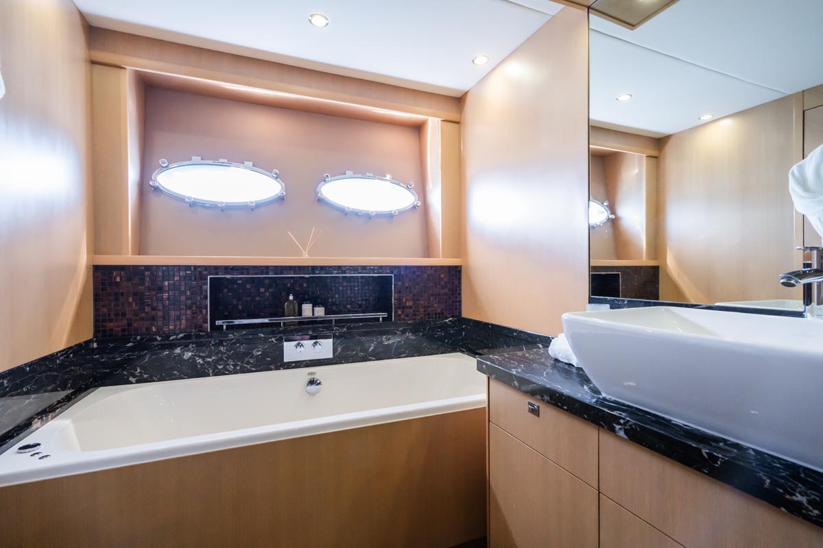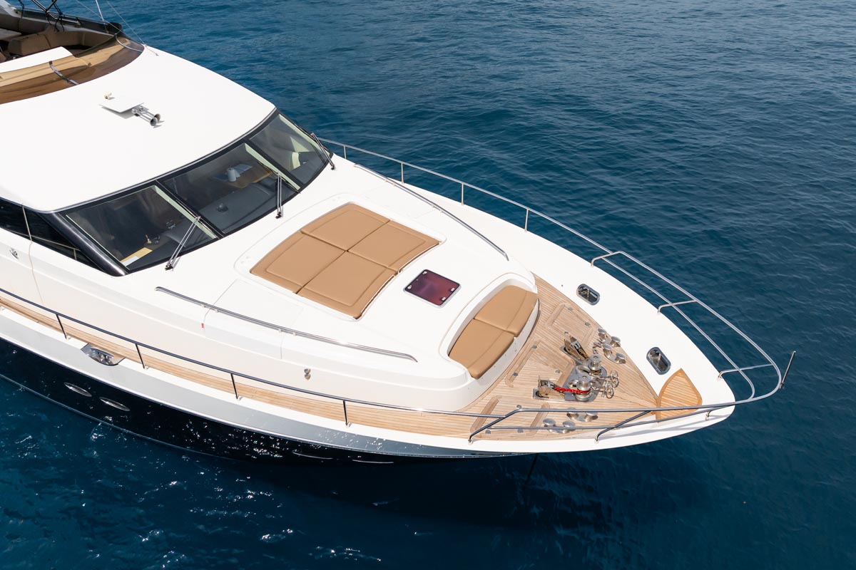 This yacht stands out for her spacious outdoor areas, including a large sundeck with loungers, a bar, and a shaded lounge area. The aft deck provides an inviting setting for relaxed lunches or dinners, while sunbeds at the bow offer the perfect spot to enjoy sunset cocktails with stunning views.