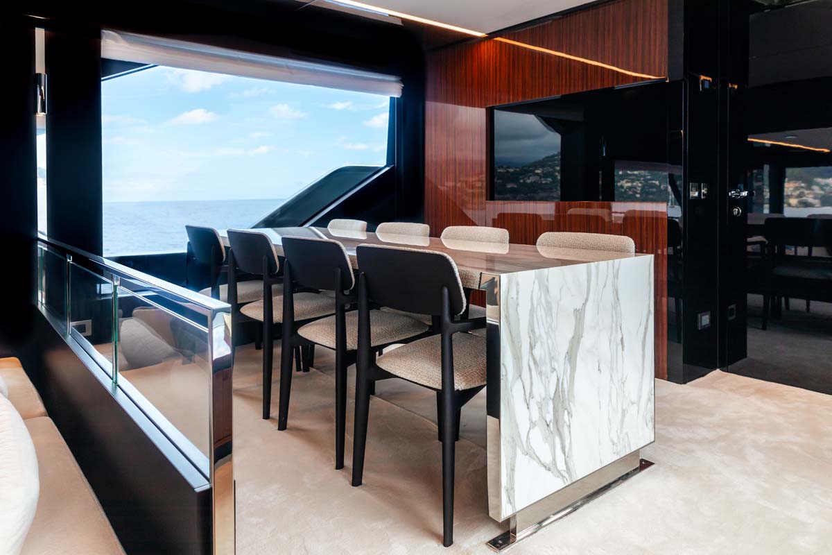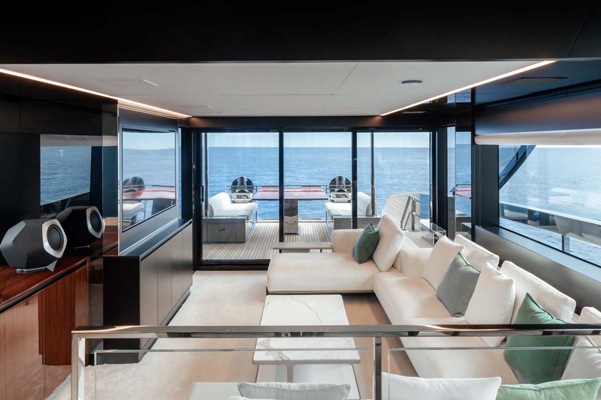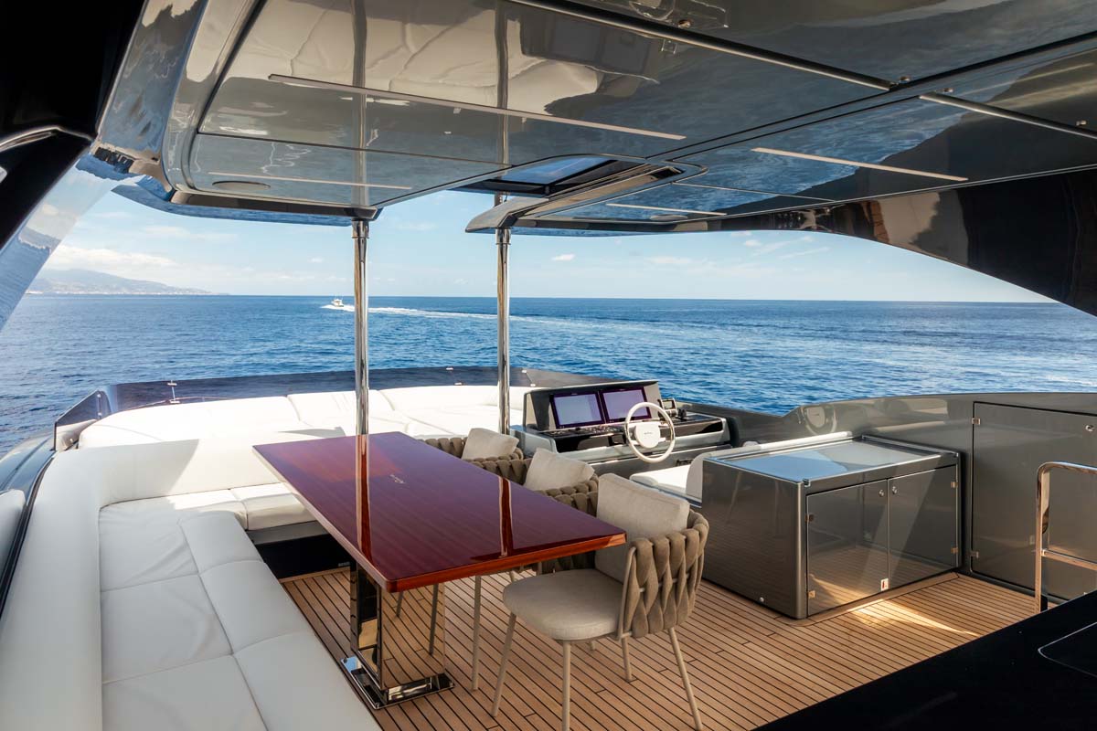 - Expansive 40m² flybridge with sunbathing, dining, bar & lounge areas
