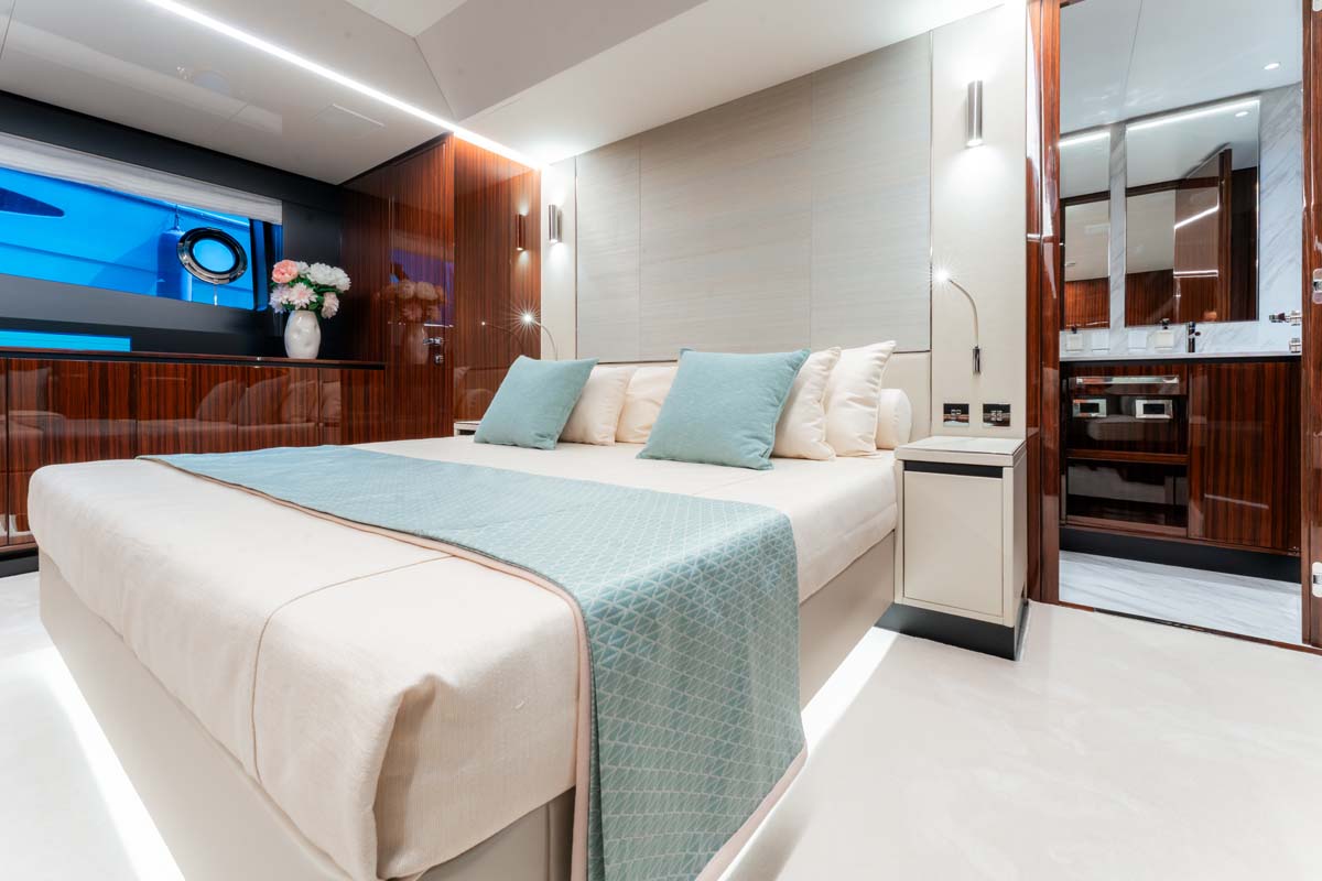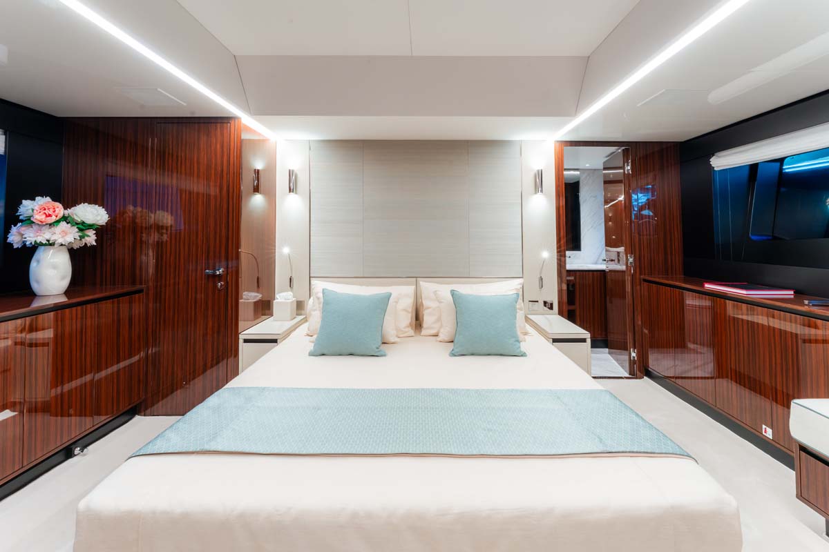 Her innovative beach club with 2 folding terraces brings you closer to the sea, while the huge flybridge is made for sun-soaked days, sunset dinners, and unforgettable moments with friends and family. Inside, you’ll find chic, contemporary interiors and 4 stunning en-suite cabins for up to 8 guests.