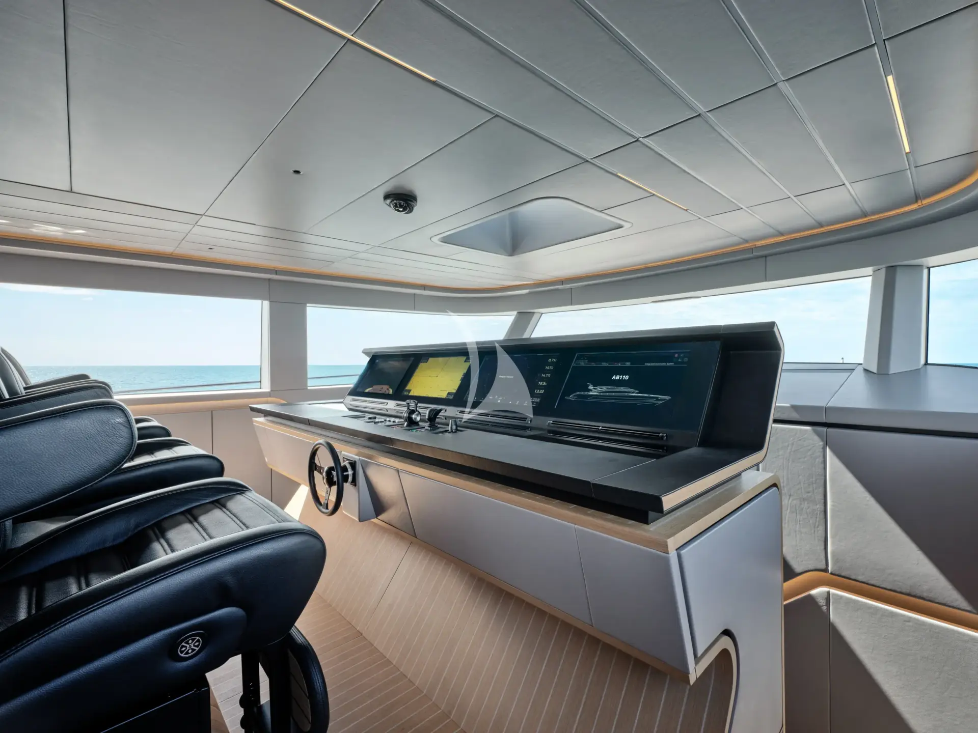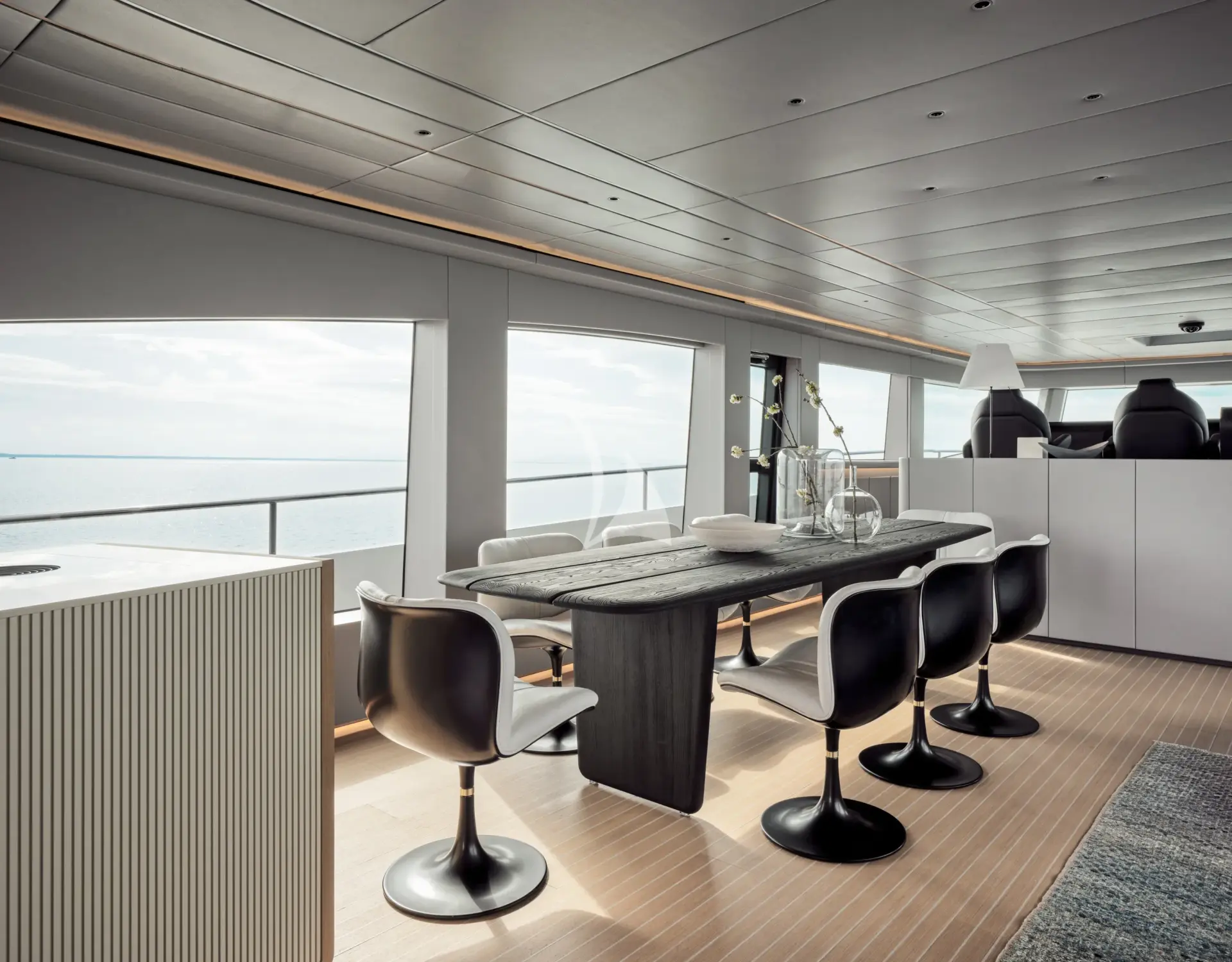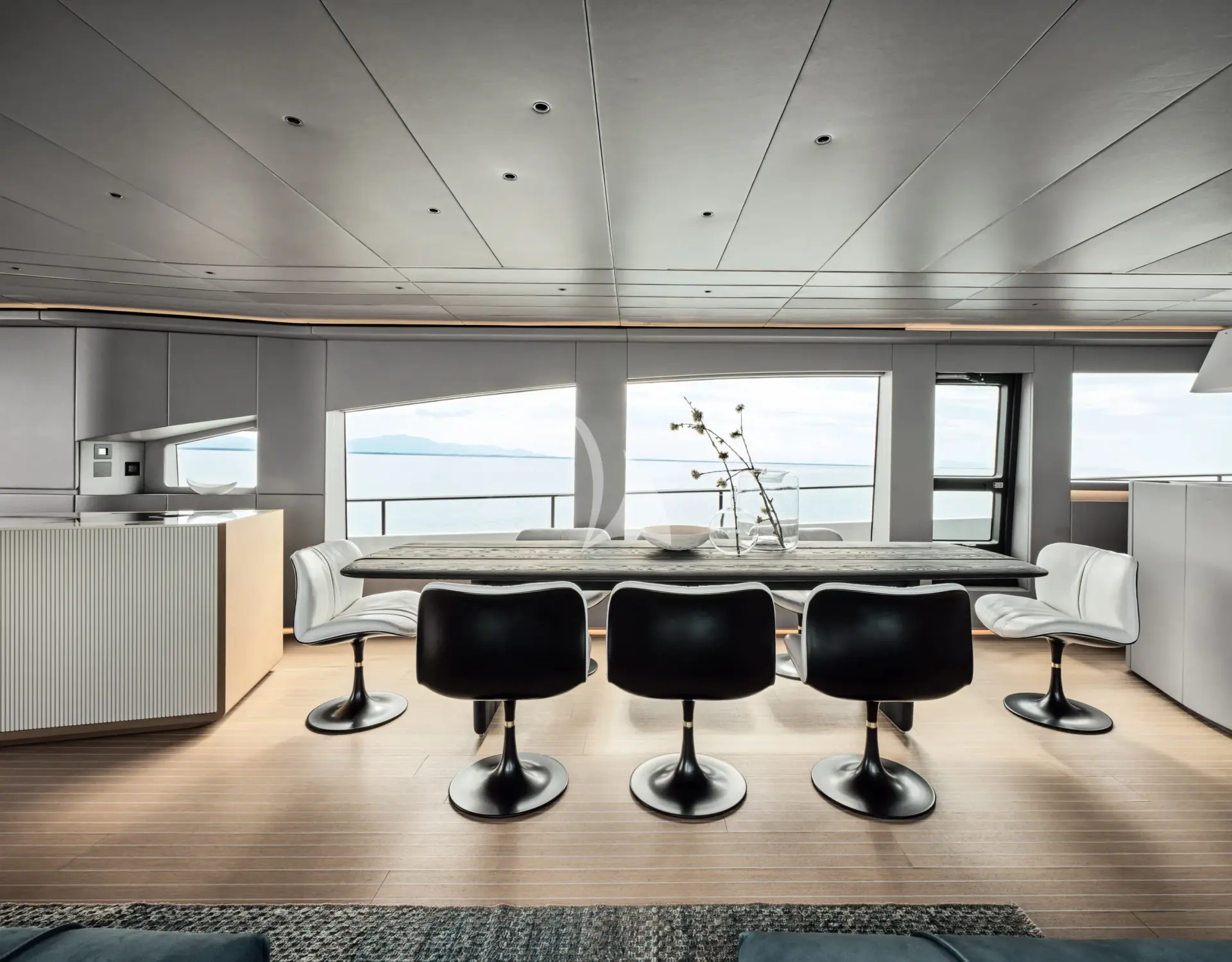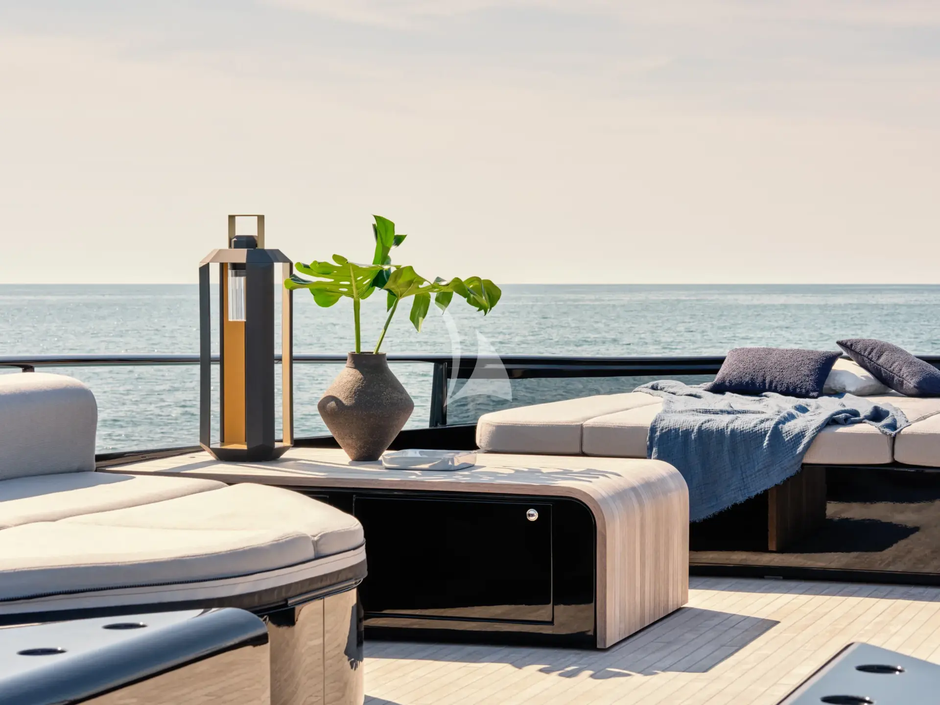 Outside, uninterrupted 360-degree views wrap around the yacht. Sun pads and lounge seating spread across the fly deck and forward bow, with sleek mesh sunshades supported by carbon poles that adjust to suit the moment – from sunrise coffees to shaded lunches.