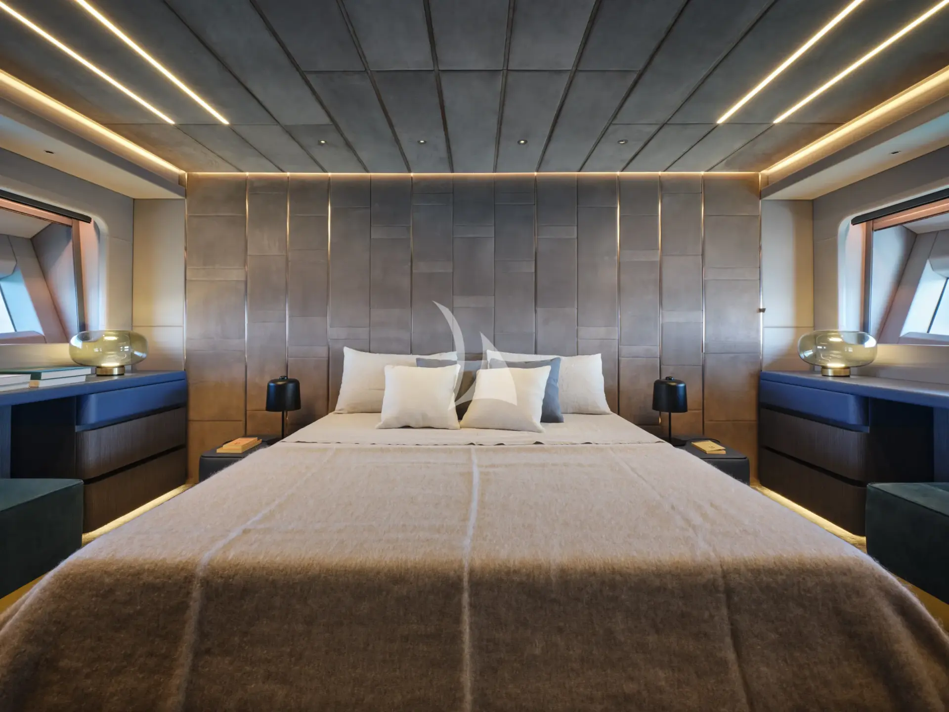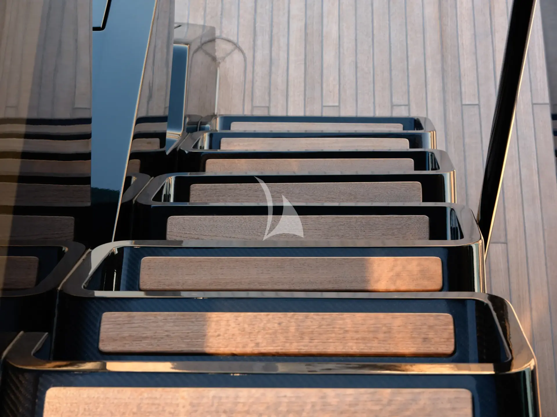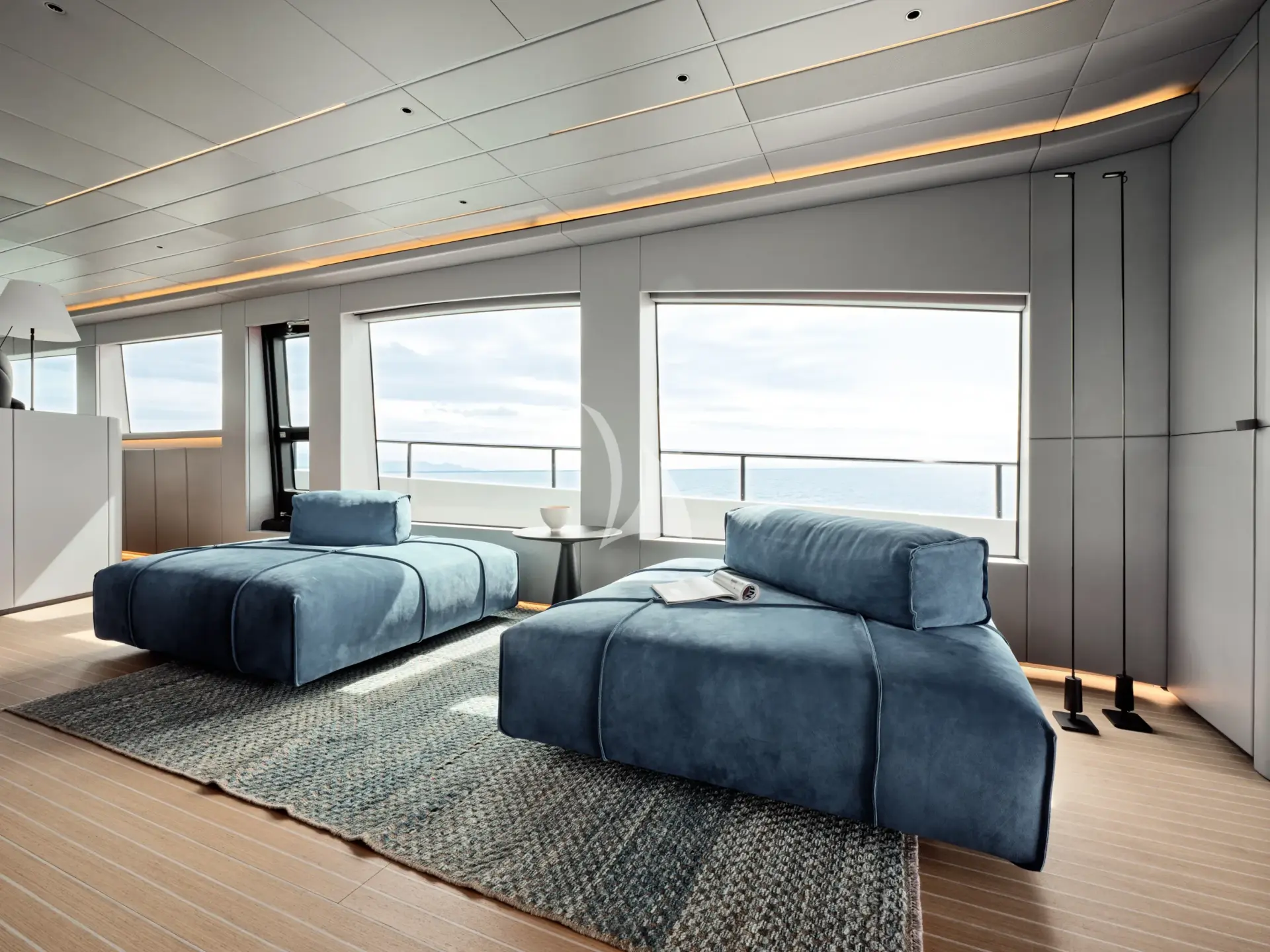 Step on board and feel the flow of a yacht designed as one seamless indoor-outdoor living space. Teak flooring runs from the aft deck into the light-filled lounge, where full-height windows slide open to create a semi-al fresco social hub. Neutral tones with ocean-blue accents evoke calm coastal luxury, while the curved, ribbed-panelled bar becomes the natural gathering point for cocktails and conversation.