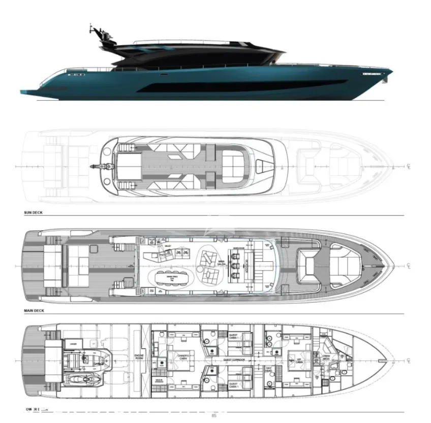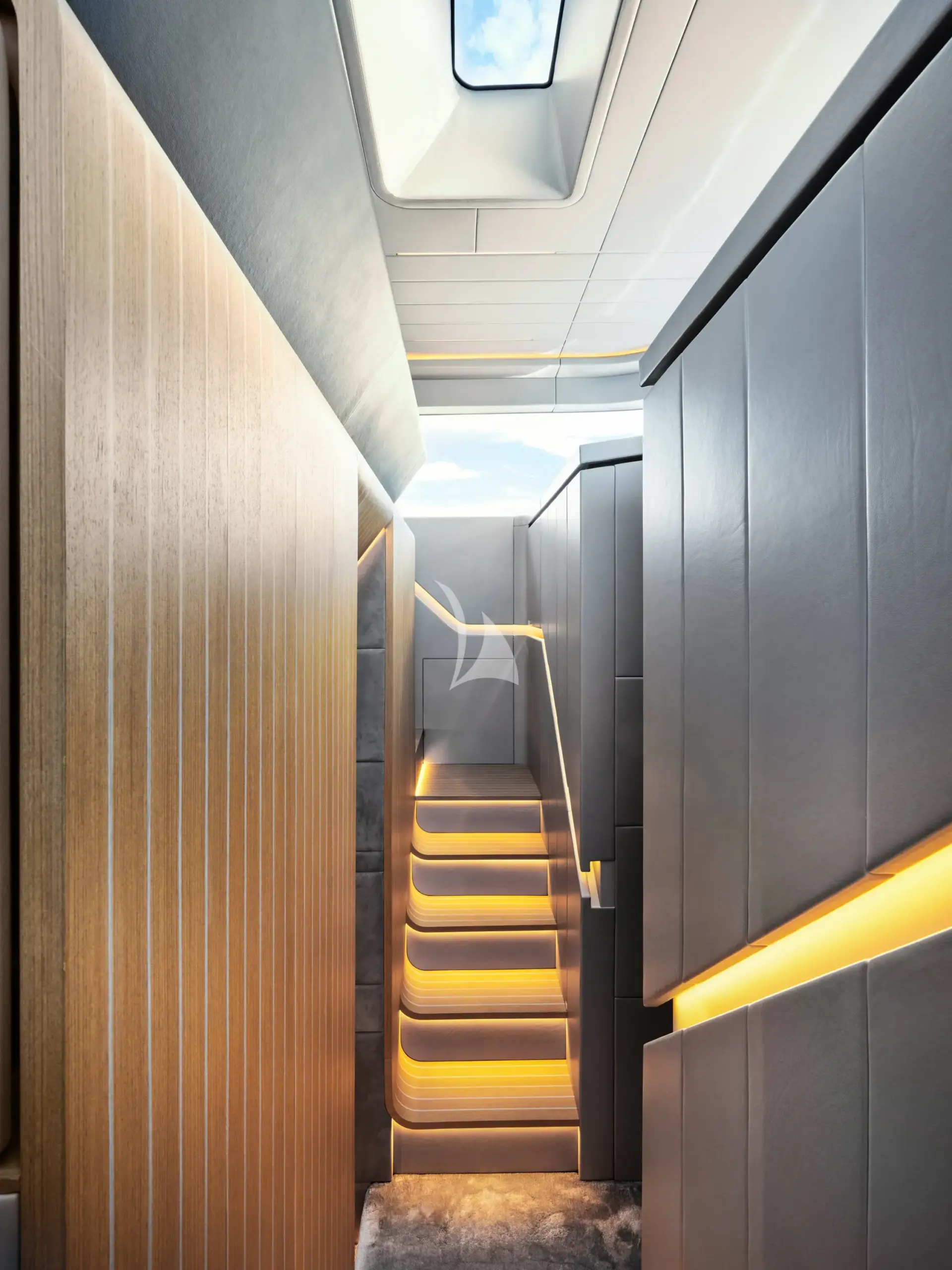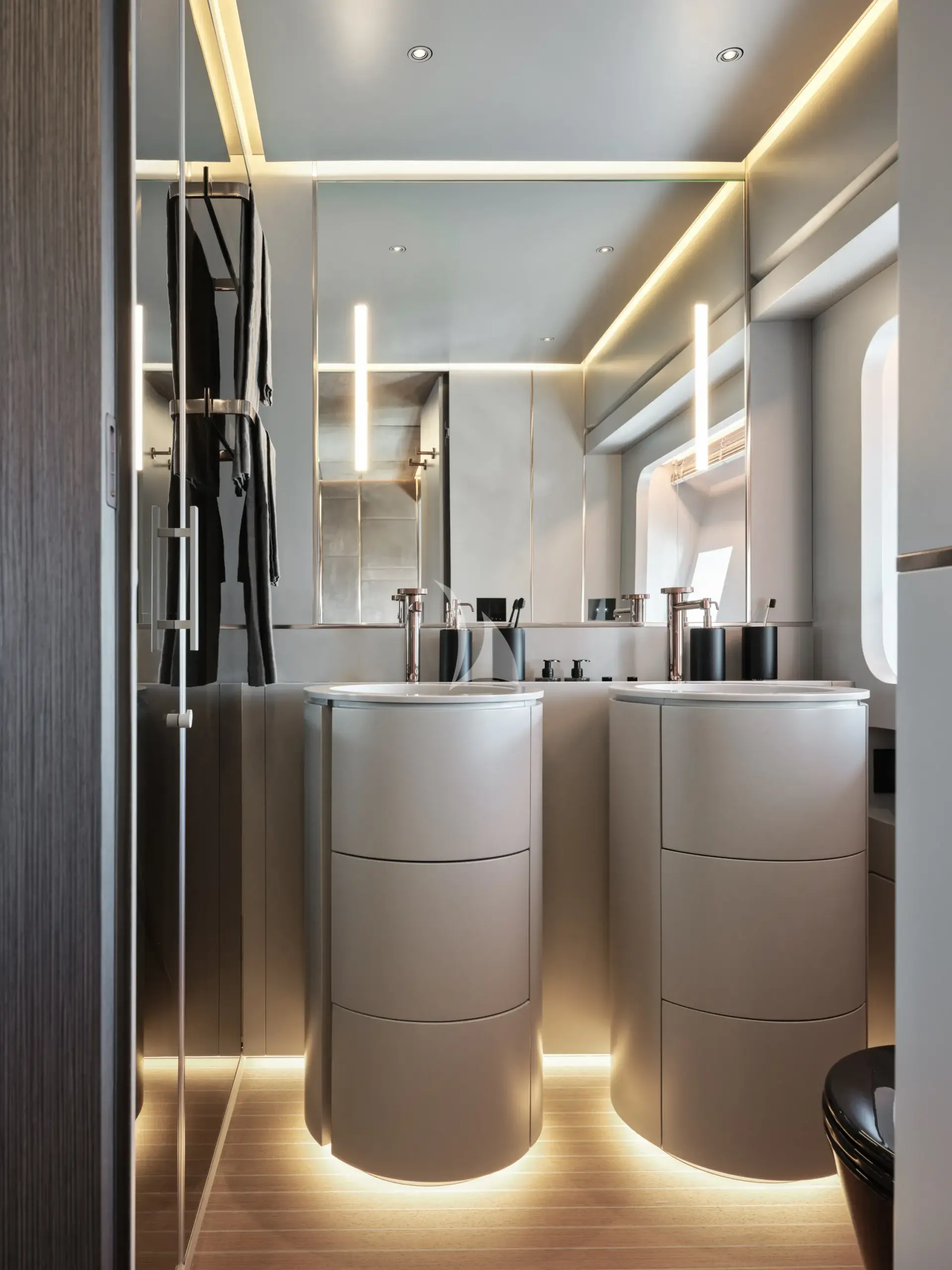 Step on board and feel the flow of a yacht designed as one seamless indoor-outdoor living space. Teak flooring runs from the aft deck into the light-filled lounge, where full-height windows slide open to create a semi-al fresco social hub. Neutral tones with ocean-blue accents evoke calm coastal luxury, while the curved, ribbed-panelled bar becomes the natural gathering point for cocktails and conversation.