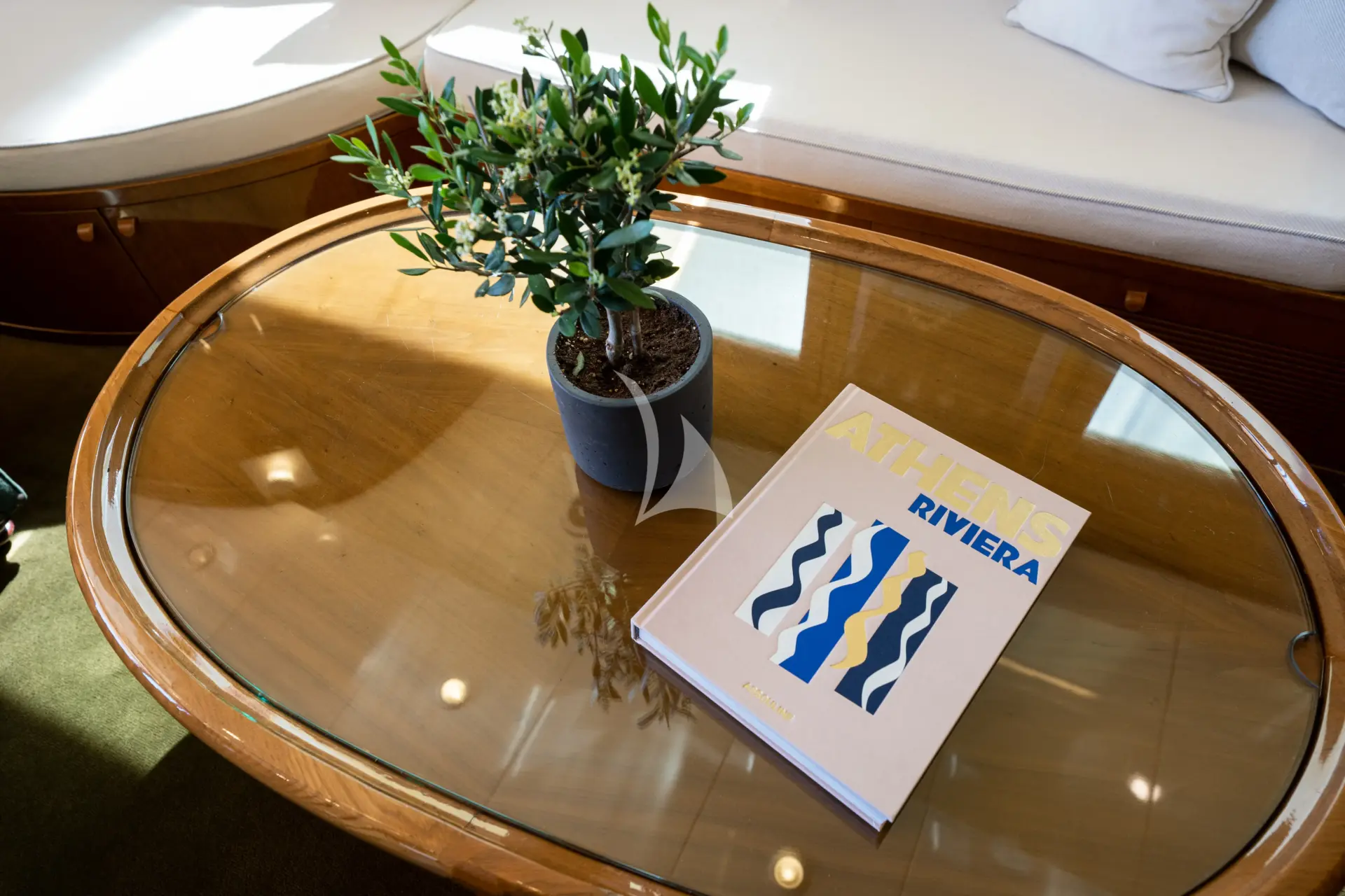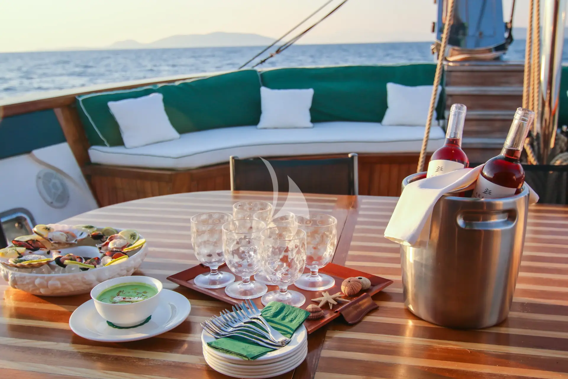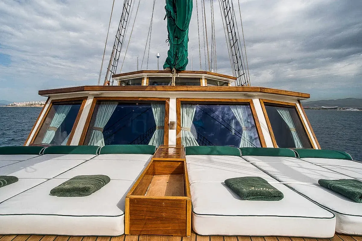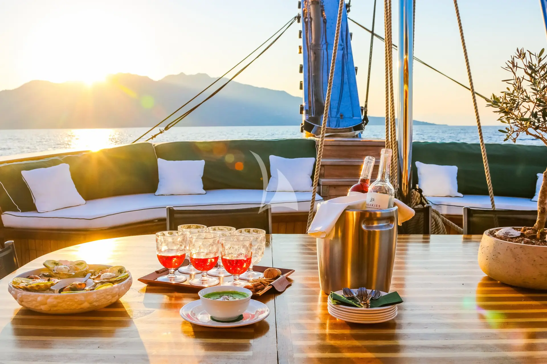 The spacious aft deck is ideal for lounging, dining, and relaxing in privacy, while the fore deck offers sunbeds and uninterrupted sea views. Inside, the inviting salon includes plush seating, a writing desk, and a bar lounge. A light interior refresh for 2026 maintains her timeless yet contemporary feel.