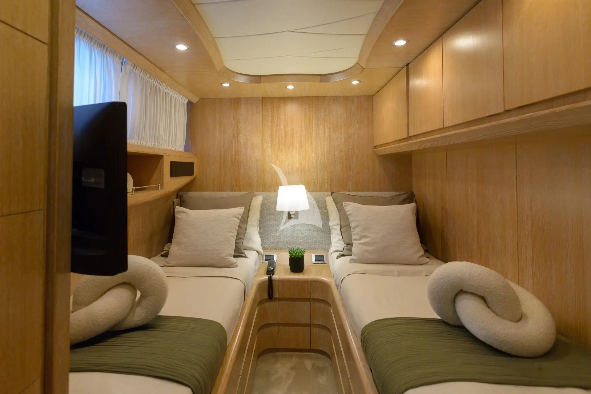 Below deck, Cookie accommodates up to 8 guests in 4 spacious cabins: a Master Suite (full beam) with queen-size bed, walk-in closet, vanity desk & safe, a VIP Cabin with queen-size bed, two Twin Cabins, one with an additional Pullman bed. All cabins feature marble en suite bathrooms, offering comfort and privacy.