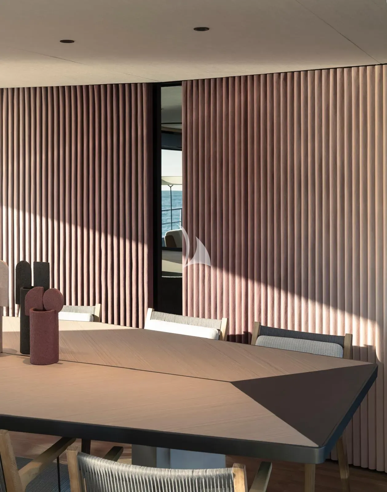 The impressively sized skylounge is a true “blank canvas” for the owner. It’s configured as a cinematic lounge for relaxed evenings, or as the main indoor dining area with sweeping views over the sea. This layout solution liberates the forward portion of the main deck, which can be transformed into a more intimate, club-style area – the Gentleman’s Club – ideal for private conversations, reading or a quiet drink away from the social heart of the yacht.
