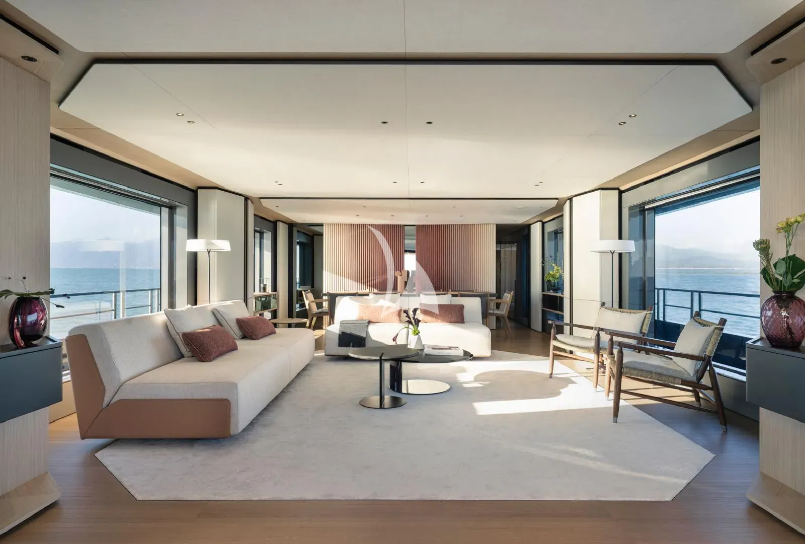 On the main deck, a circular seating island at the entrance immediately conveys the sense of space and openness that defines ILMA. The thoughtful arrangement of furniture preserves sightlines through the full-height windows, offering uninterrupted sea views. Separate guest and crew pathways ensure privacy and efficiency, while the abundance of natural light floods the salon, revealing refined design details and imbuing the ambience with energy and warmth.