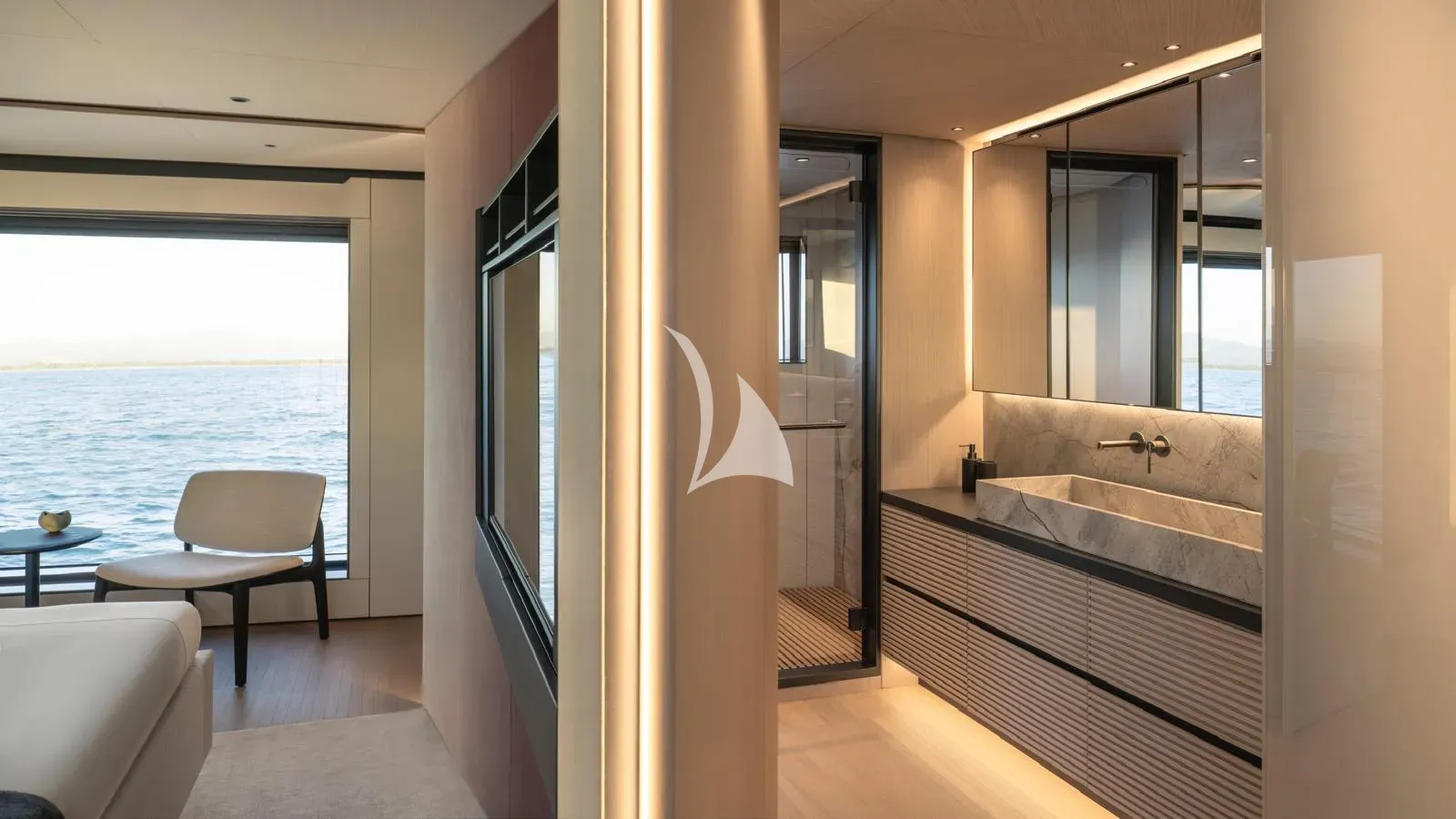 The full-beam owner’s suite is conceived as a sanctum of light and calm. A centrally positioned king-size bed allows unencumbered circulation around the cabin, while the surrounding furnishings are arranged to maximize comfort and views. A dedicated vanity or desk area enjoys sweeping vistas over the water, creating the perfect spot to begin or end the day in complete tranquility.