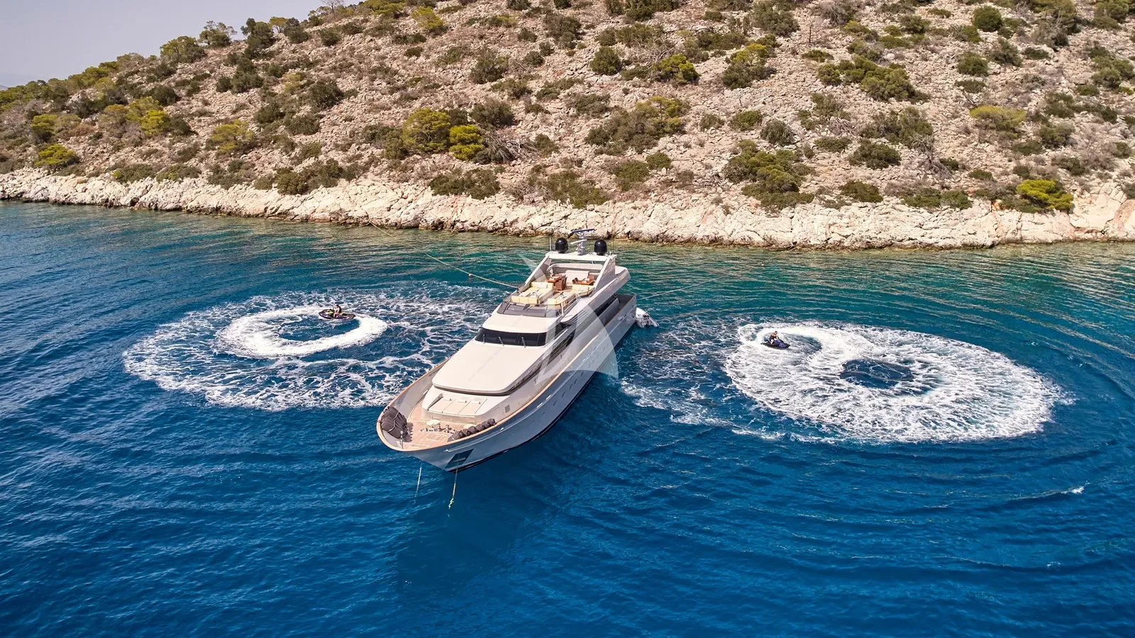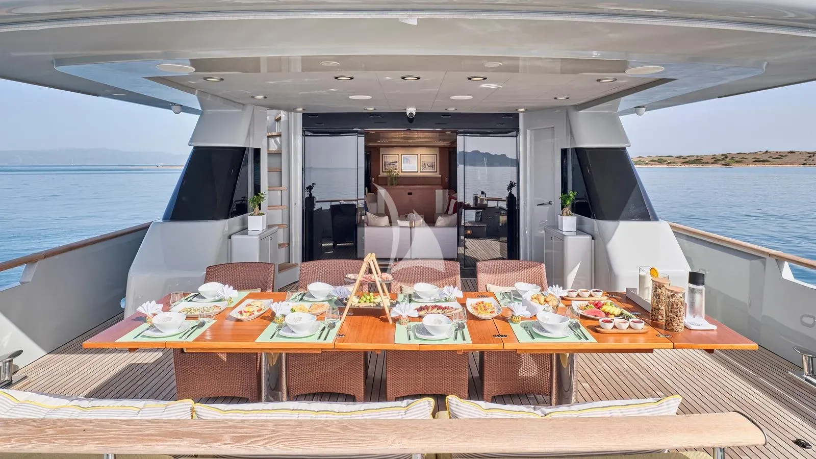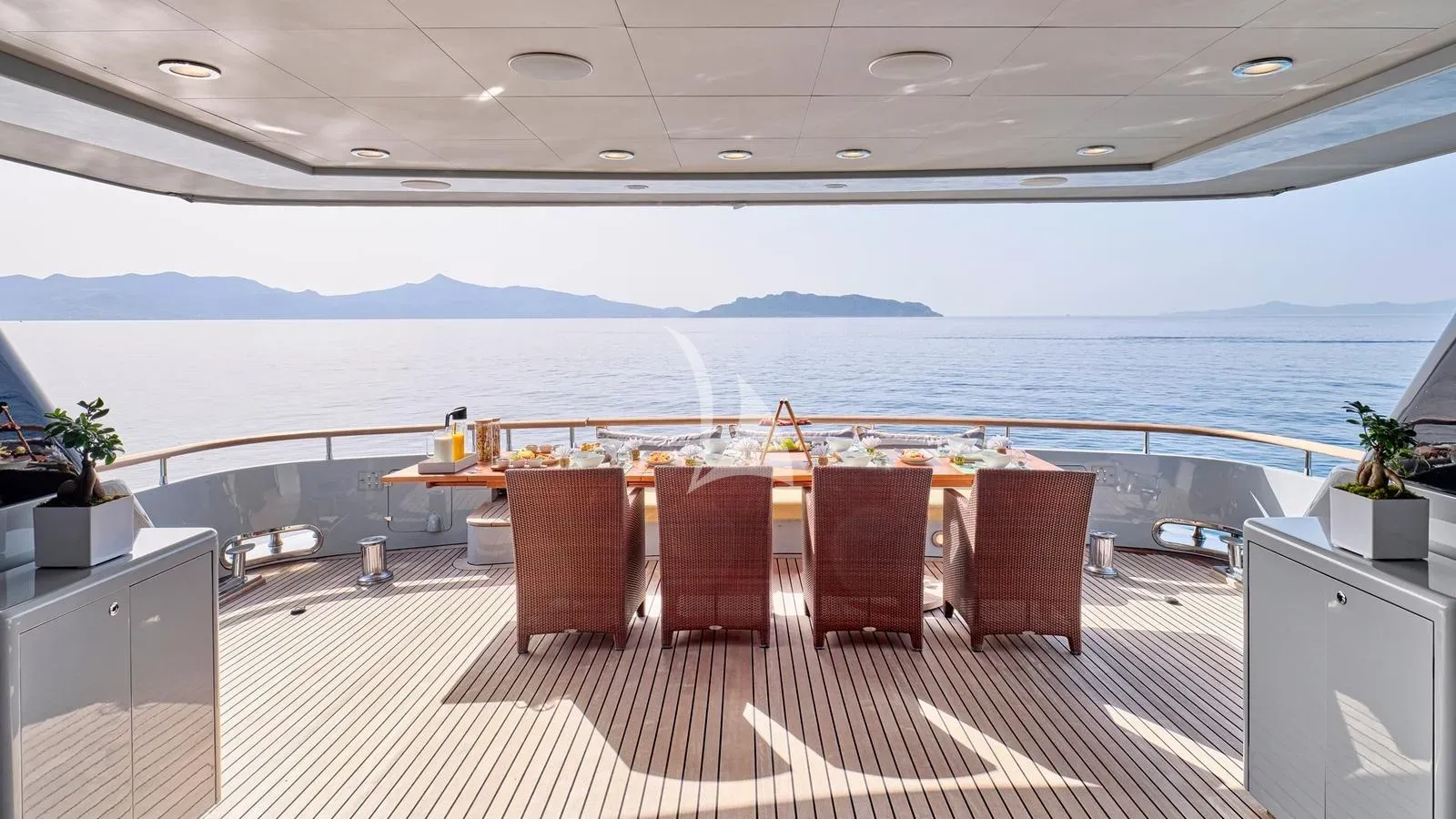 Outdoors, the yacht boasts a spacious sundeck, featuring a BBQ and dining area that can comfortably host up to 16 guests under the shade. A highlight of the sundeck is the impressive 65' outdoor home cinema, perfect for movie nights under the stars. Additionally, the beach club offers a wide variety of water toys, providing endless fun and adventure on the water.