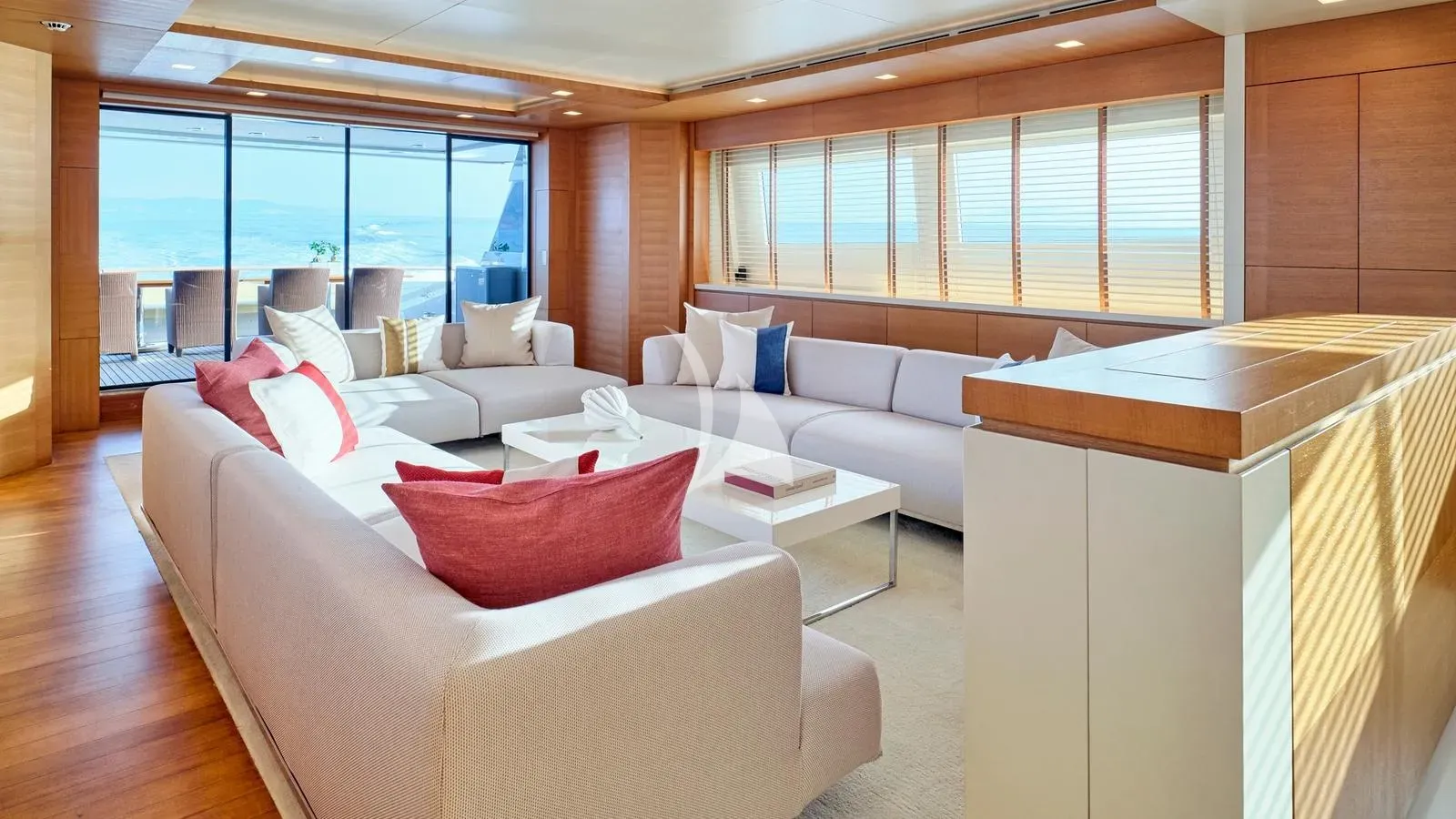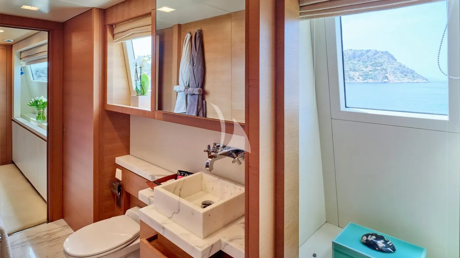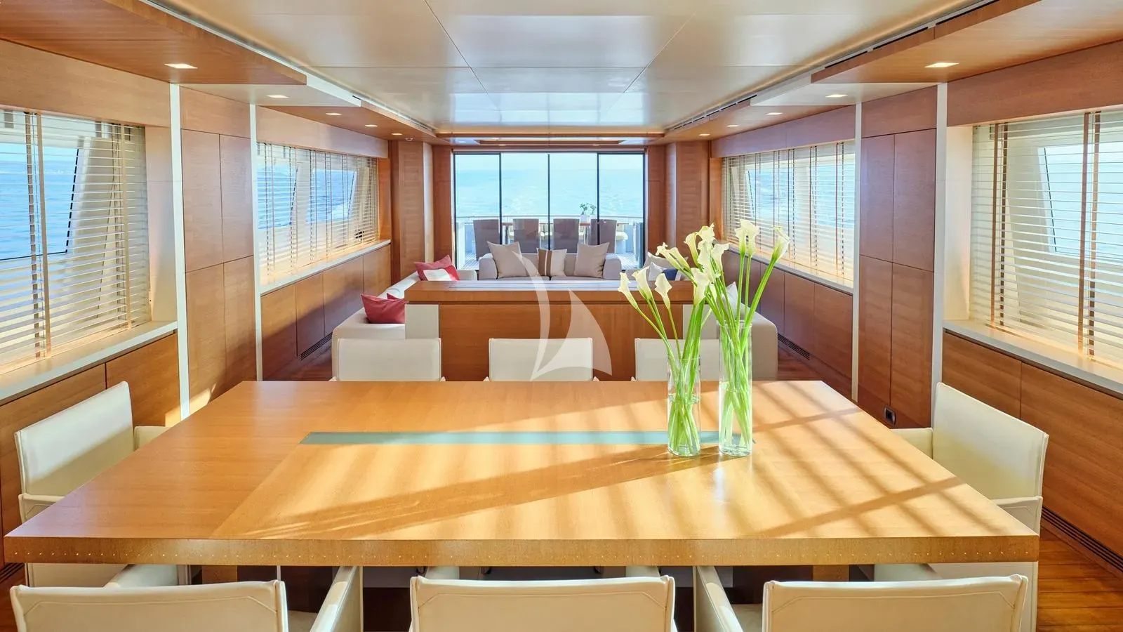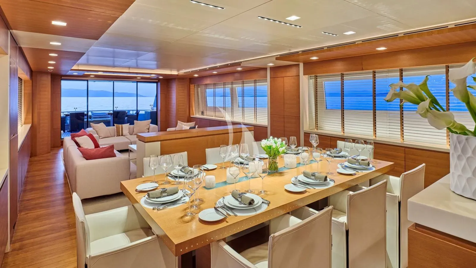 Outdoors, the yacht boasts a spacious sundeck, featuring a BBQ and dining area that can comfortably host up to 16 guests under the shade. A highlight of the sundeck is the impressive 65' outdoor home cinema, perfect for movie nights under the stars. Additionally, the beach club offers a wide variety of water toys, providing endless fun and adventure on the water.