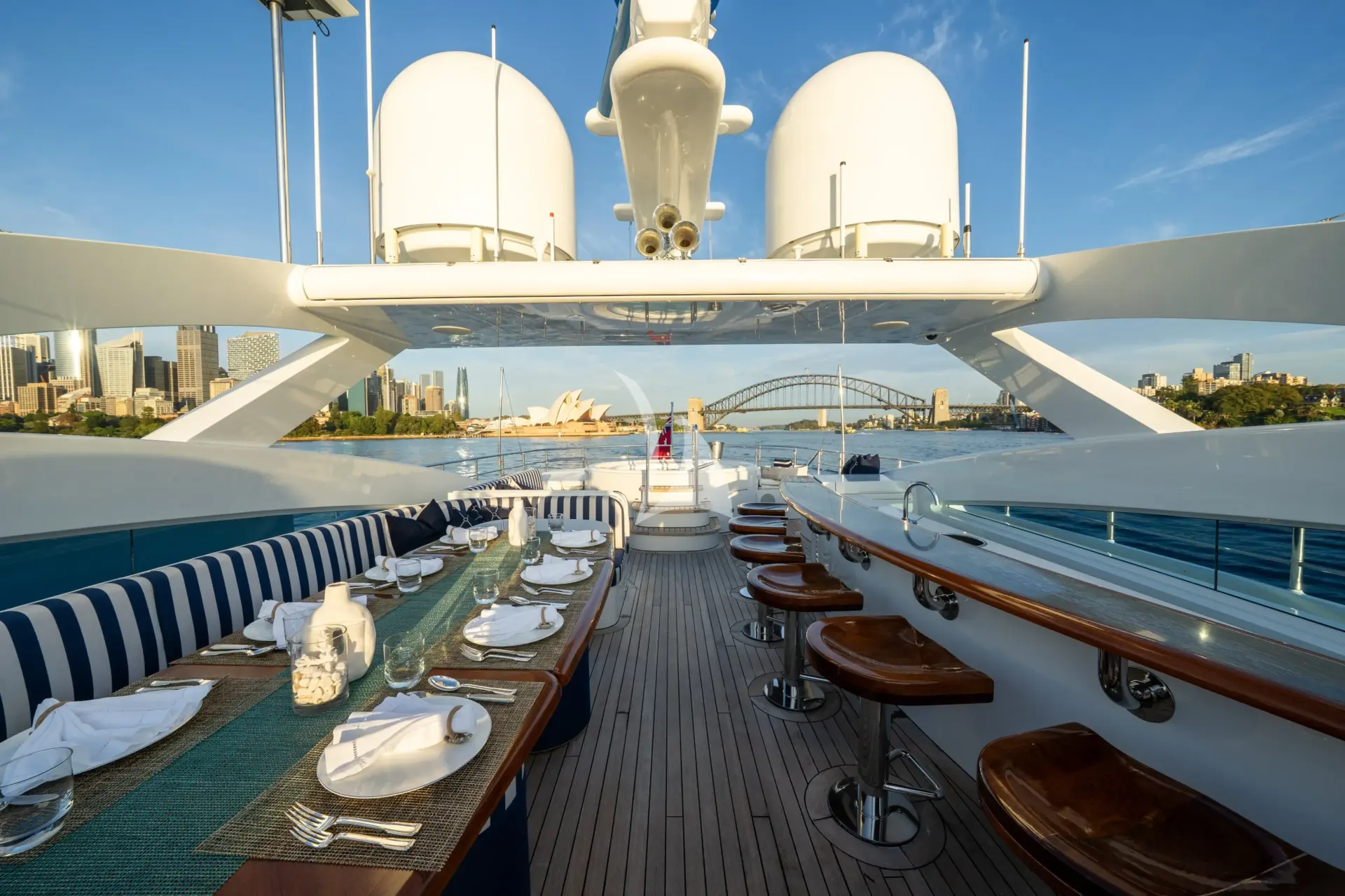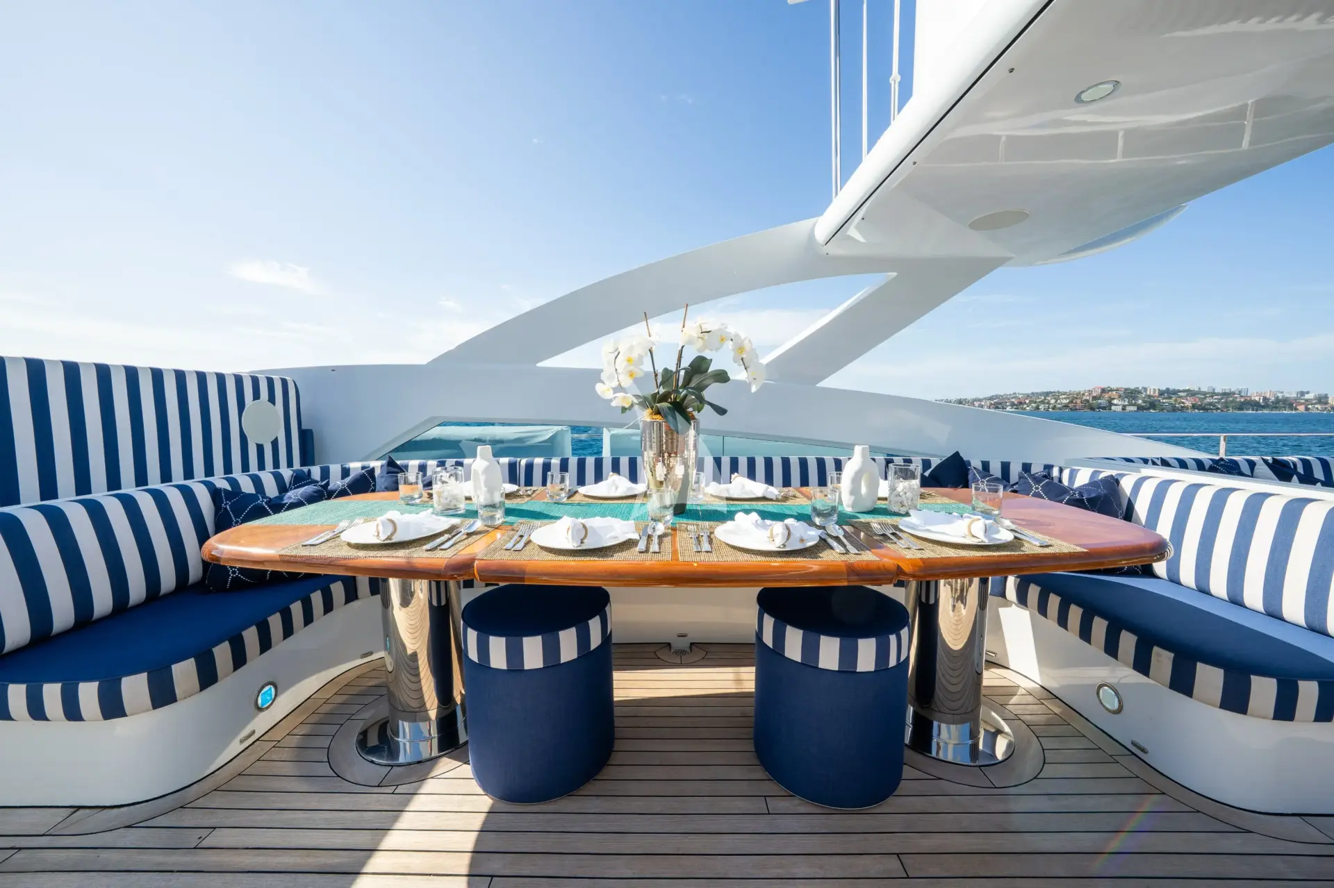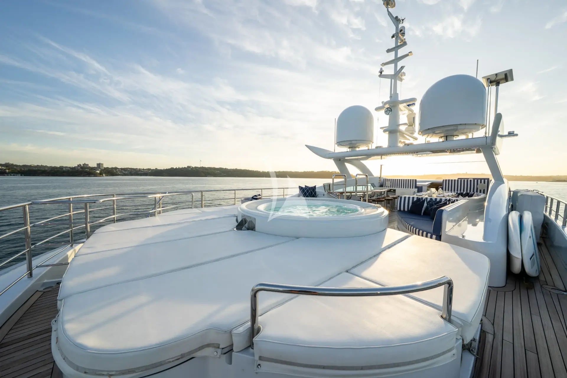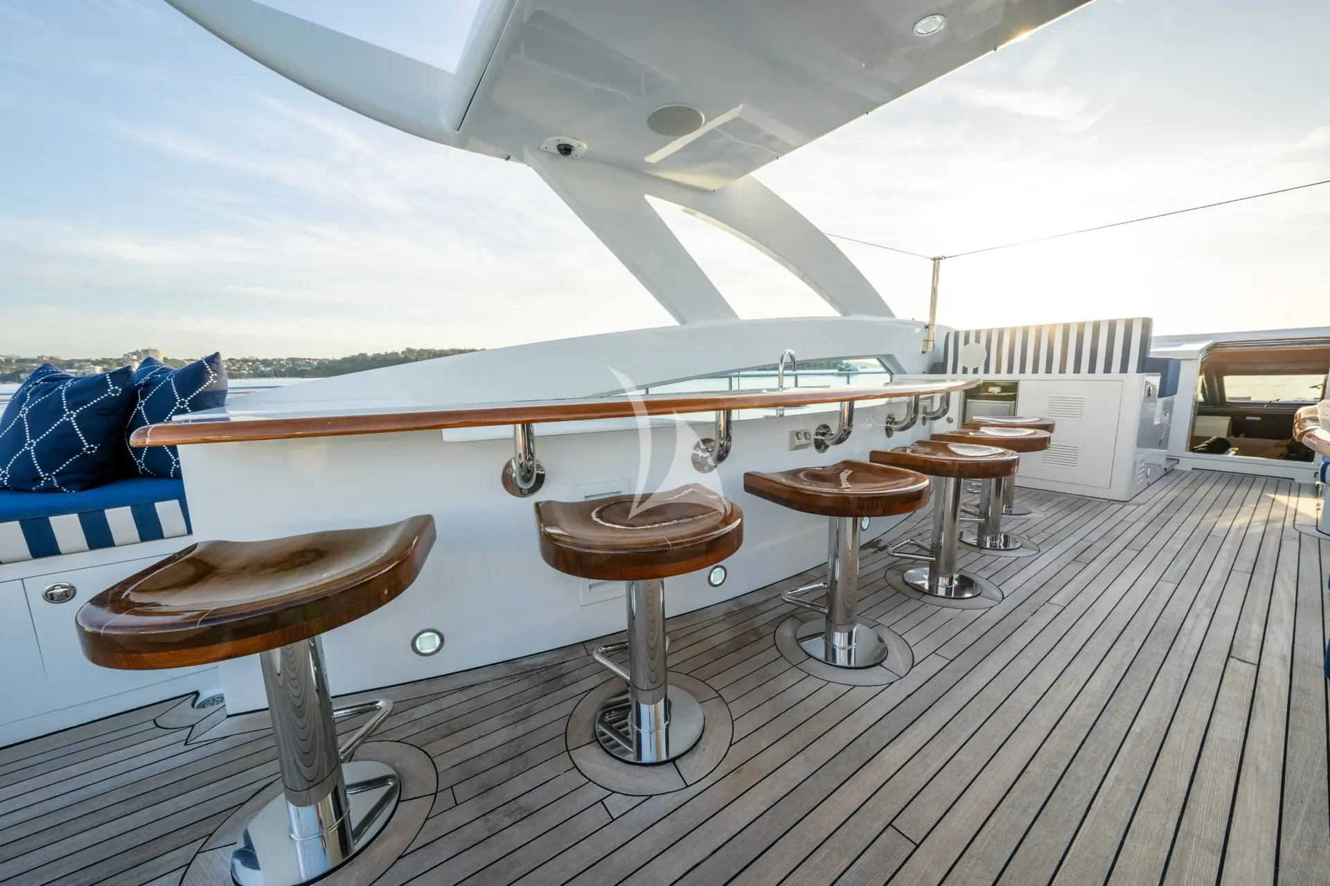 The expansive flybridge is a highlight, featuring a fully stocked bar and a Jacuzzi – the perfect spot to soak up panoramic ocean views with a drink in hand. Multiple lounging and dining areas provide plenty of space to socialise, sunbathe, or enjoy an alfresco meal prepared by the crew.
