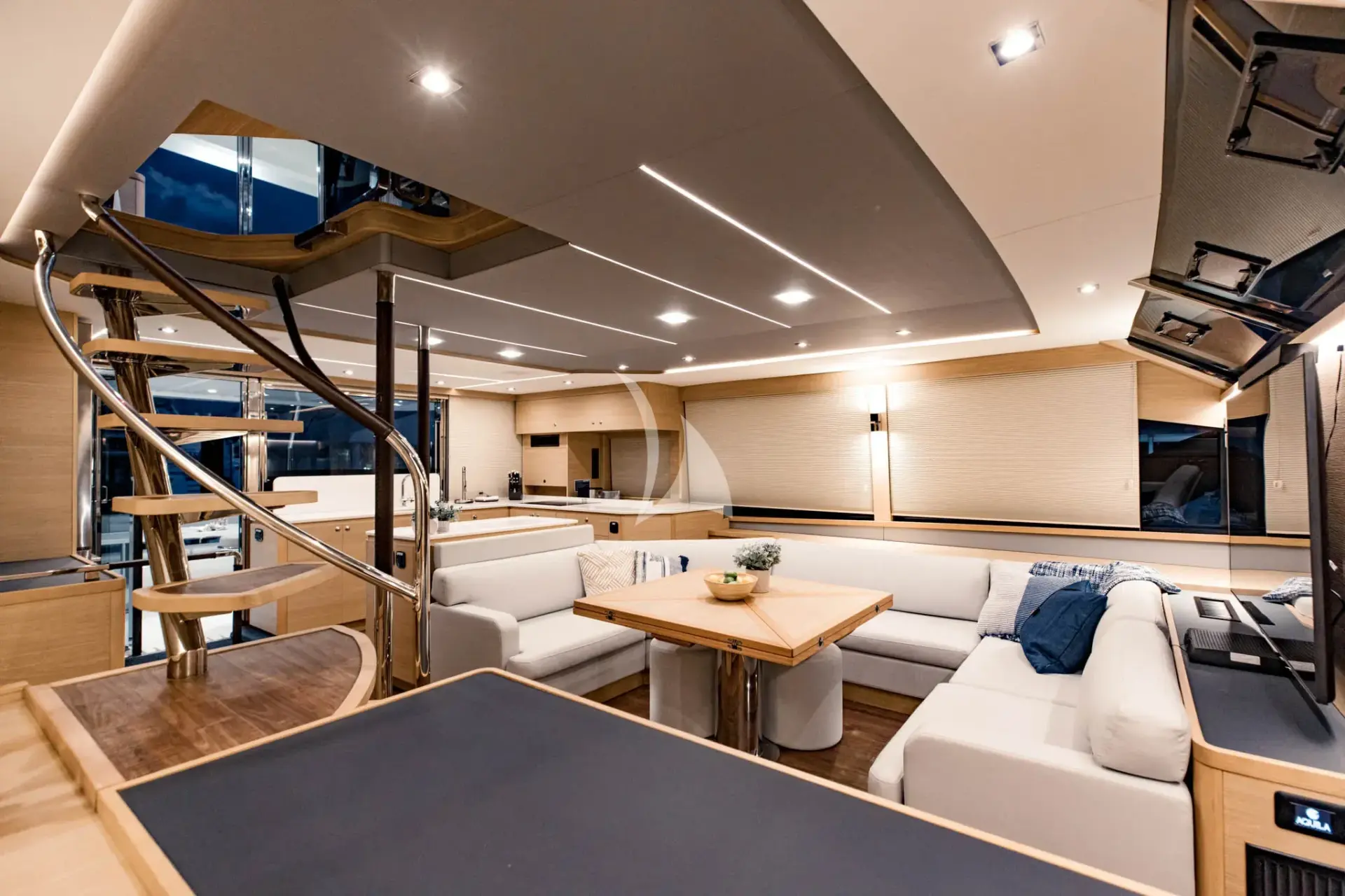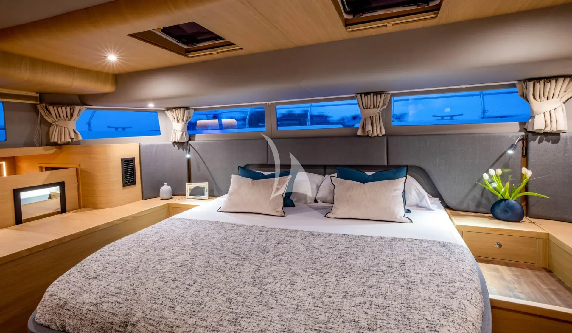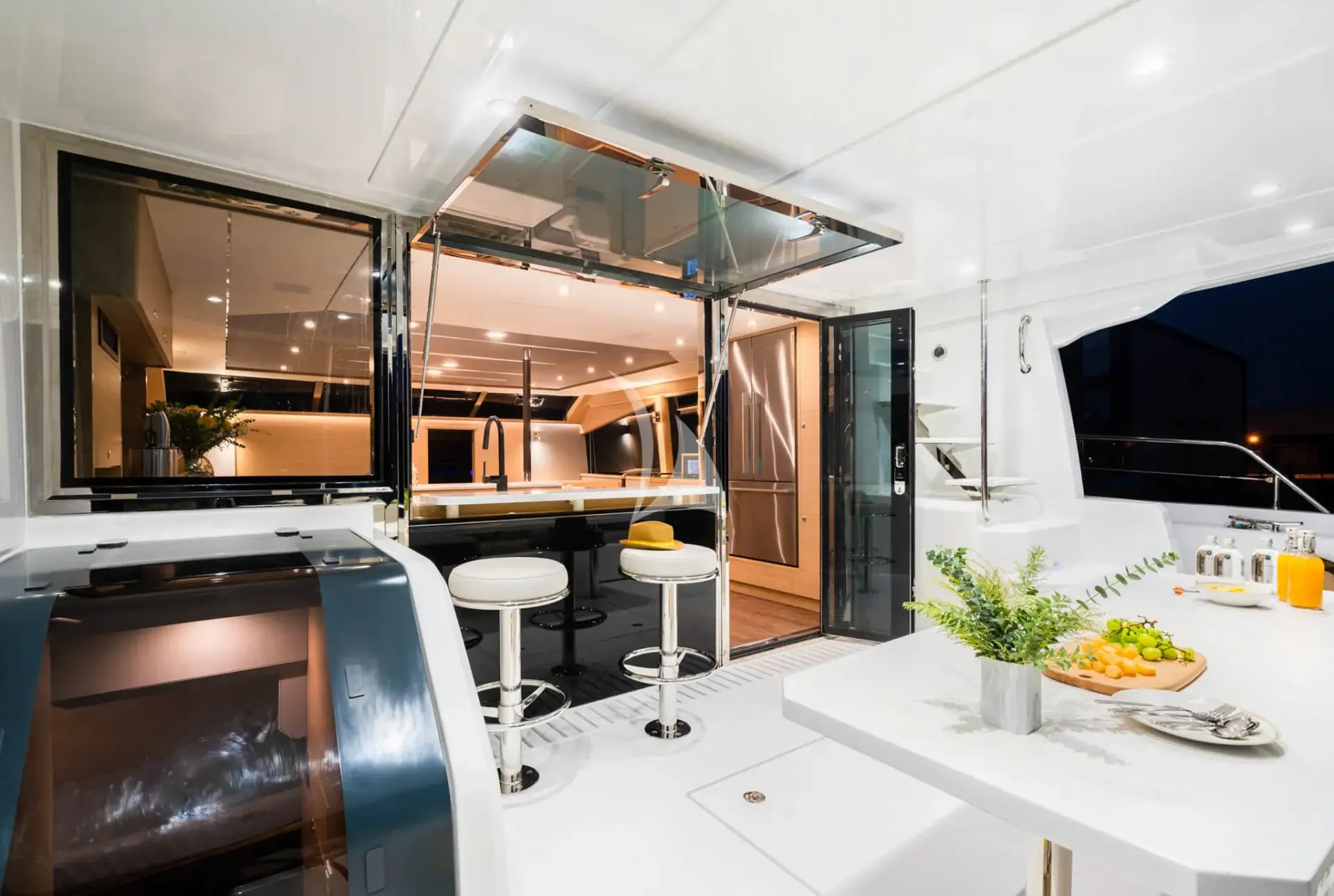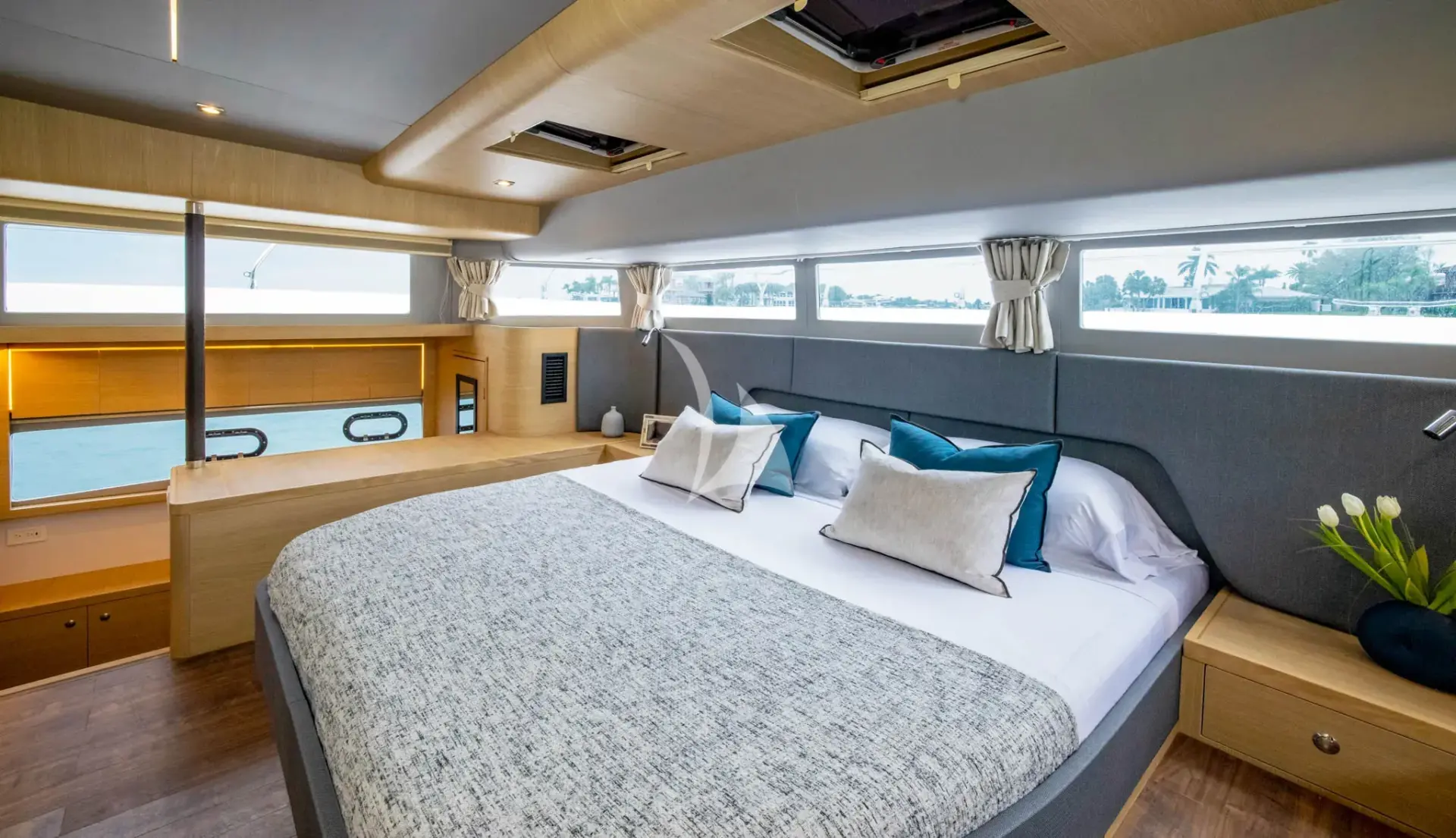 One of her standout features is the full-beam master suite, located on the main deck for outstanding accessibility. The ensuite and dressing areas sit privately within the catamaran’s hulls to either side, creating a spacious, beautifully considered retreat rarely found on a yacht of this size.