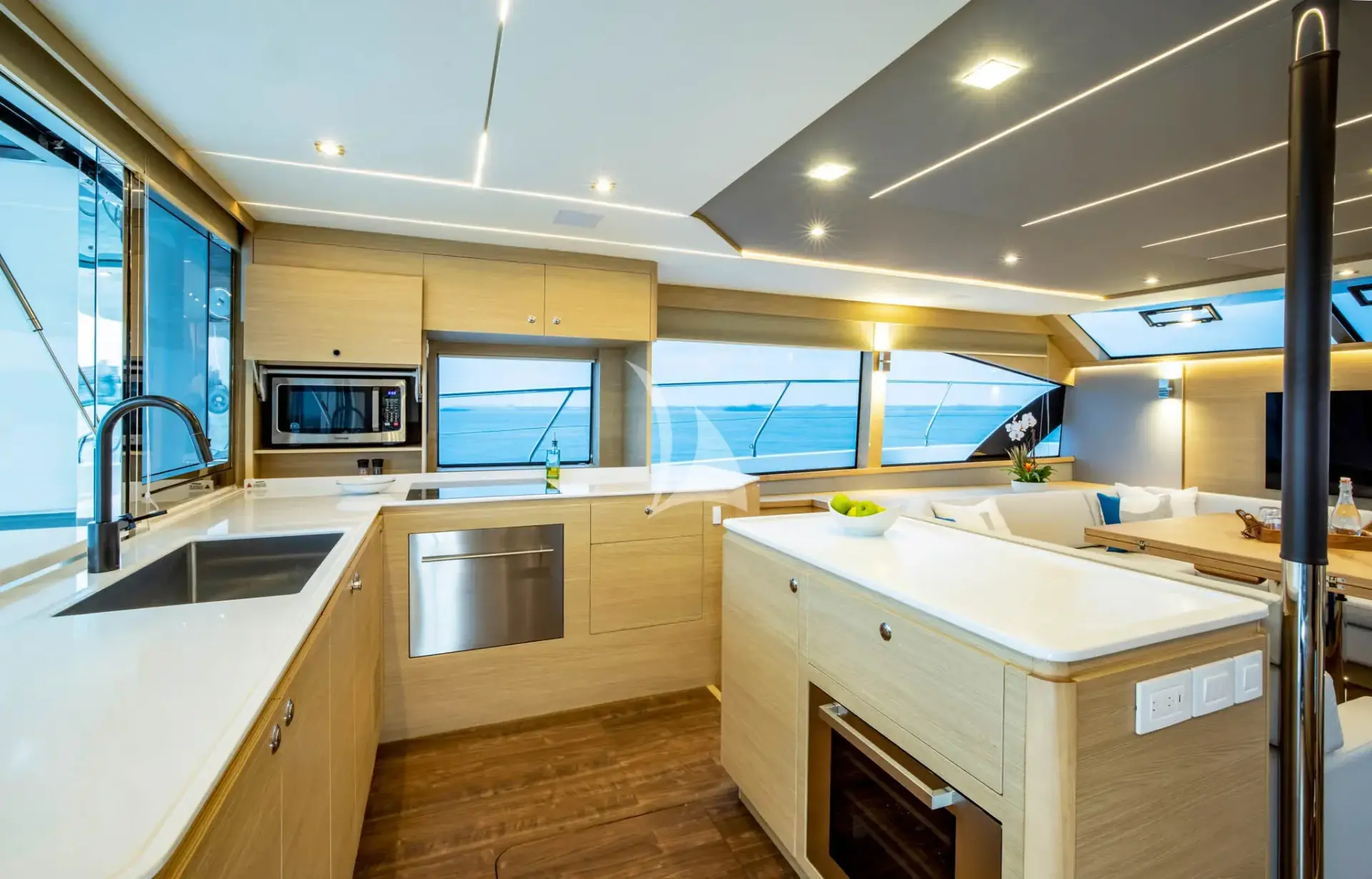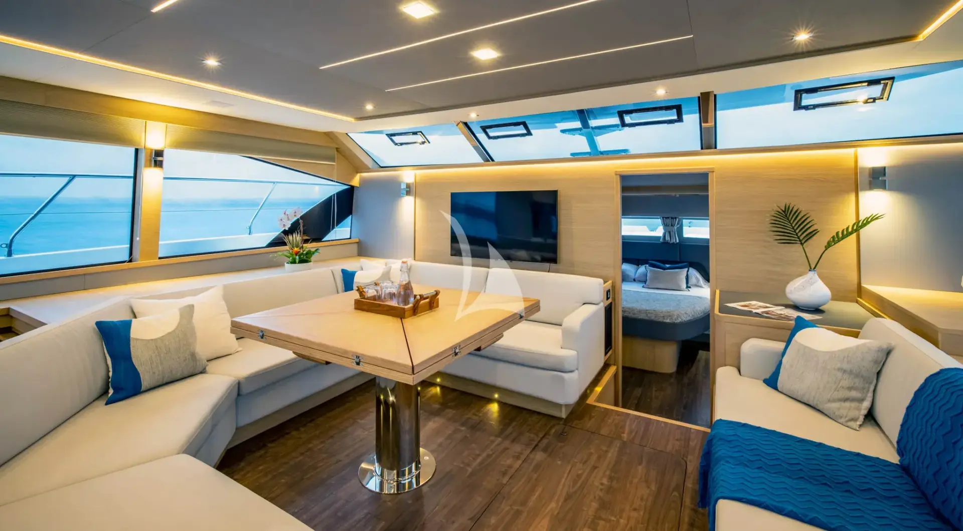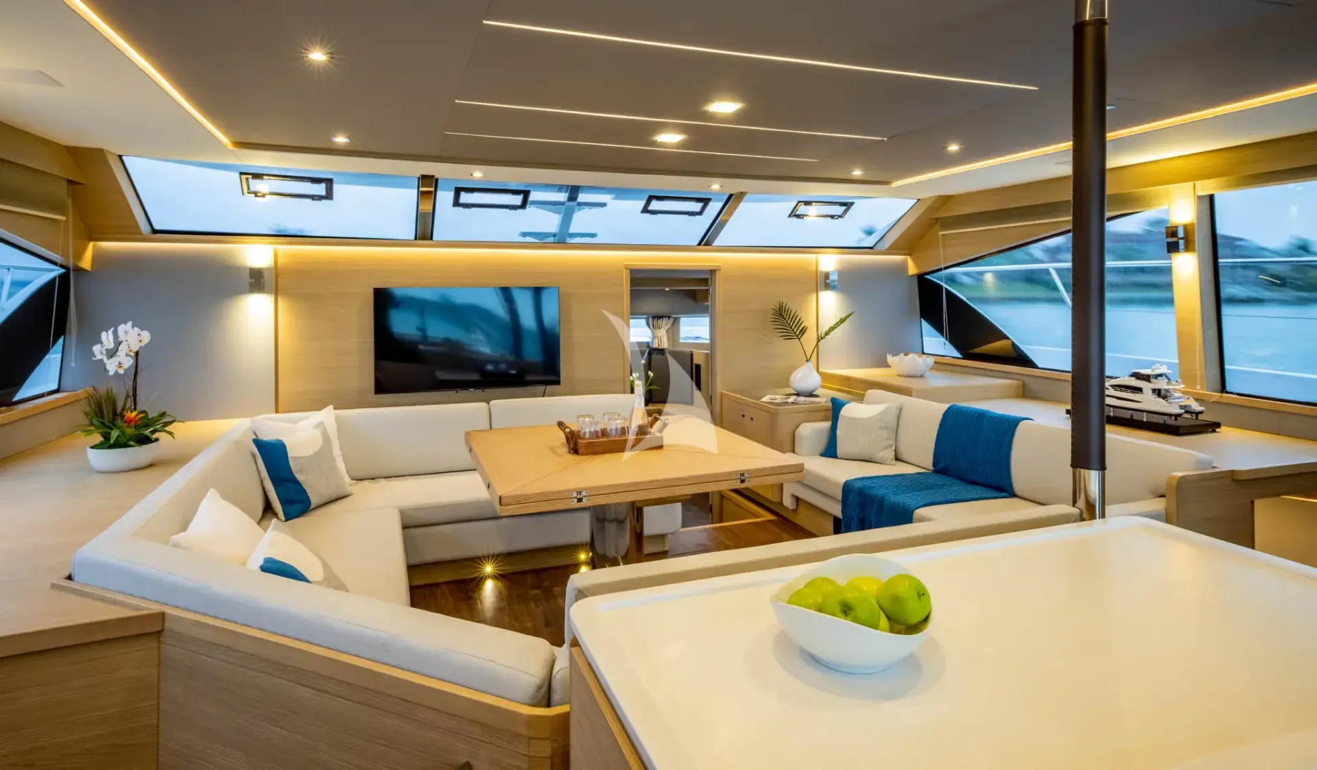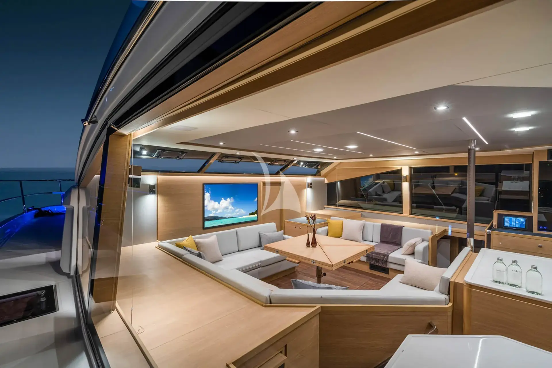 One of her standout features is the full-beam master suite, located on the main deck for outstanding accessibility. The ensuite and dressing areas sit privately within the catamaran’s hulls to either side, creating a spacious, beautifully considered retreat rarely found on a yacht of this size.