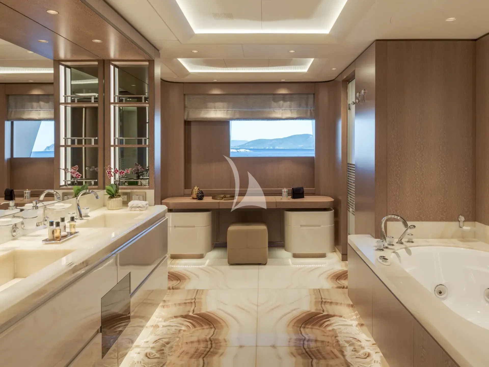 On the main deck, guests will find a further lavish Master's suite, again with separate his and hers ensuite facilities, and a convertible double stateroom with sliding doors.