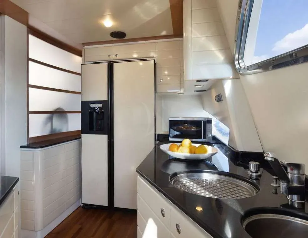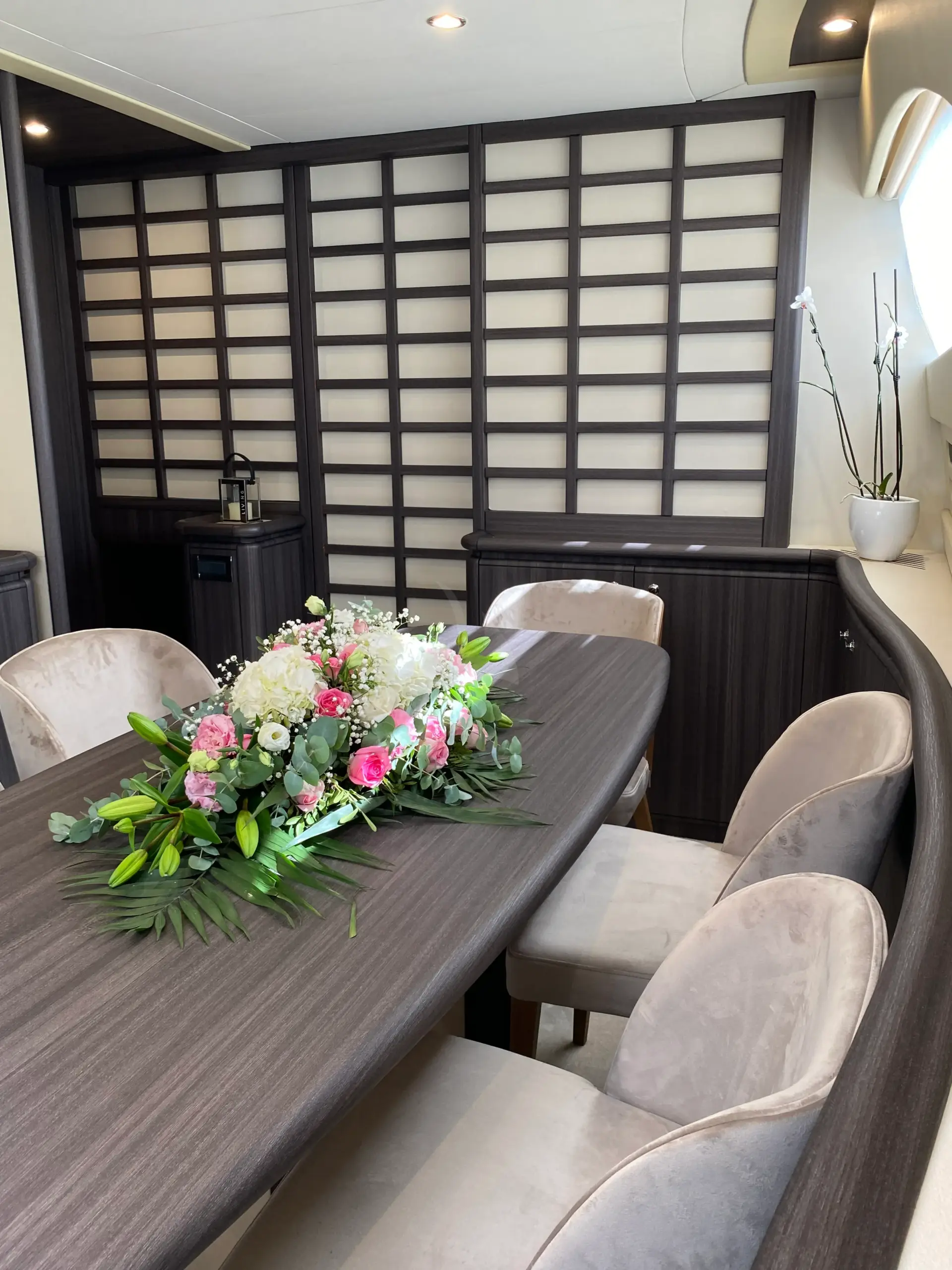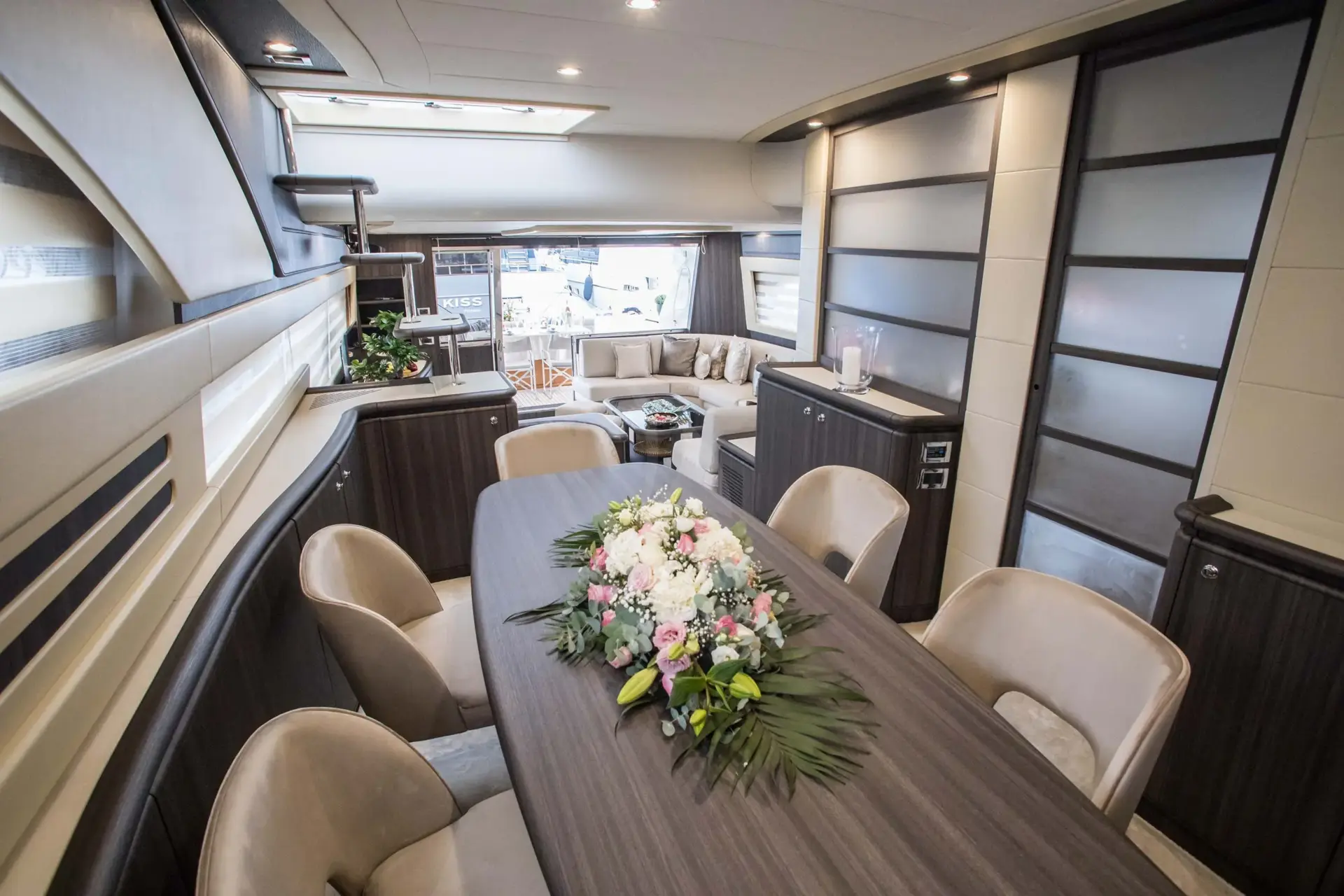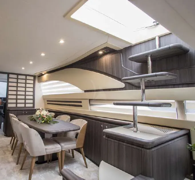 Guests can enjoy a variety of inviting spaces for dining and relaxation. Whether indulging in alfresco meals on the aft deck or sundeck, or dining indoors in an elegant, climate-controlled setting, Sofia D offers versatile options throughout the day. The sundeck and forward bow area provide ideal spots for sunbathing, unwinding, and taking in panoramic sea views.