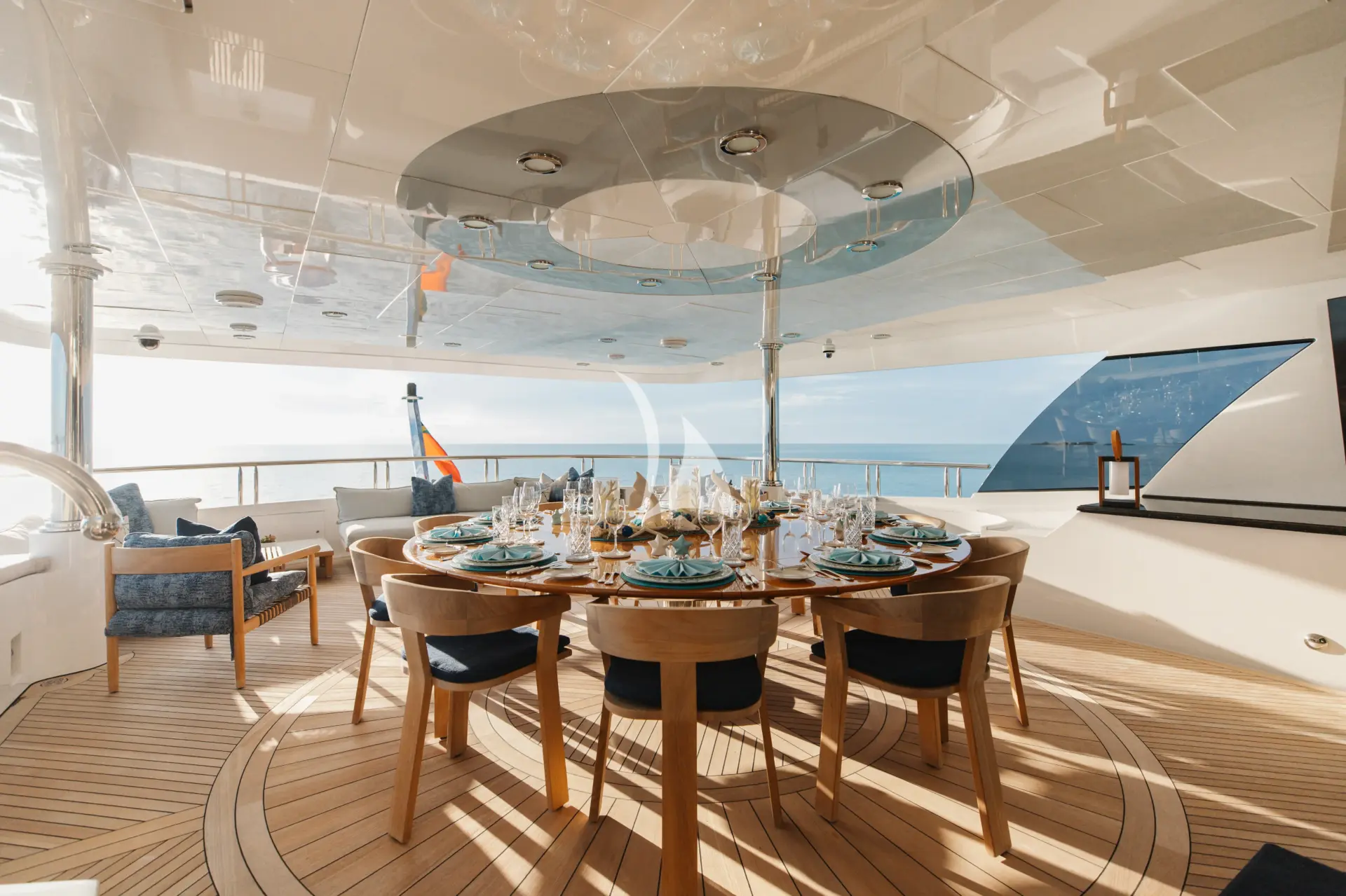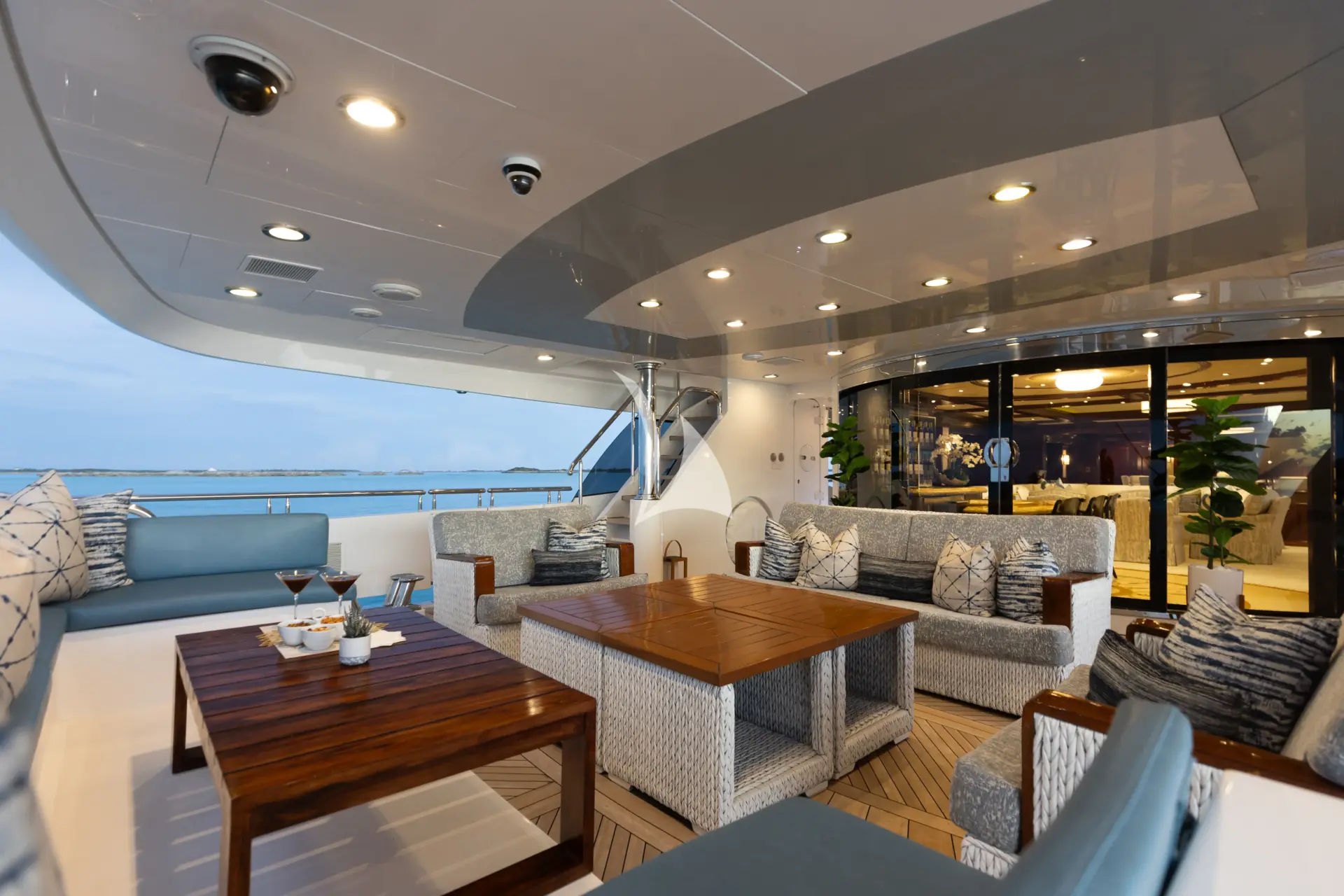 Accessed by a grand central staircase, charter guests will find the stunning skylounge, complete with self-playing baby grand piano, fireplace and full bar surrounded by unbeatable views. The 75-inch TV offers top-of-the-line entertainment with Apple TV, a Kaleidescape movie system with more than 1,800 movies and the latest video gaming systems. The large L-shaped sofa invites guests to sink in and unwind after a long day on the water. Aft of the skylounge is the beautiful alfresco dining table for 11, complete with a breathtaking backdrop of the surrounding scenery.
