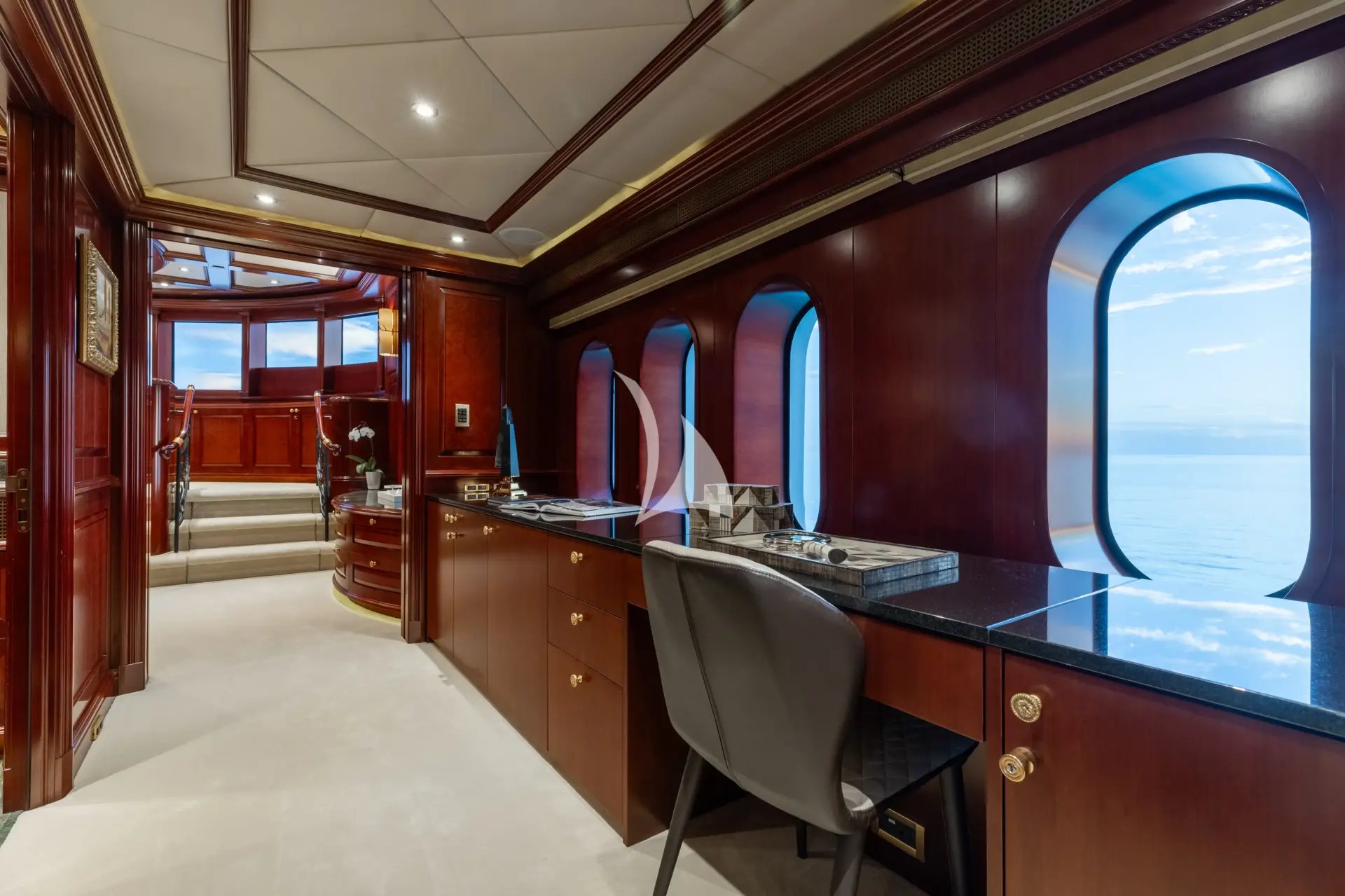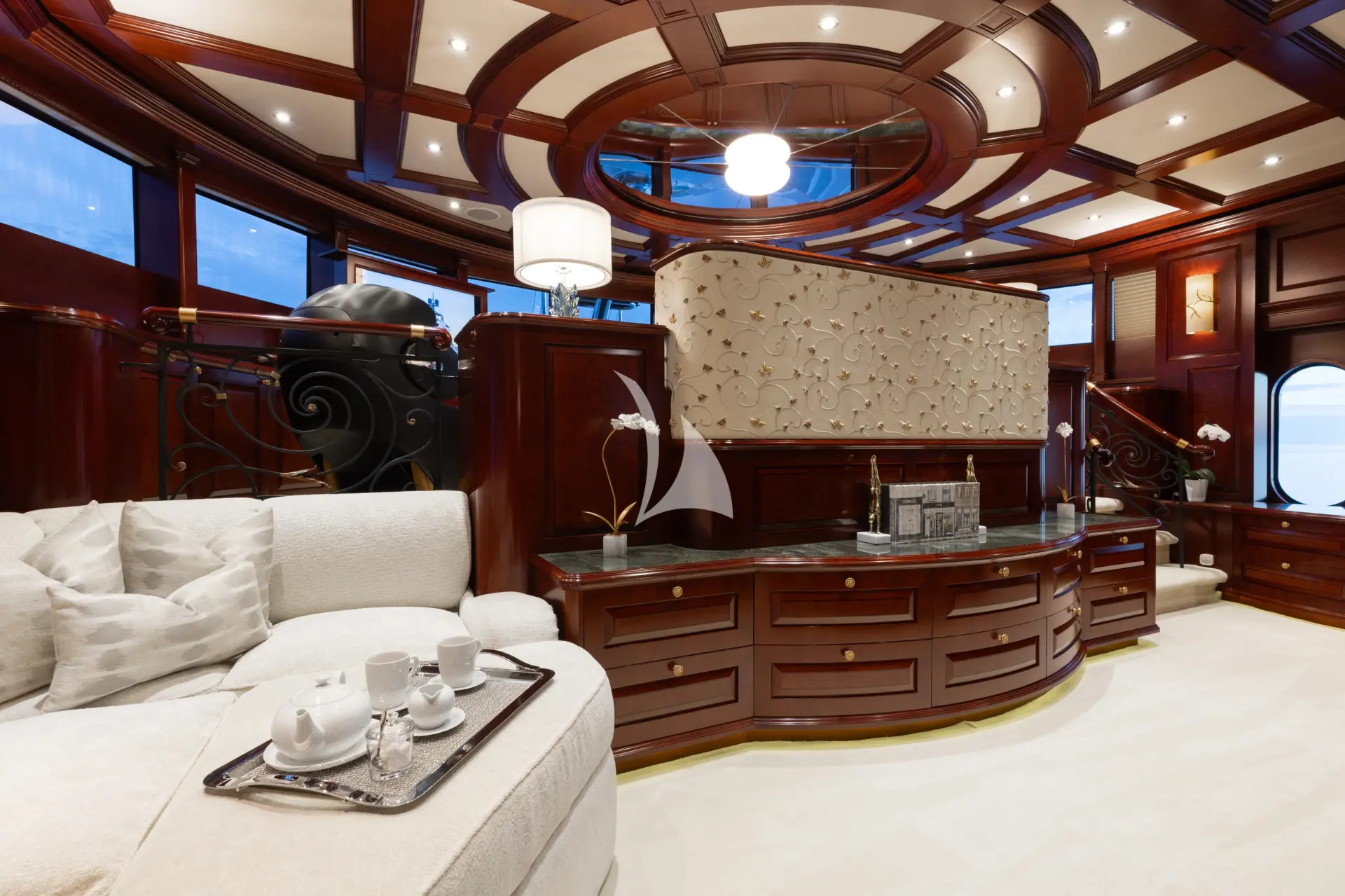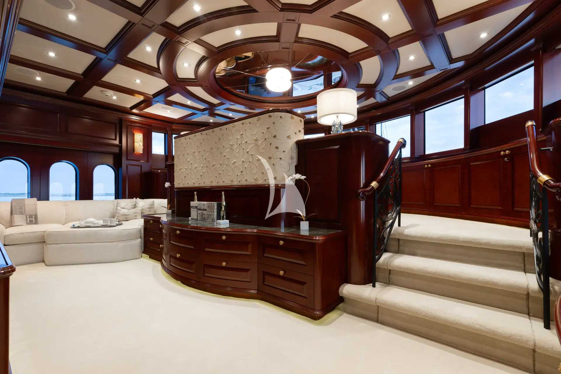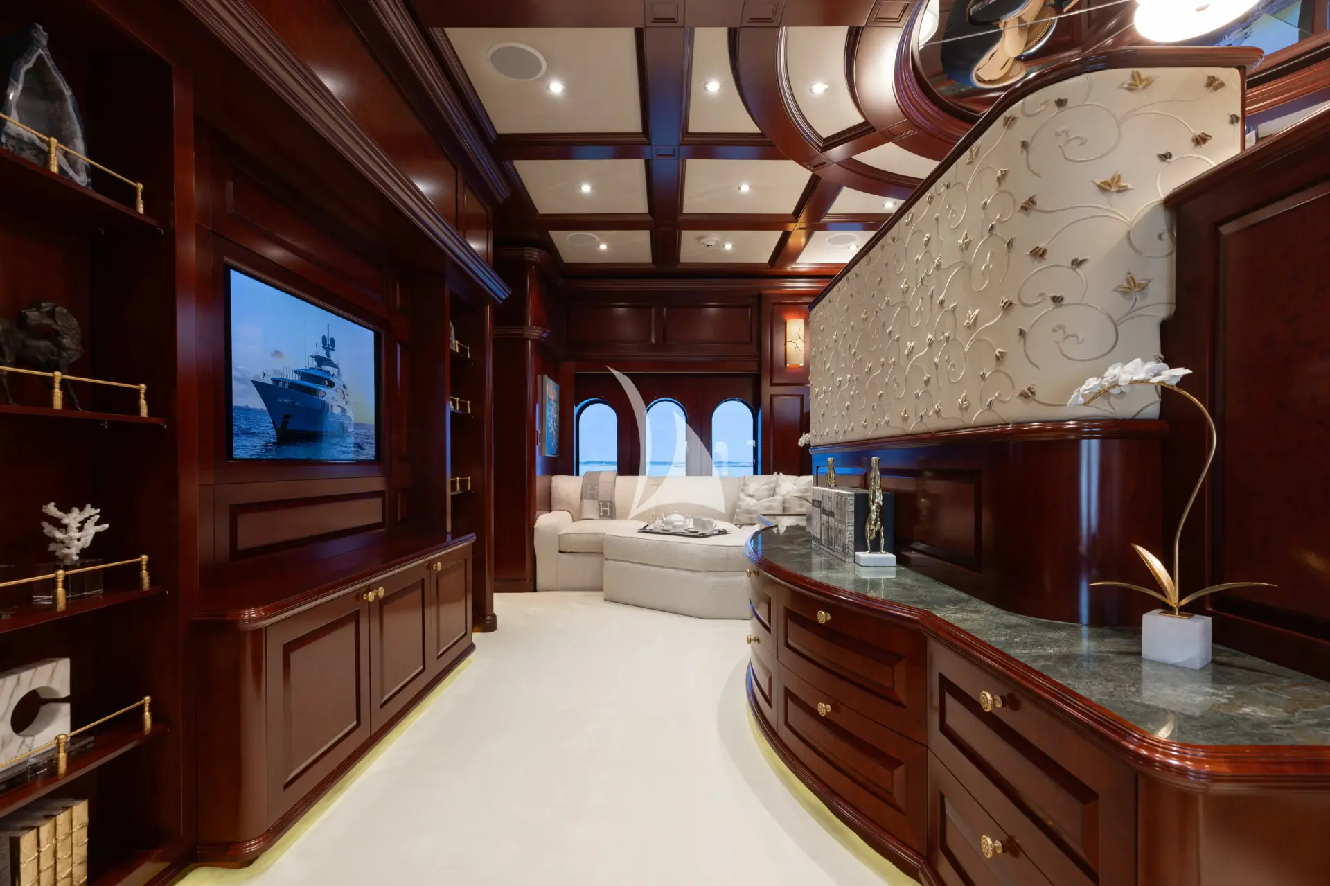 TCB accommodates up to 11 guests to spend restful nights in her five beautifully-appointed staterooms. The full-beam, split-level master suite is ideally suited for privacy. 180-degree views can be seen from the upper level, giving this space a flow of natural light. A unique feature of this stateroom is the intimate lounge on the lower level, perfect for taking a break from the action and unwinding in seclusion. A large his-and-hers en-suite is accessed through the lower level lounge and features a large Jacuzzi tub, vanity and shower. TCB’s additional accommodations include four en-suite staterooms on the lower deck, comprised of three king-size staterooms and one twin stateroom with a Pullman, perfect for accommodating small children. Each stateroom onboard showcases elegant styling as seen throughout the yacht’s interior.