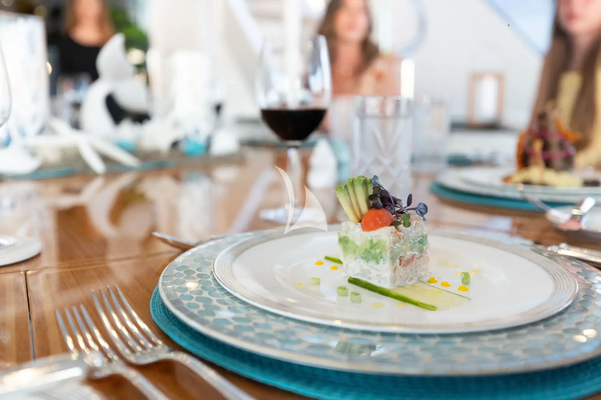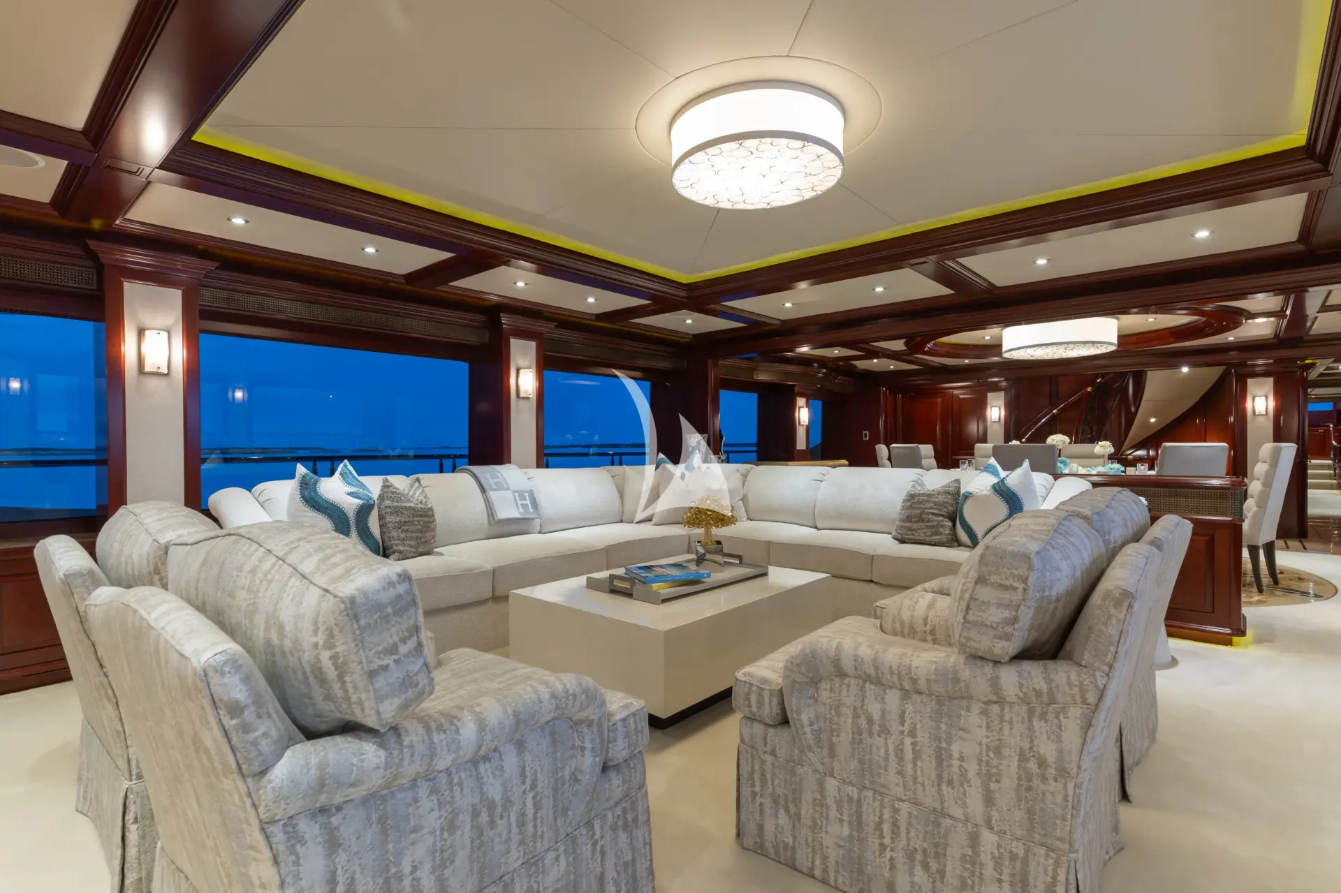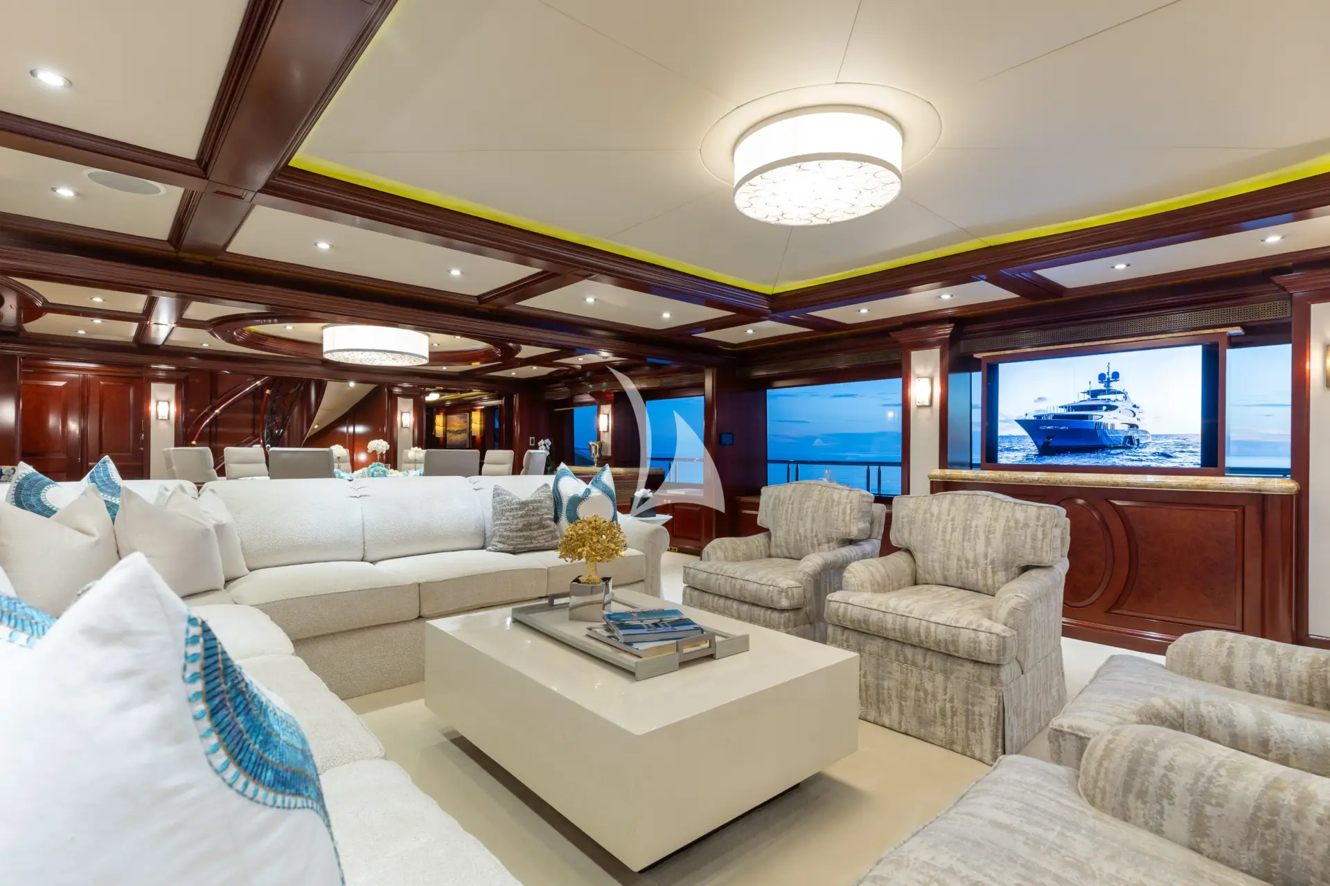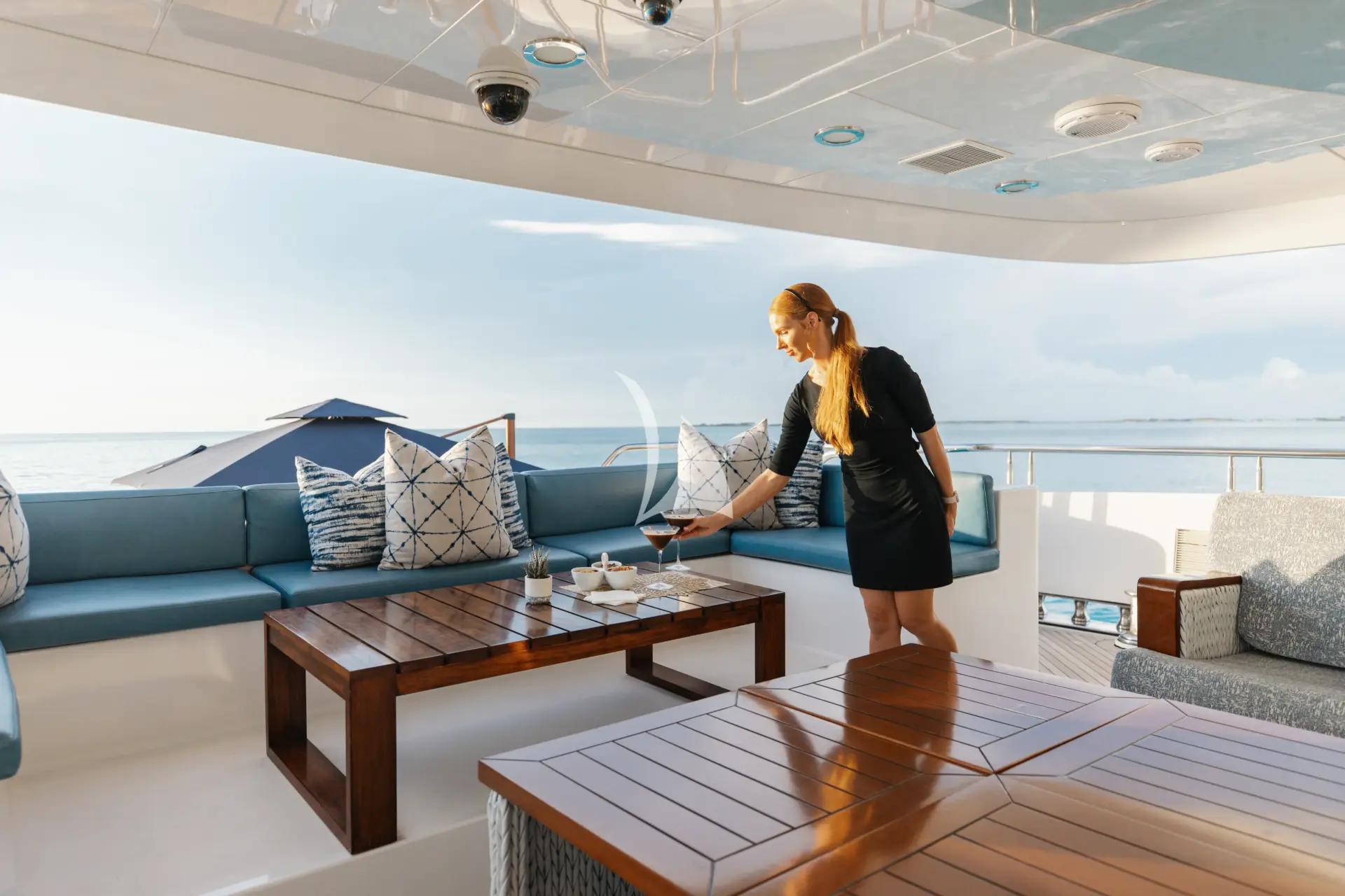 As guests step aboard, they will be greeted by TCB’s cozy aft deck, an ideal spot for settling in, sitting back and watching the embarkation port fade into the distance. In the mornings, the aft deck serves as the perfect locale for alfresco lounging with a morning coffee. Guests will find the stunning open-plan main salon and formal dining area through the sliding doors. Neutral-toned furnishings complement the wood accents that adorn the walls and ceiling. The superyacht’s main salon showcases an effortless blend of natural and ambient lighting, allowing the space to feel light and airy.