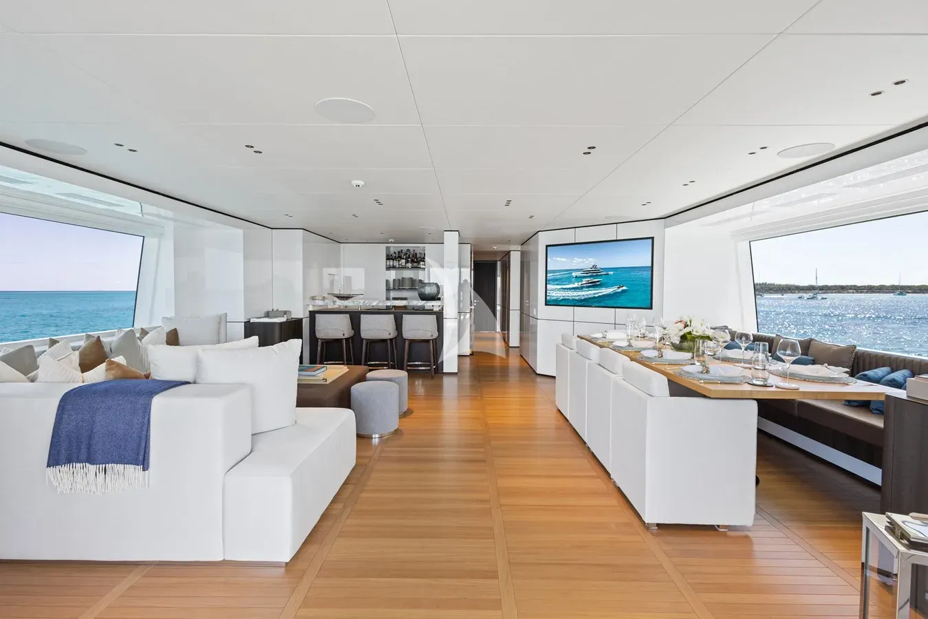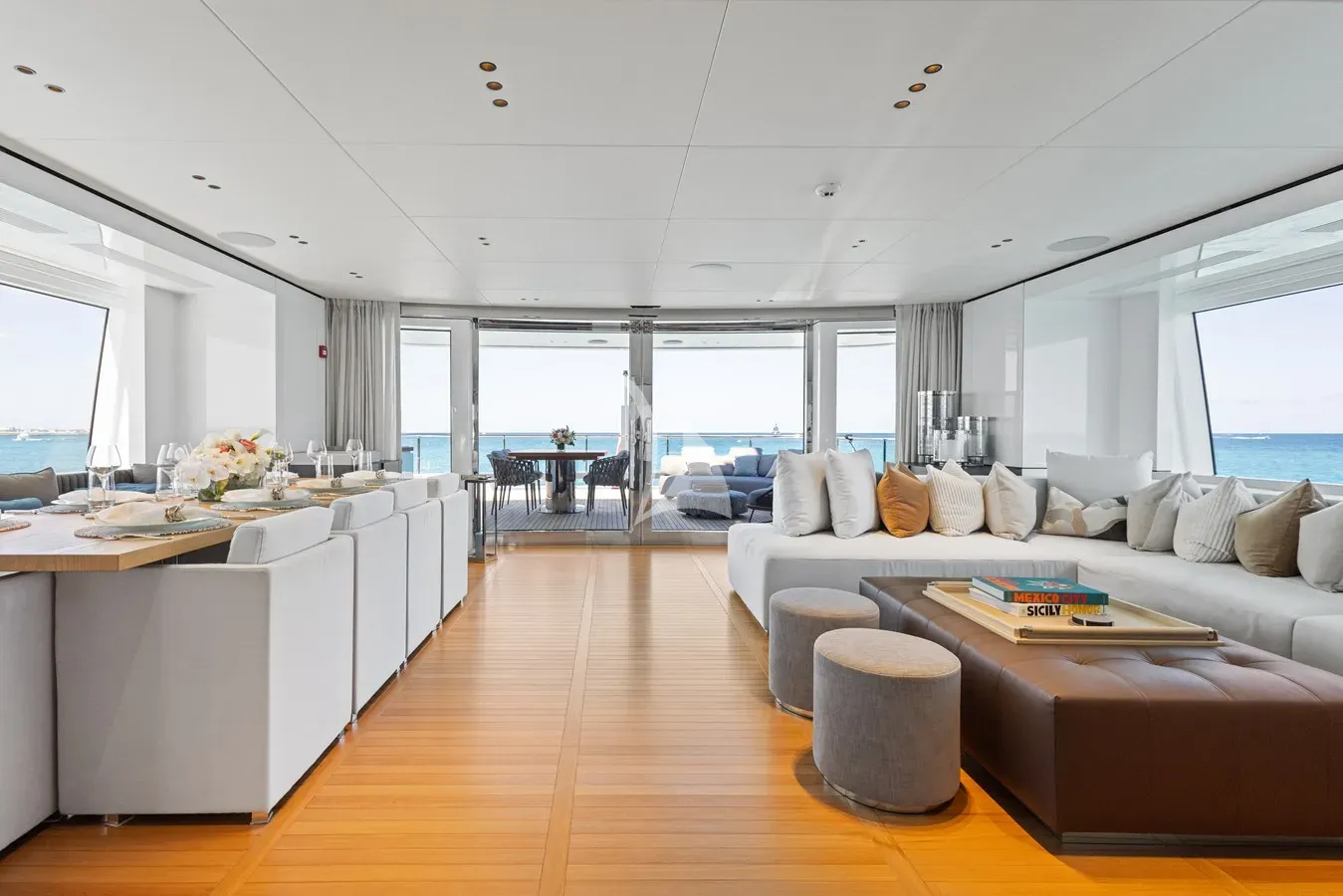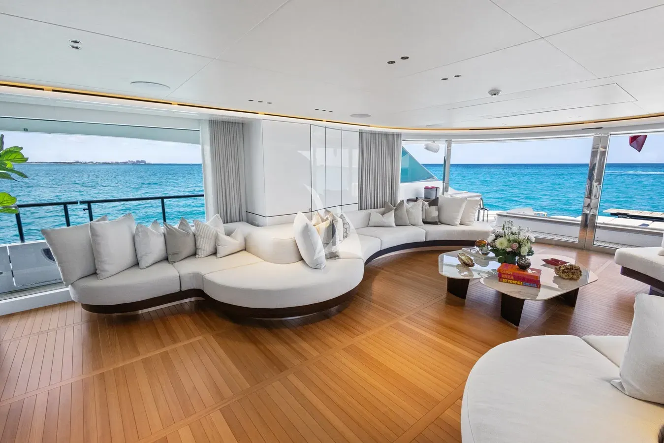 Her aft deck opens seamlessly from the main salon and is arranged as a stylish beach-club space with a plunge pool, sunpads, loungers and seating. Additional sunpads are available on the foredeck, while the sun deck features a Jacuzzi, shaded dining, a sit-up bar and a versatile aft lounge equipped for evening entertainment, including a DJ setup.