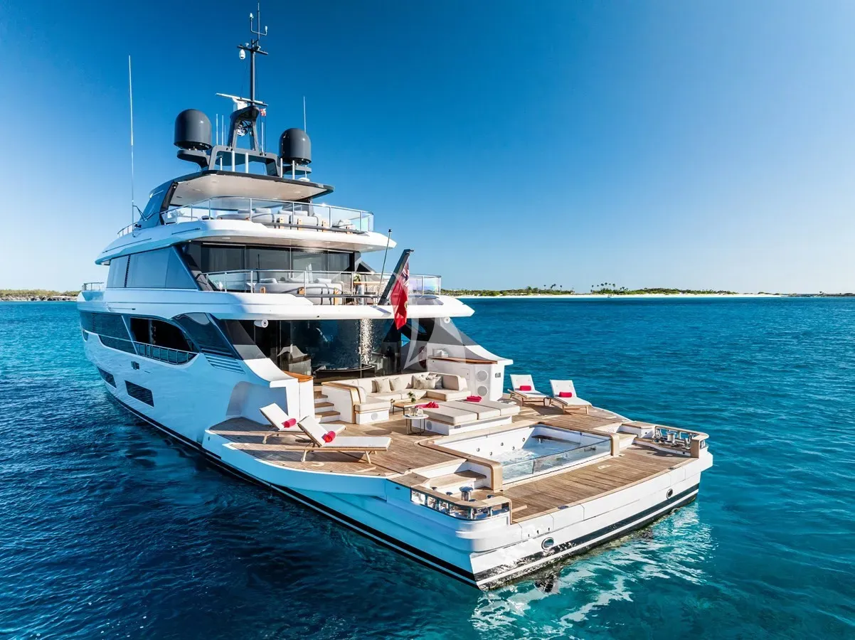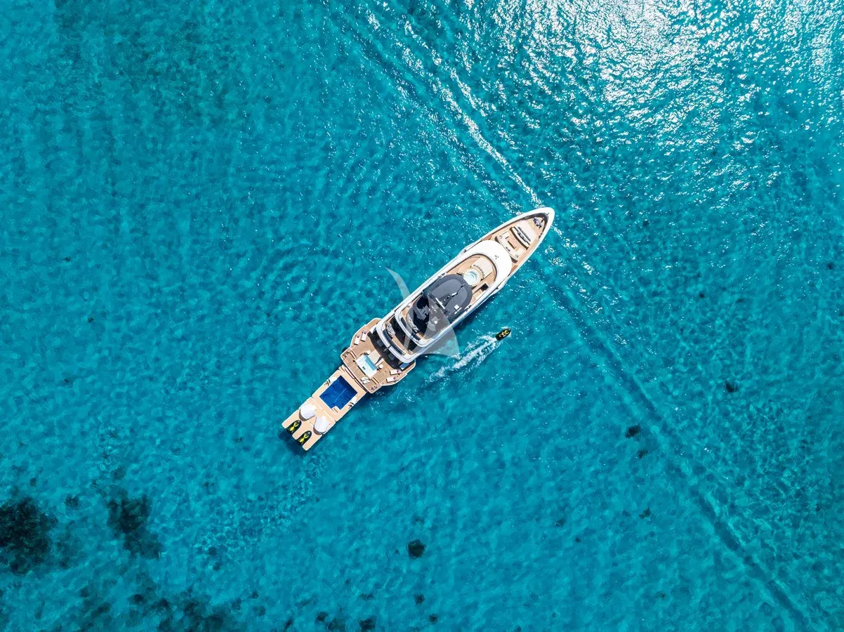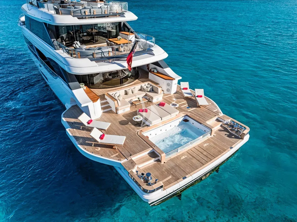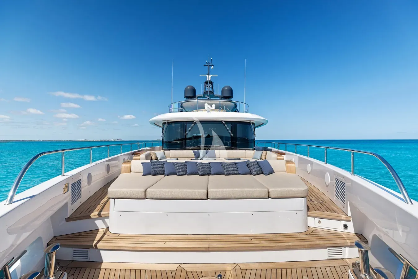 Her aft deck opens seamlessly from the main salon and is arranged as a stylish beach-club space with a plunge pool, sunpads, loungers and seating. Additional sunpads are available on the foredeck, while the sun deck features a Jacuzzi, shaded dining, a sit-up bar and a versatile aft lounge equipped for evening entertainment, including a DJ setup.