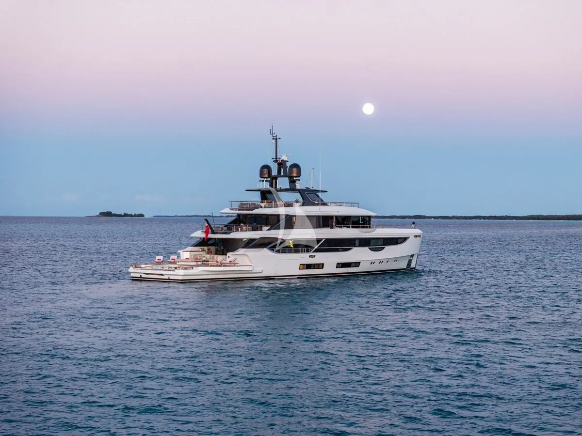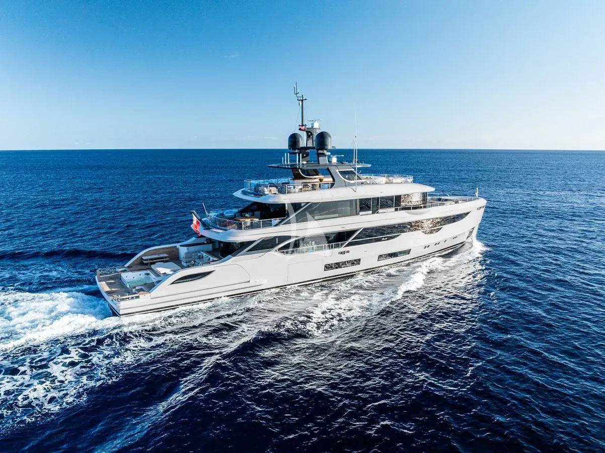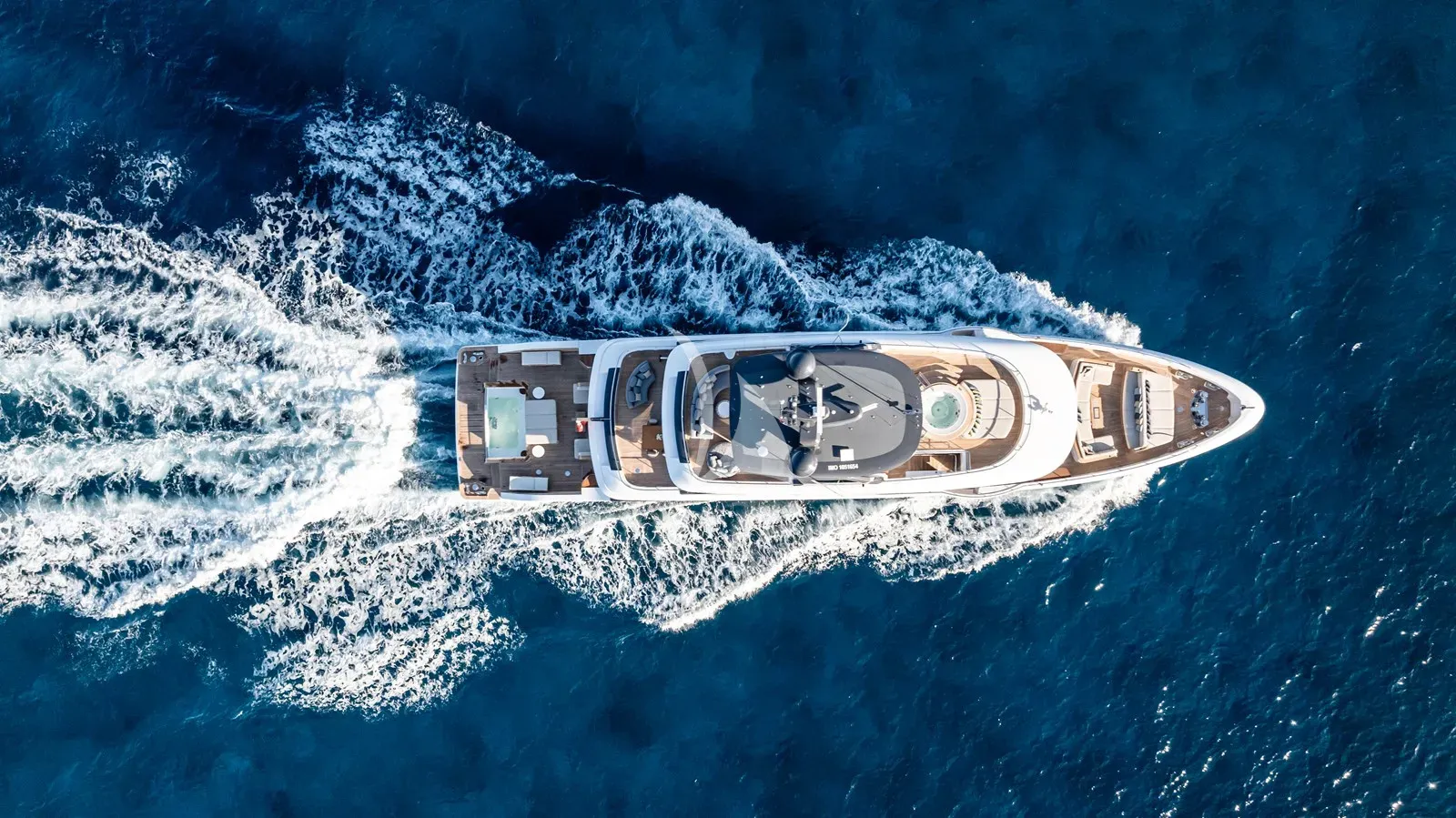 Up to 10 guests are accommodated in five cabins, including a full-beam Owner’s suite with private lounge, dressing room and his-and-hers bathroom. Two VIP cabins and two convertible twin cabins with Pullman berths complete the layout, supported by a professional crew of nine.