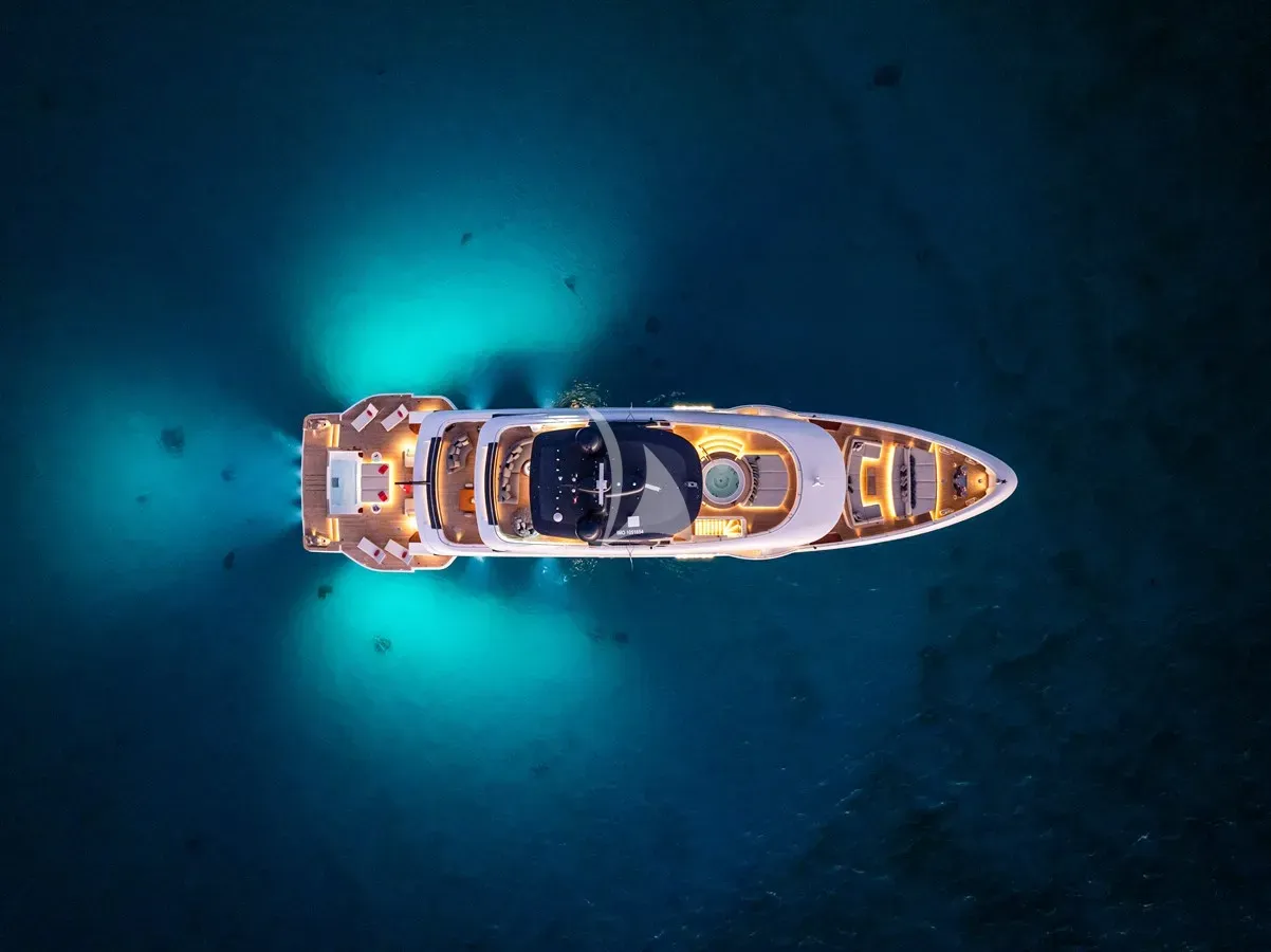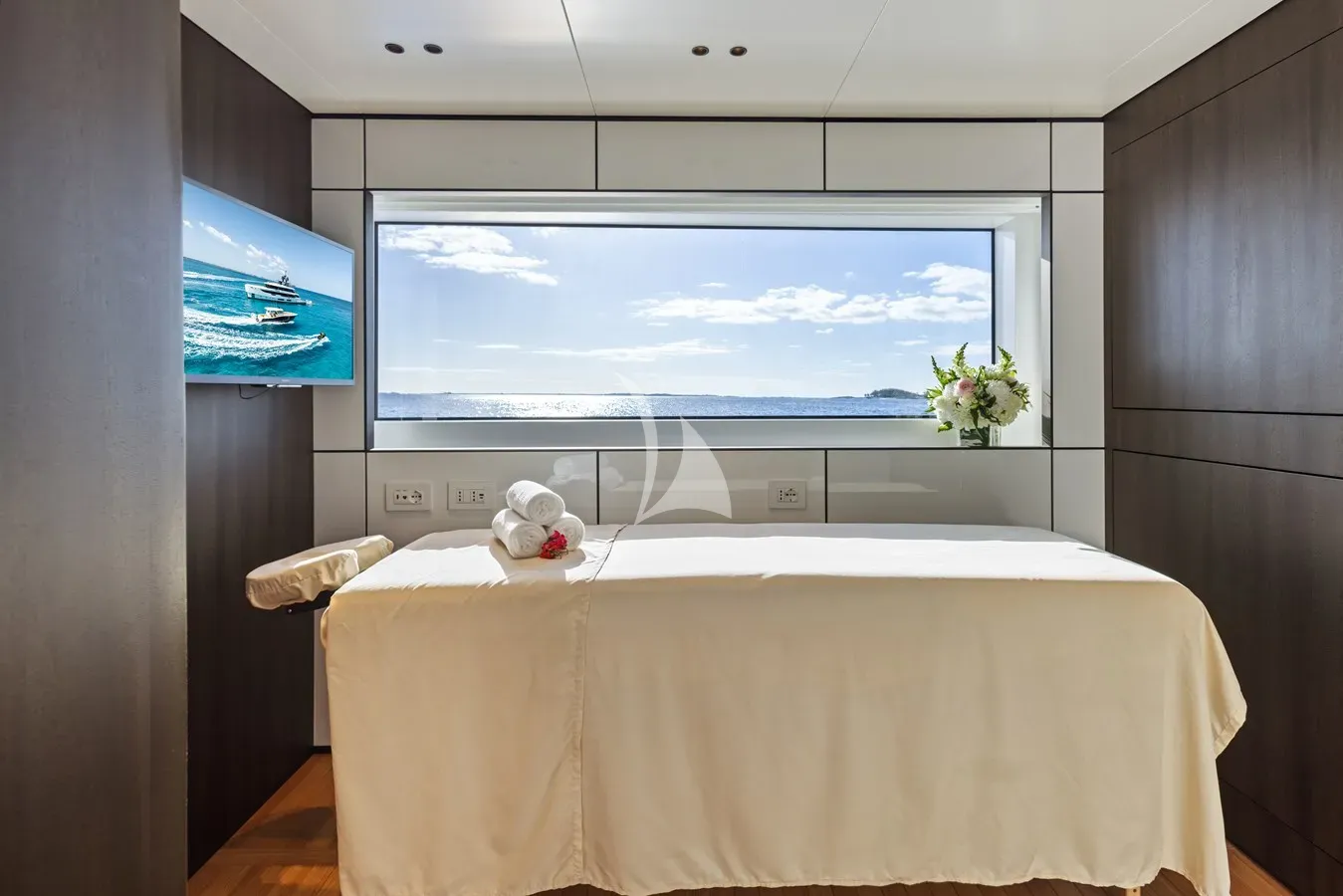 Indoor spaces include an elegant main deck salon with curved white sofas and an a striking illuminated Onice marble bar, a comfortable sky lounge for movie nights, and a wellness cabin that can also be used as a gym.