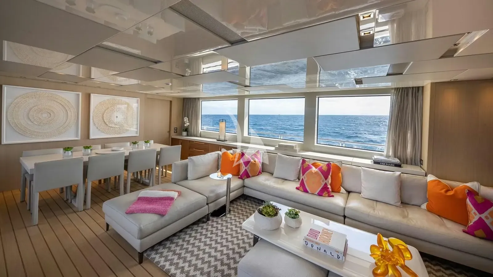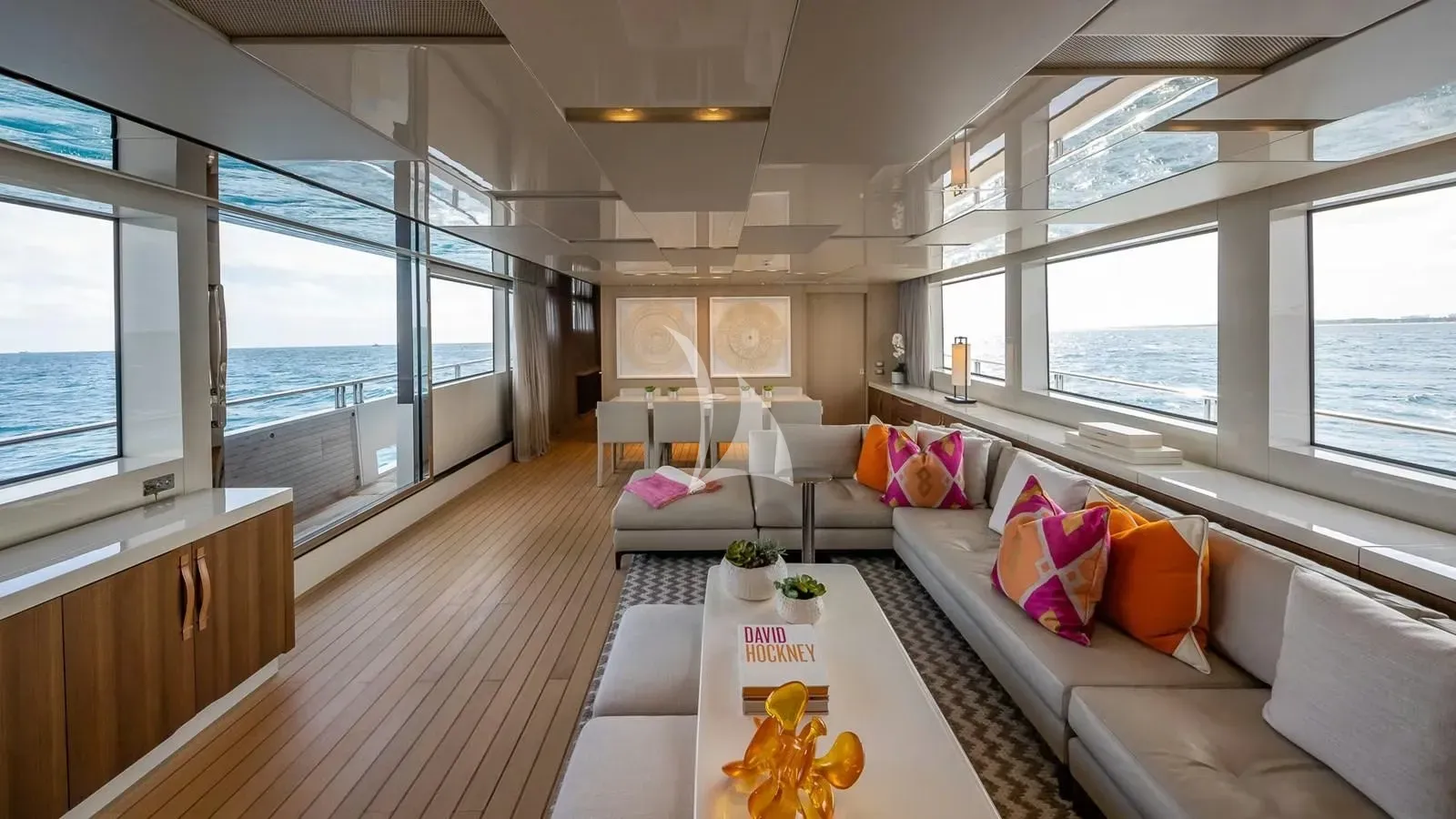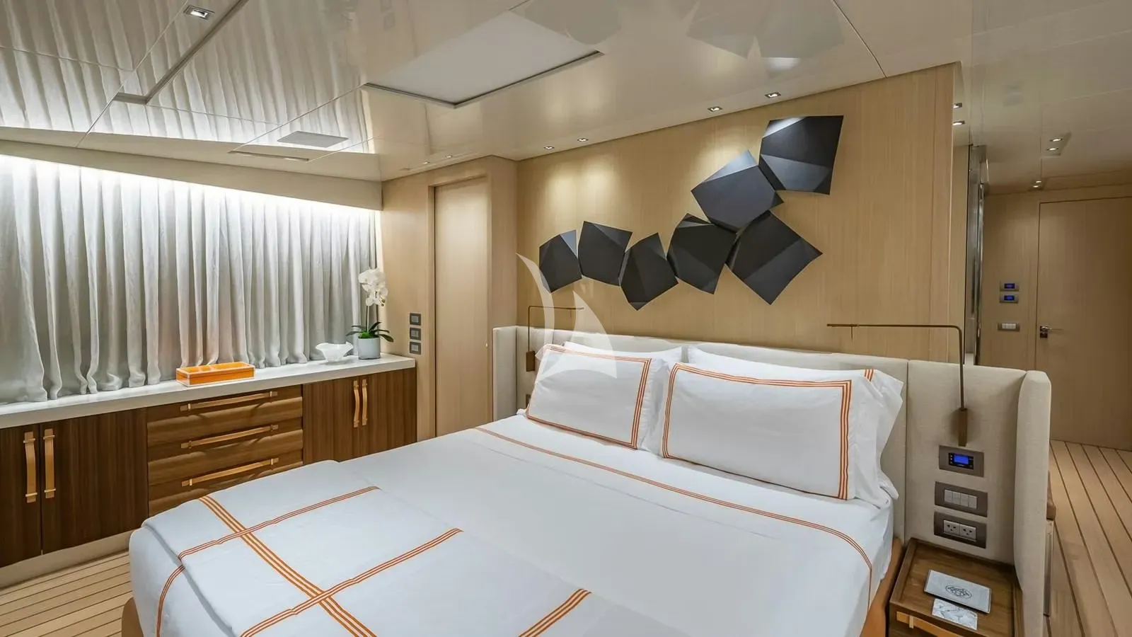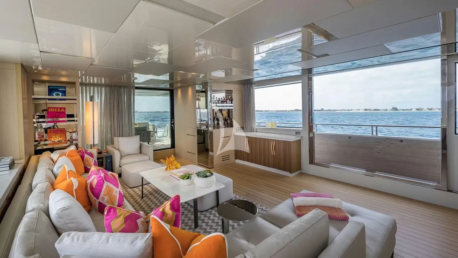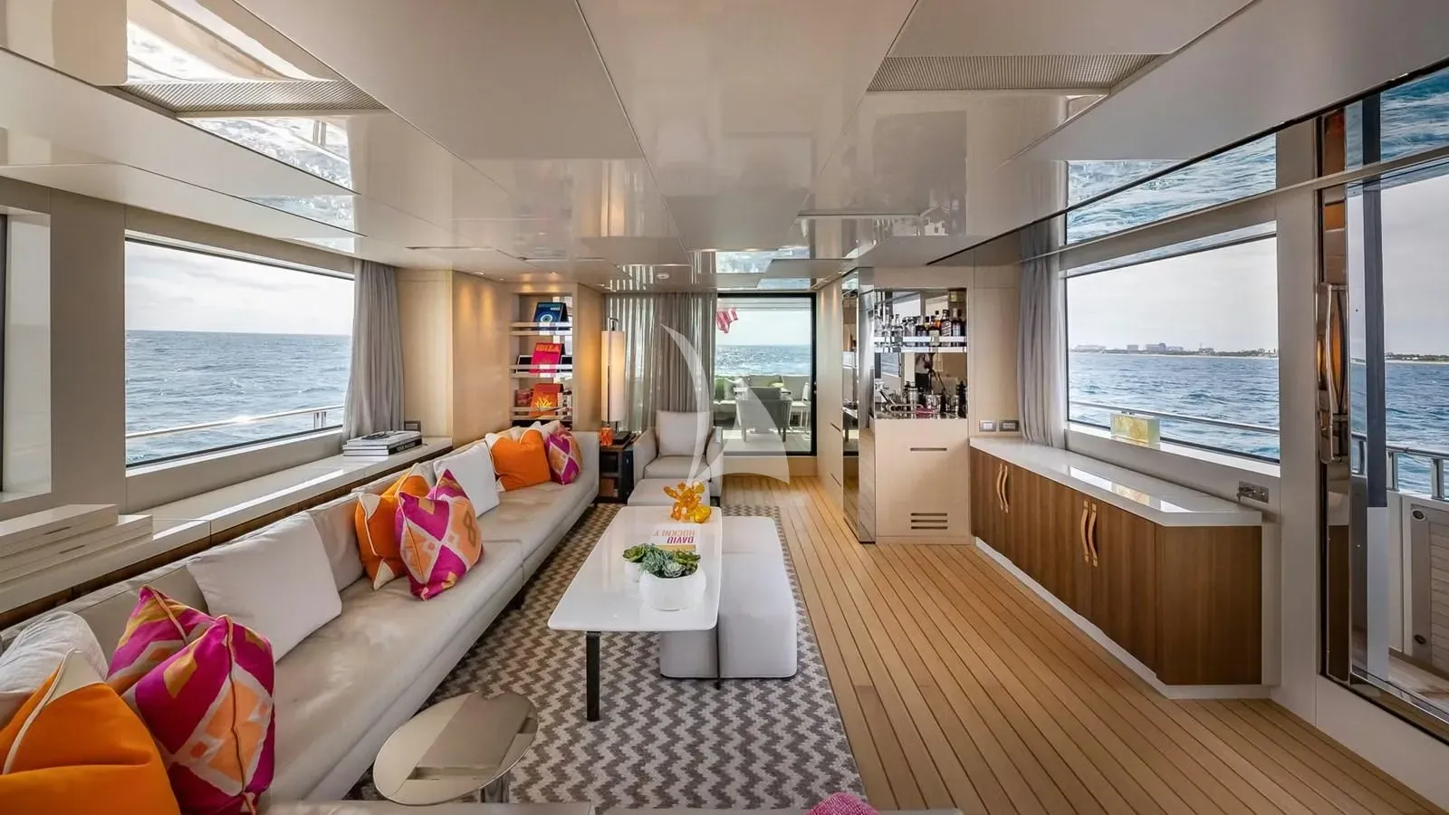 The yacht’s wide-beam layout creates an airy, spacious interior, highlighted by a main-deck owner’s suite featuring 180-degree forward-facing windows, a private office, and a dressing area. Each cabin is thoughtfully designed to provide privacy, comfort, and refined elegance. The main deck salon opens to a hydraulic fold-down balcony, seamlessly connecting indoor and outdoor living, while stylish furnishings, high-end finishes, and modern amenities ensure every moment onboard is both relaxing and memorable.