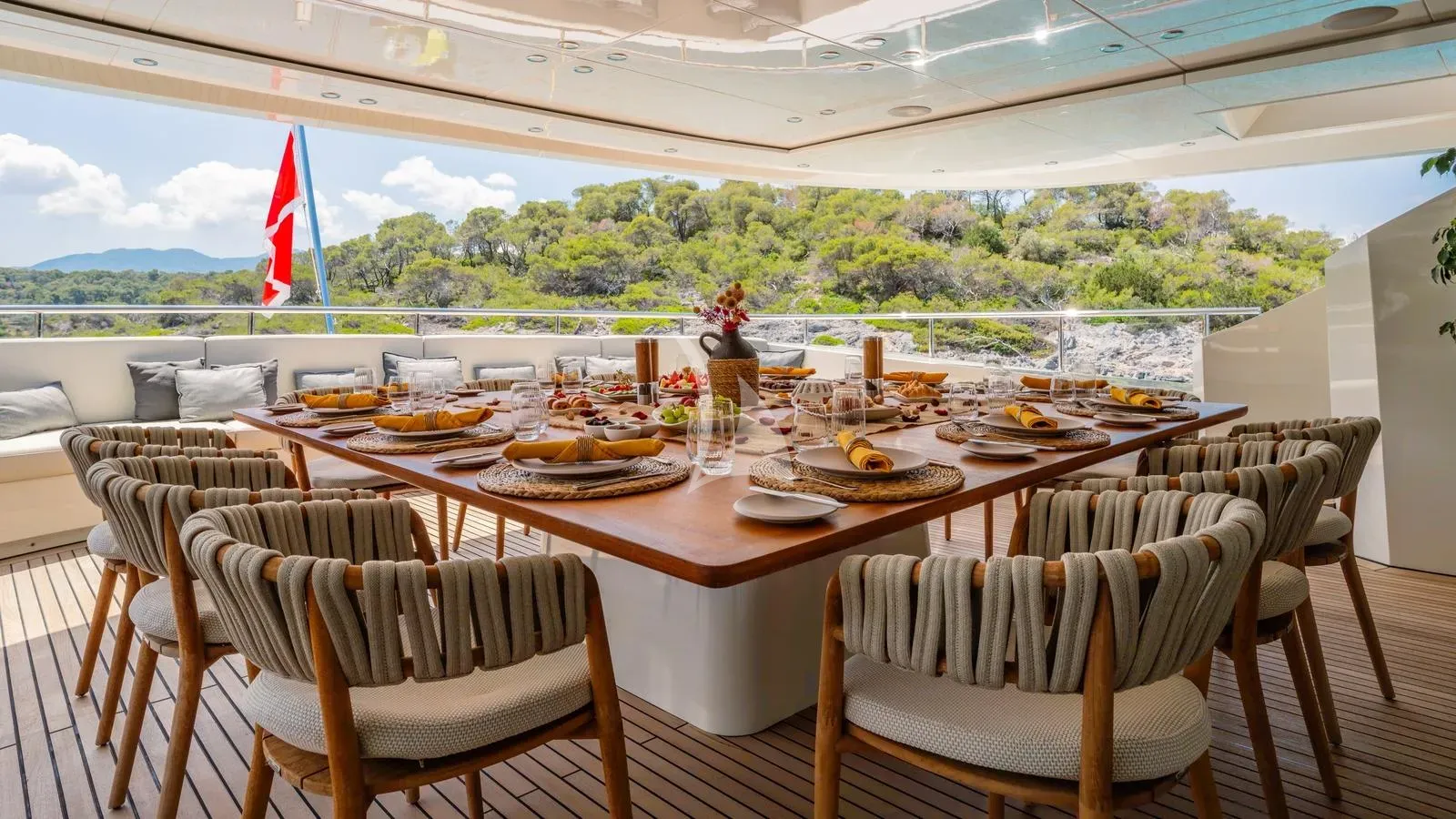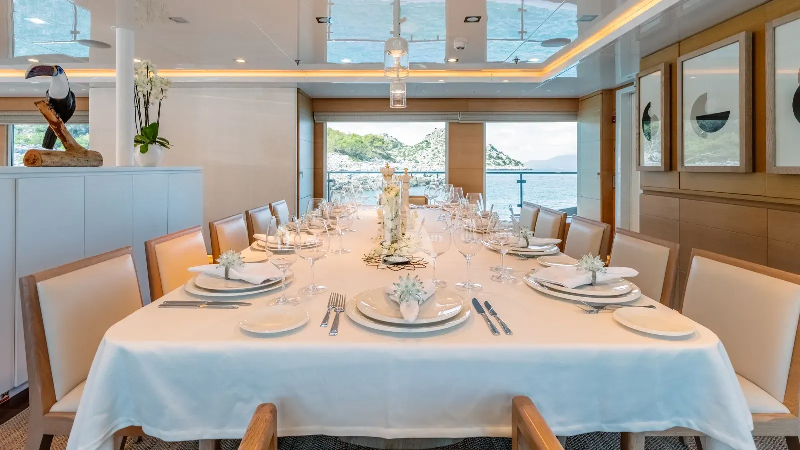 ZIA can accommodate up to 12 guests in 6 luxury cabins, comprising a master suite on the main deck, one VIP cabin on the upper deck, two double cabins, and two twin cabins on the lower deck; the twin cabins are convertible to double-bed cabins. The master suite benefits from a his-and-her bathroom and boasts its own Jacuzzi. Guests on board will enjoy the attentive service of a skilled crew of 12, committed to fulfilling your every requirement and ensuring each detail is handled with precision. Delight in exquisite cuisine crafted by the onboard Chef, served in sophisticated indoor dining spaces or al fresco beneath the starlit sky.