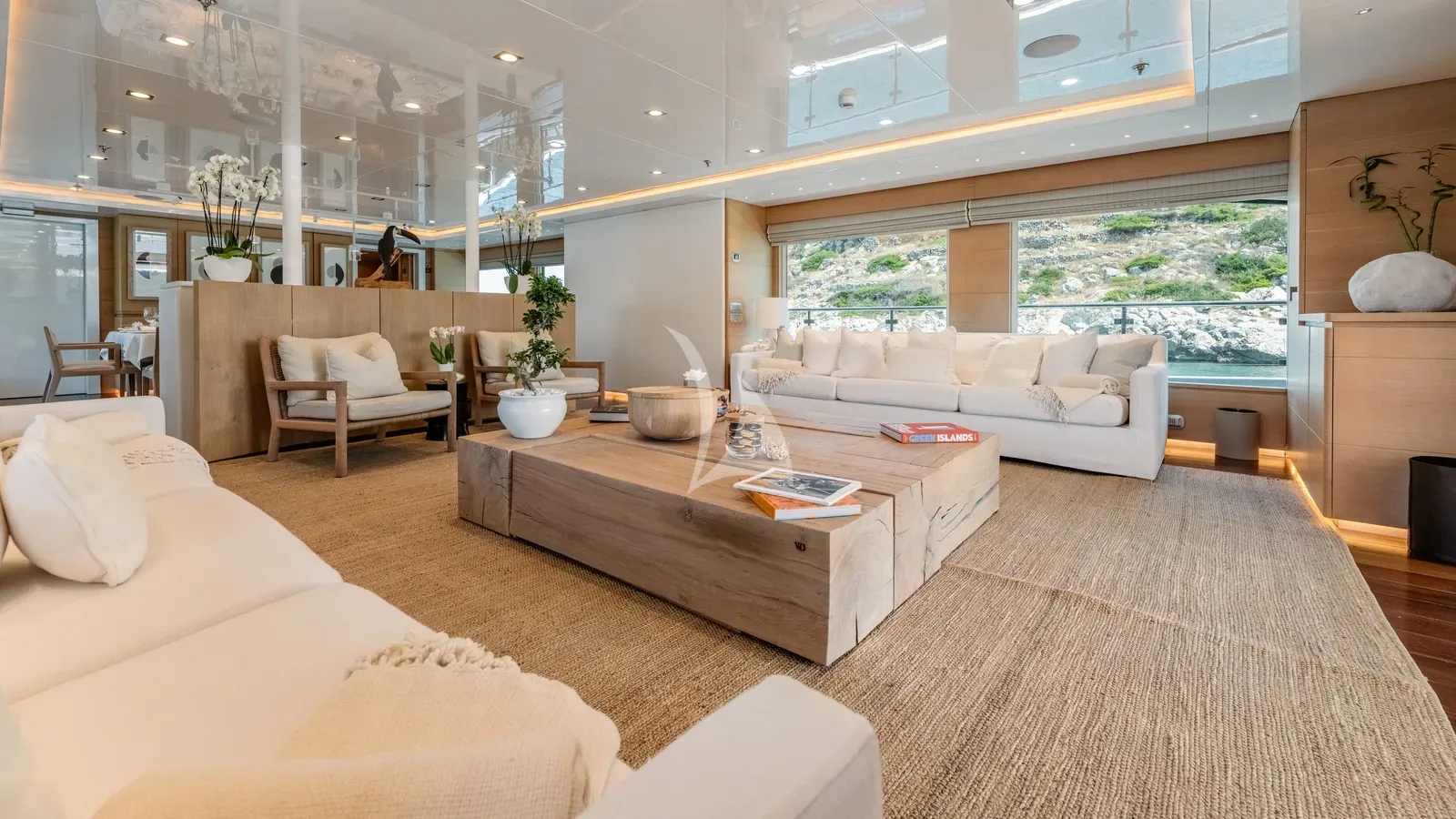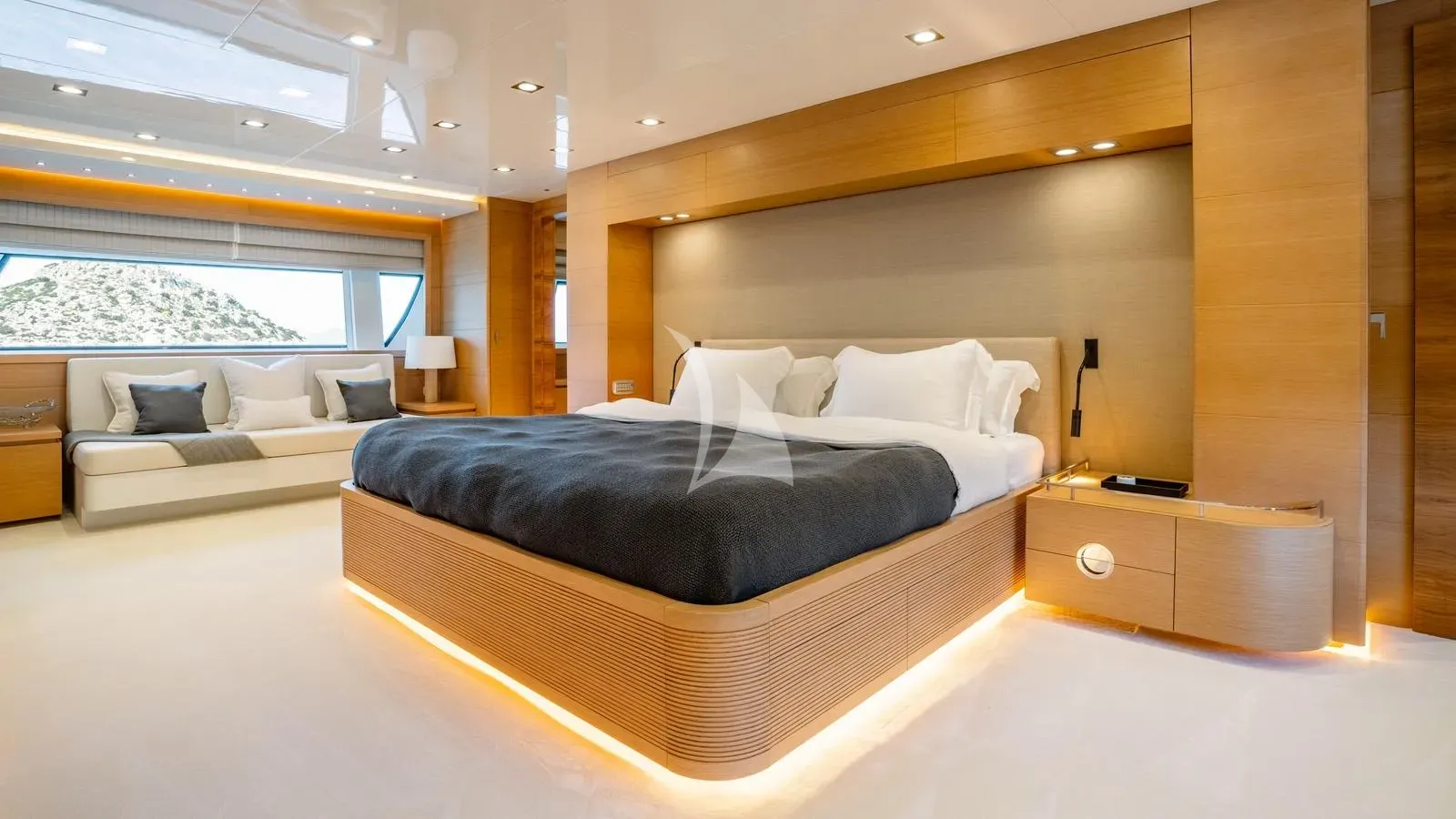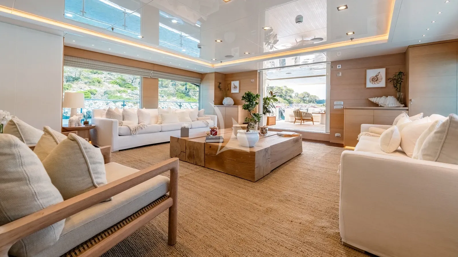 The yacht exudes understated elegance through its minimalist interior design, characterized by spacious layouts flooded with natural light. The carefully curated aesthetic showcases a seamless blend of natural woods and a soothing palette of neutral tones, creating a serene and inviting atmosphere. Clean lines and uncluttered spaces enhance the sense of tranquility, offering a refined and comfortable setting for those aboard to relax and unwind in style.