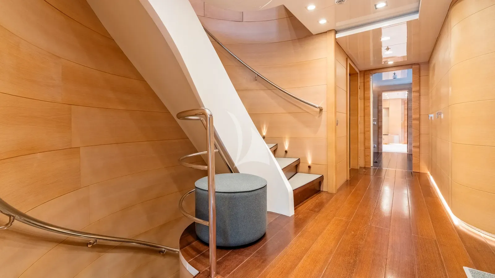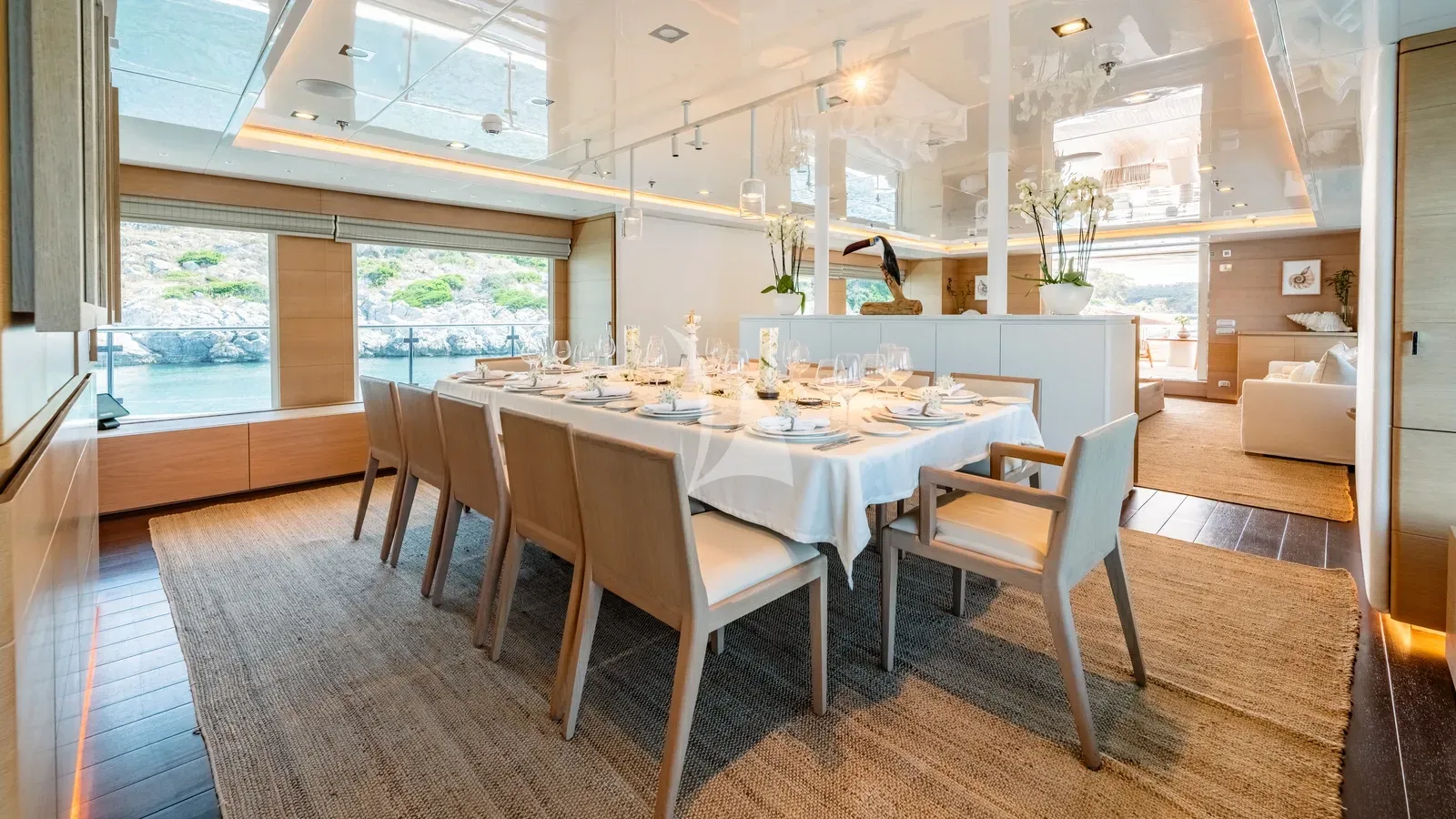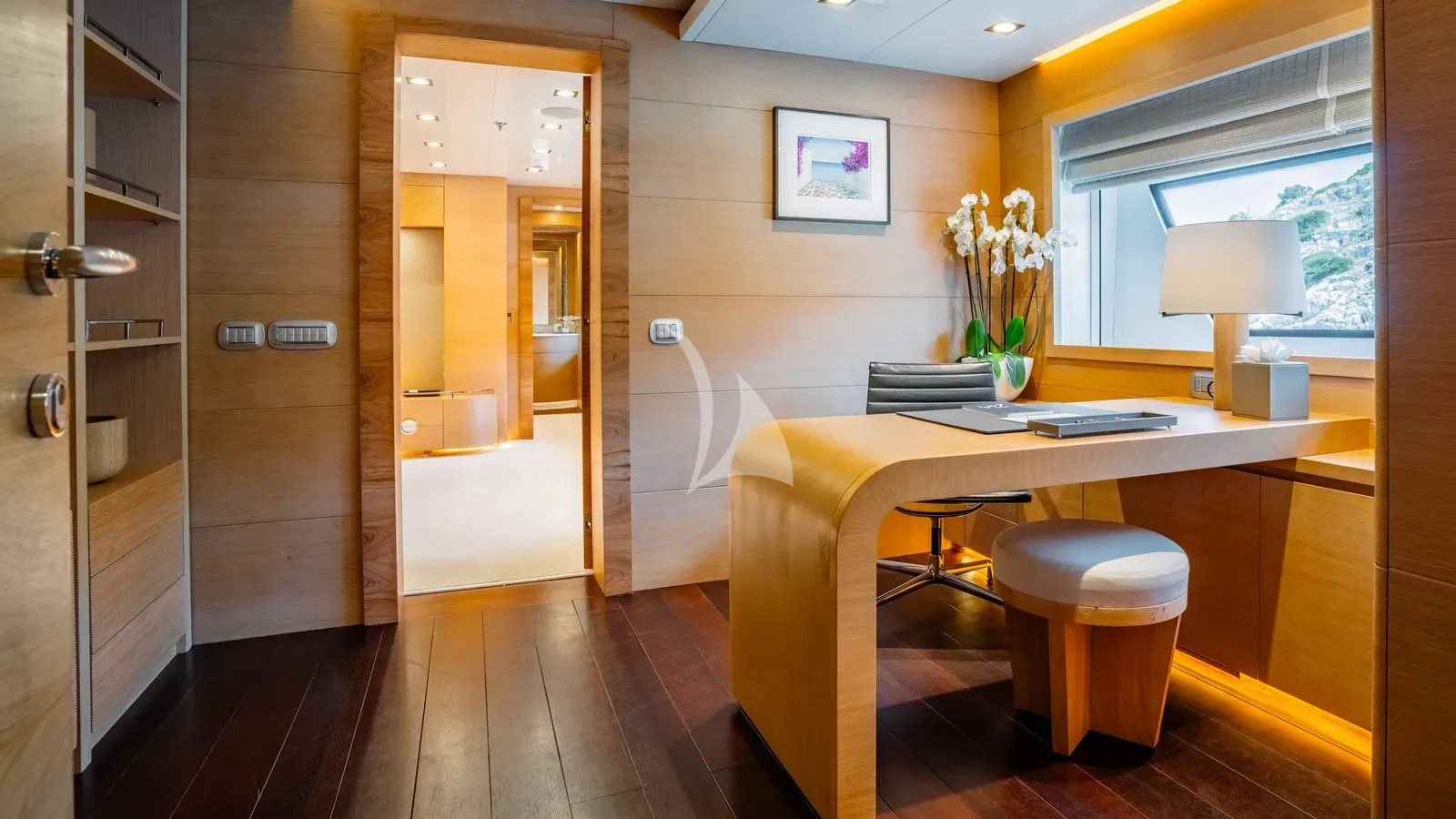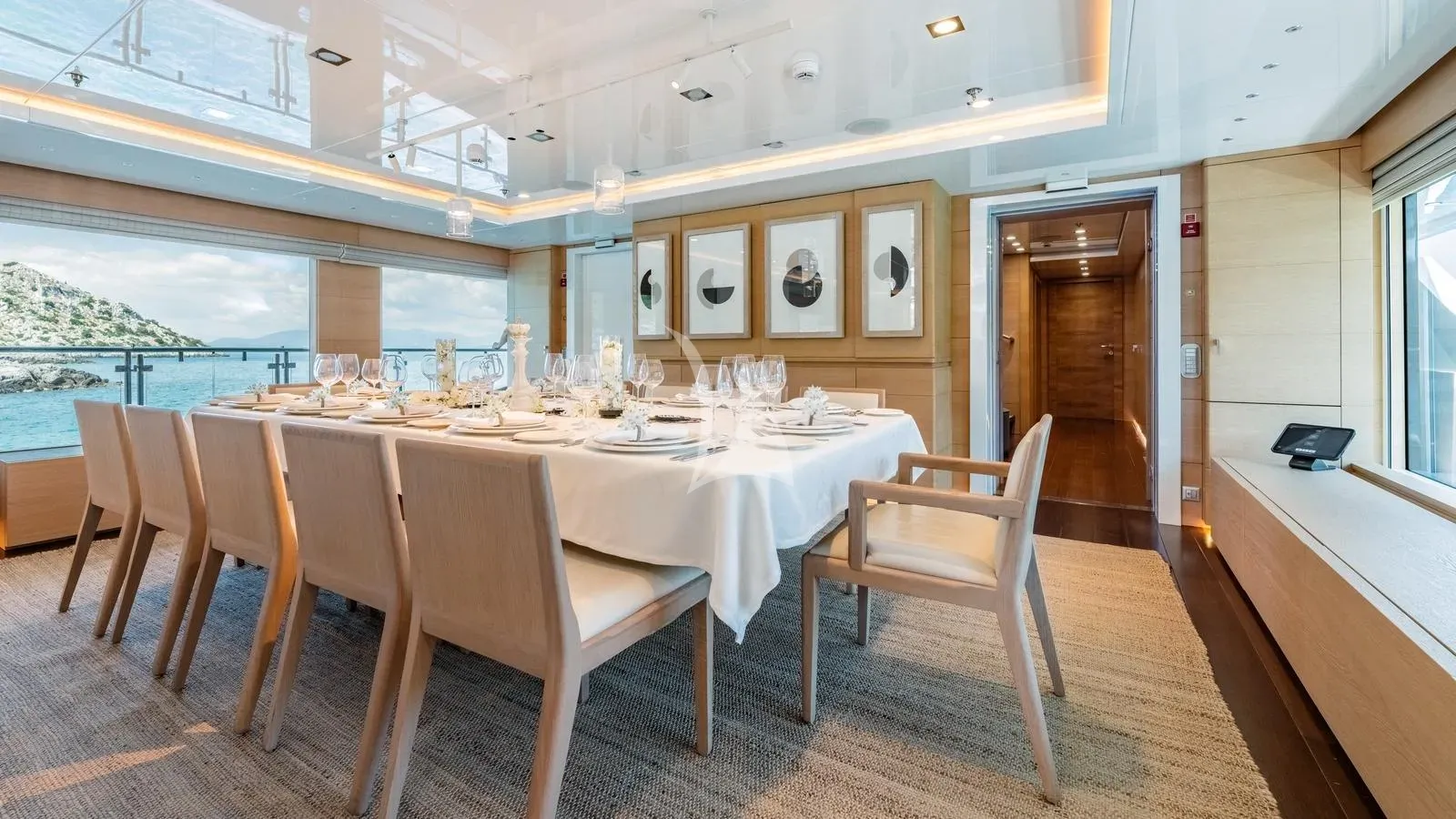 The yacht exudes understated elegance through its minimalist interior design, characterized by spacious layouts flooded with natural light. The carefully curated aesthetic showcases a seamless blend of natural woods and a soothing palette of neutral tones, creating a serene and inviting atmosphere. Clean lines and uncluttered spaces enhance the sense of tranquility, offering a refined and comfortable setting for those aboard to relax and unwind in style.