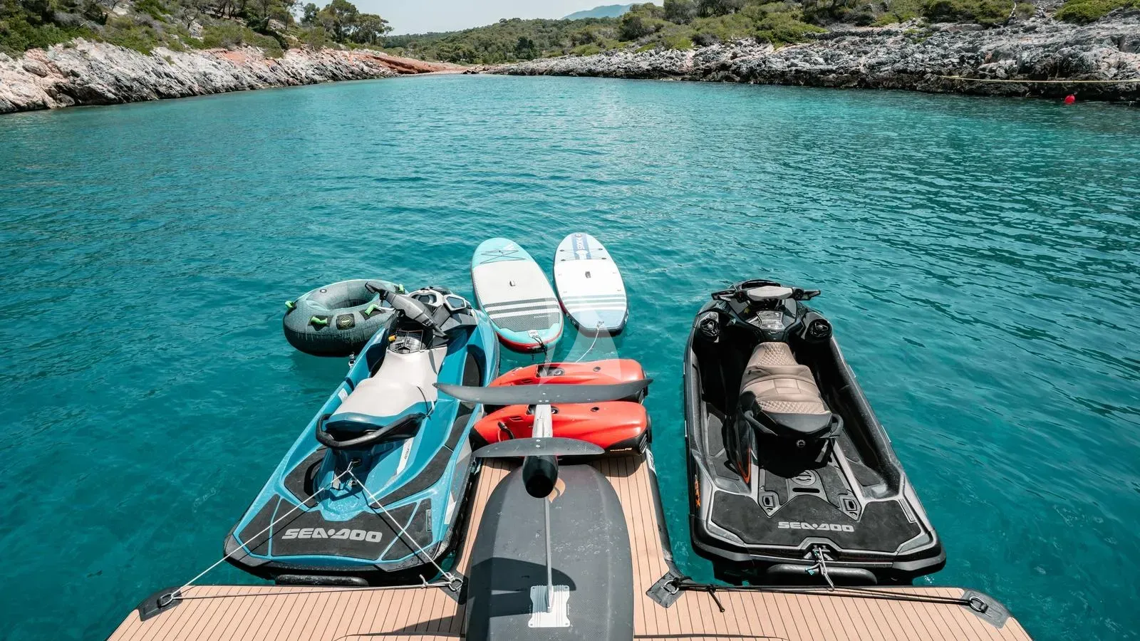 The exterior is a masterful extension of luxury living, featuring a diverse array of spaces designed for al-fresco enjoyment. Open-air dining awaits on various decks, each offering a unique perspective of the surrounding seascape. Ascend to the sky lounge, a sophisticated retreat that provides panoramic views while maintaining an intimate ambiance. Unwind in the on-deck Jacuzzi, where relaxation meets endless horizons. For those seeking an active escape, the yacht offers gym equipment for invigorating workouts. Guests can also enjoy countless hours of water-based entertainment, courtesy of an exceptional assortment of water toys, including a water slide.