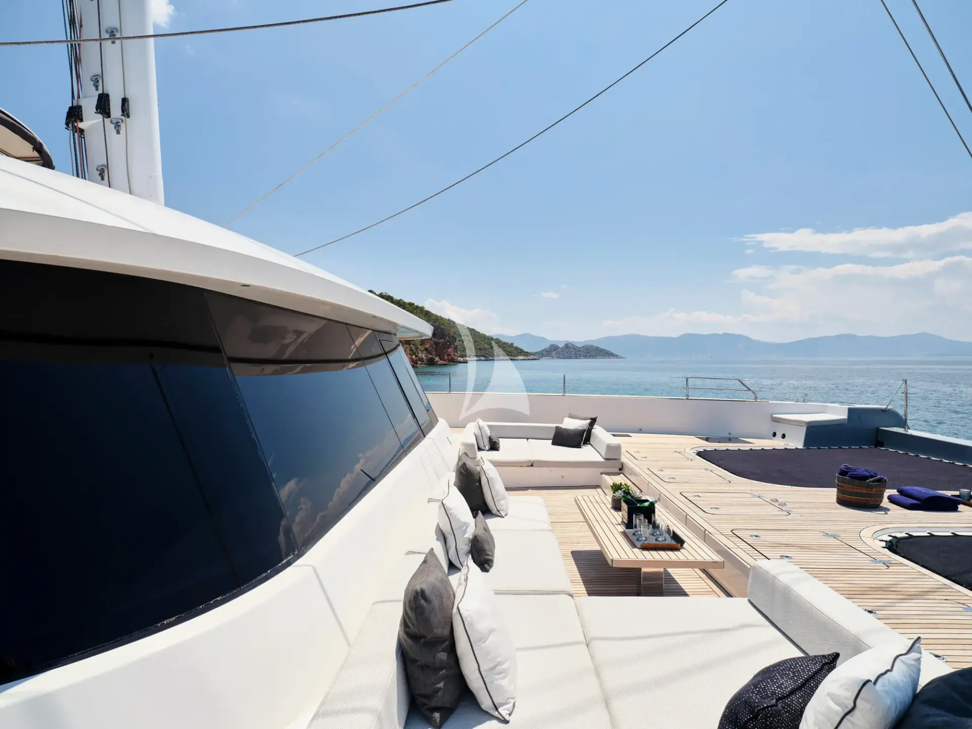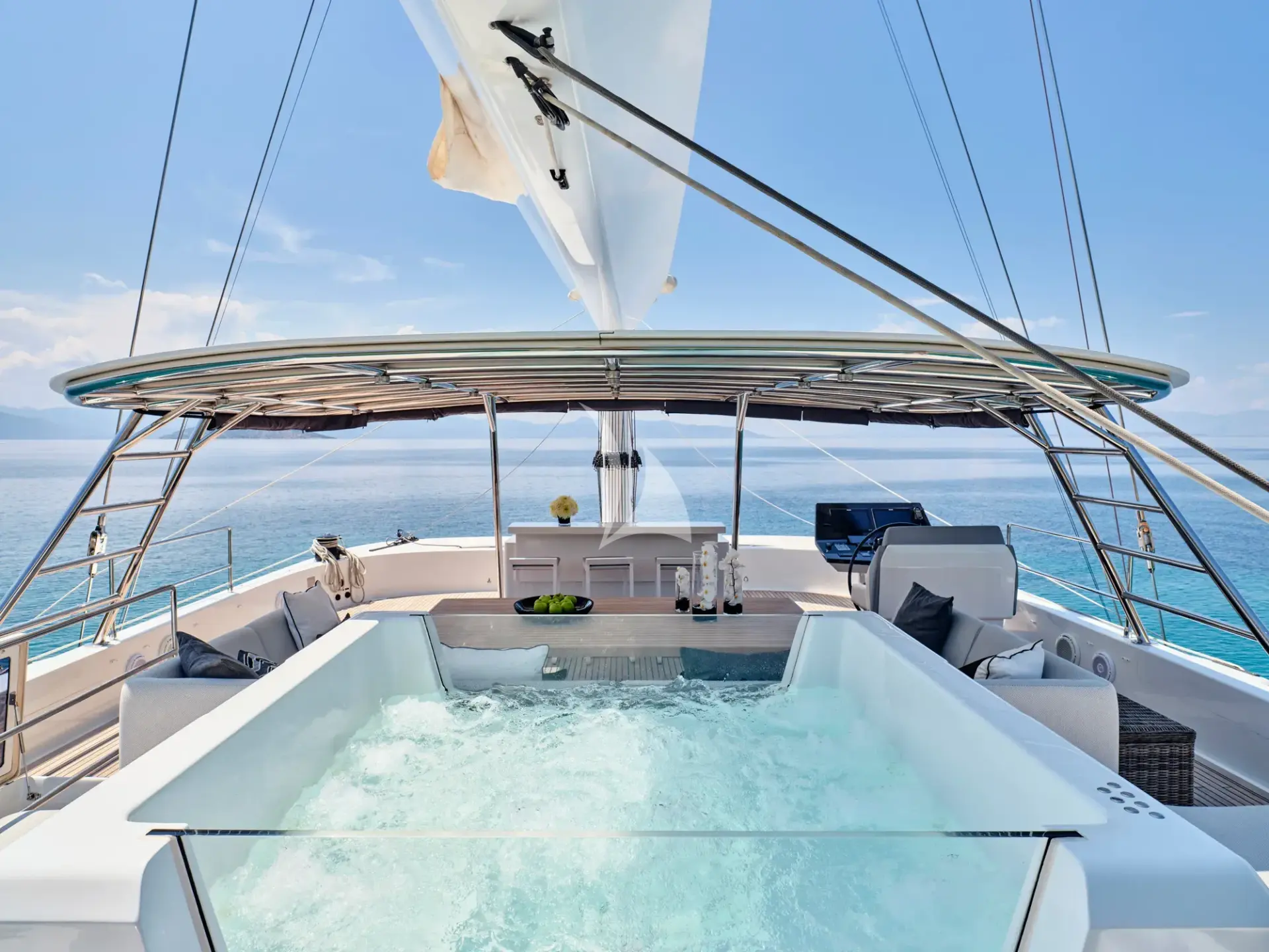 Her spacious aft cockpit seamlessly connects with the stylish open-plan saloon, creating a flowing indoor-outdoor space bathed in natural light and surrounded by panoramic sea views. Whether enjoying a gourmet meal or simply taking in the scenery, every moment onboard feels effortless and inspiring. The flybridge is a true highlight — featuring a Jacuzzi, wet bar, barbecue, dining area, and sunbeds — the perfect setting for sunset cocktails, alfresco dining, or starlit relaxation. Meanwhile, the hydraulic platform transforms into a private beach club on the water, providing easy access to the sea and a stylish place to unwind.