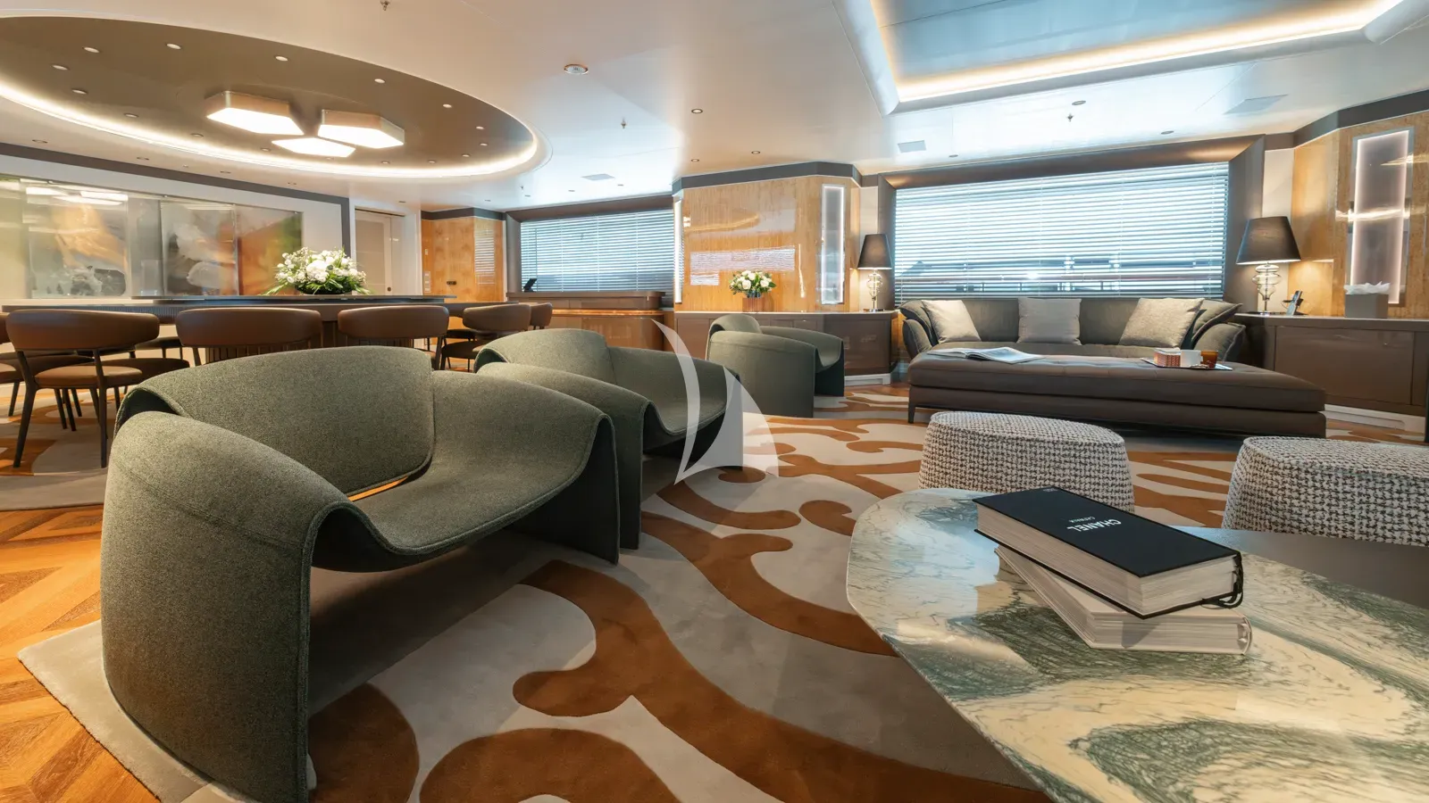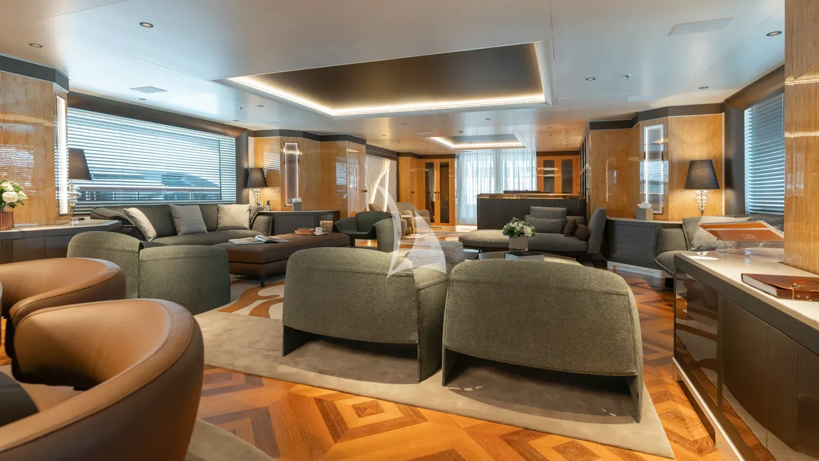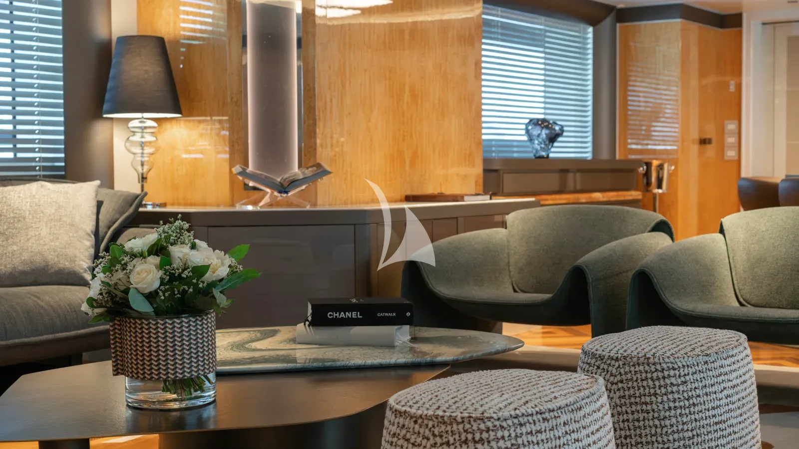 AELIA’s opulent interiors are marked by rich textures, plush furnishings, and grandeur without excess. She accommodates 12 guests across eight spacious cabins, including an exceptional layout with two full-beam master suites on the upper deck; a rare offering for this size category. Six double cabins and two twin offer flexible arrangements, and all benefit from elegant ensuites. The main salon is warm and inviting with oversized sofas, while the formal dining room, complete with a bar and chandelier lighting, sets the stage for celebratory meals.