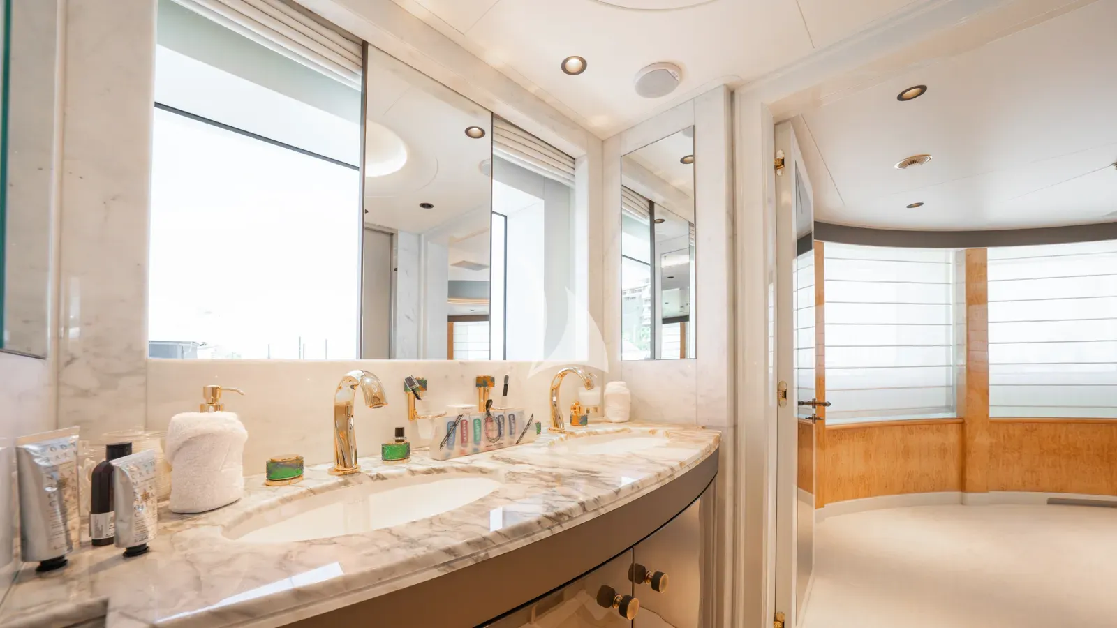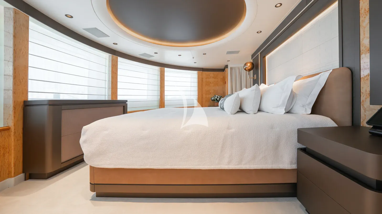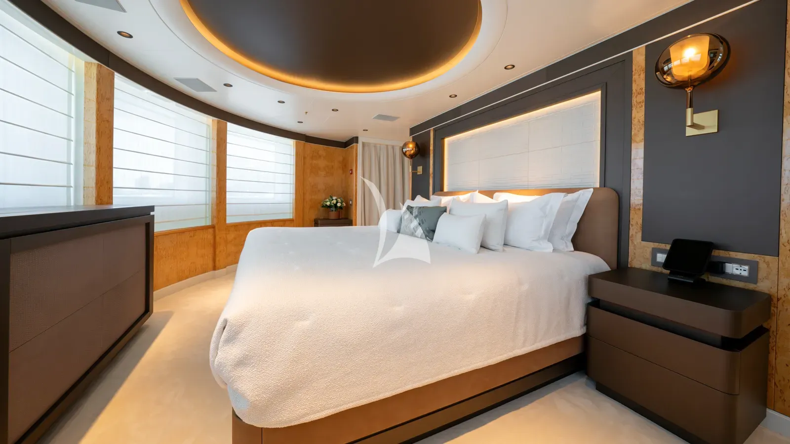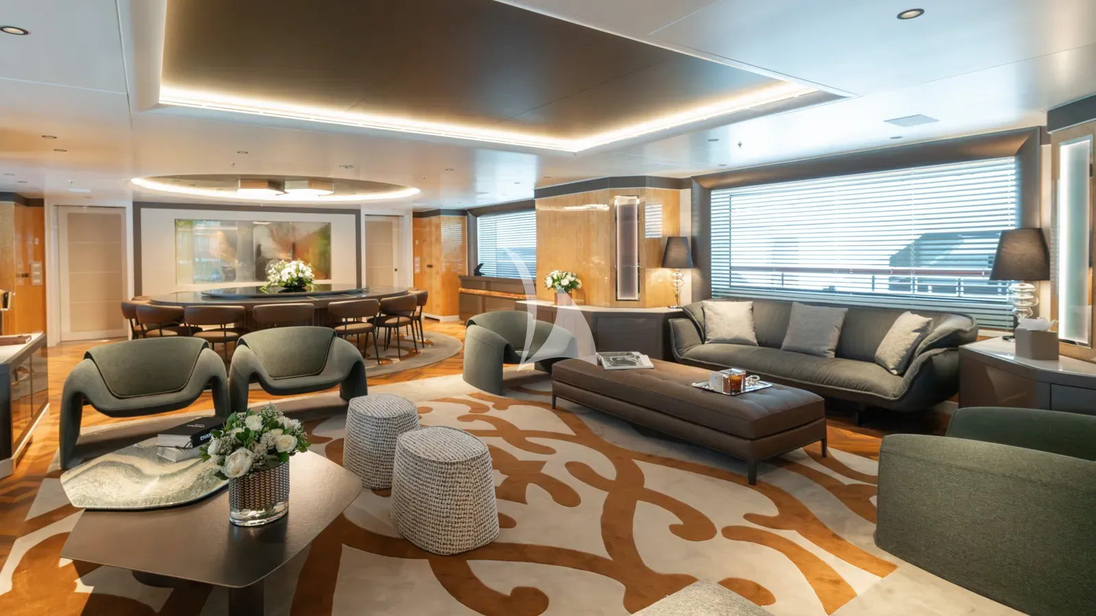 AELIA’s opulent interiors are marked by rich textures, plush furnishings, and grandeur without excess. She accommodates 12 guests across eight spacious cabins, including an exceptional layout with two full-beam master suites on the upper deck; a rare offering for this size category. Six double cabins and two twin offer flexible arrangements, and all benefit from elegant ensuites. The main salon is warm and inviting with oversized sofas, while the formal dining room, complete with a bar and chandelier lighting, sets the stage for celebratory meals.