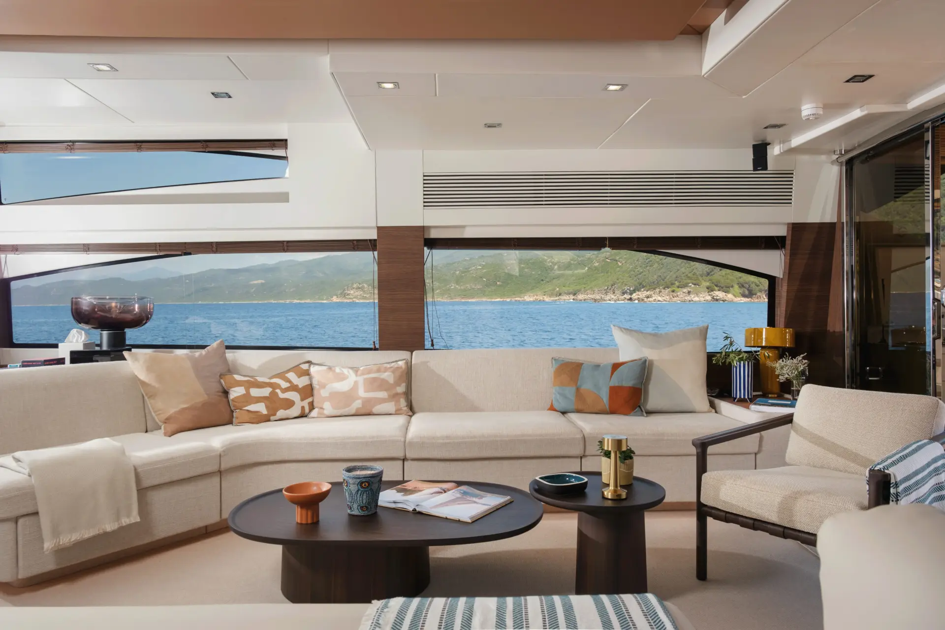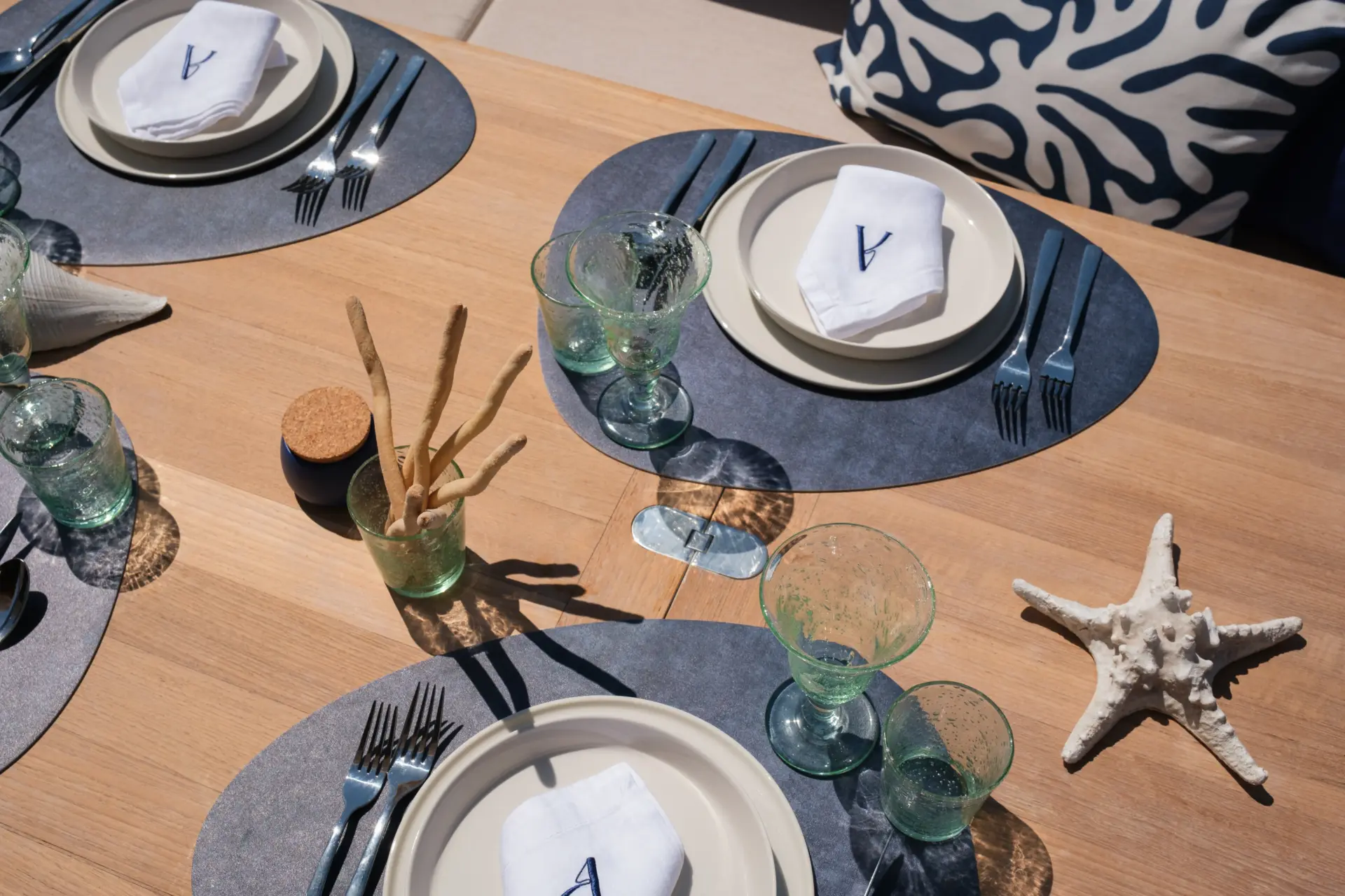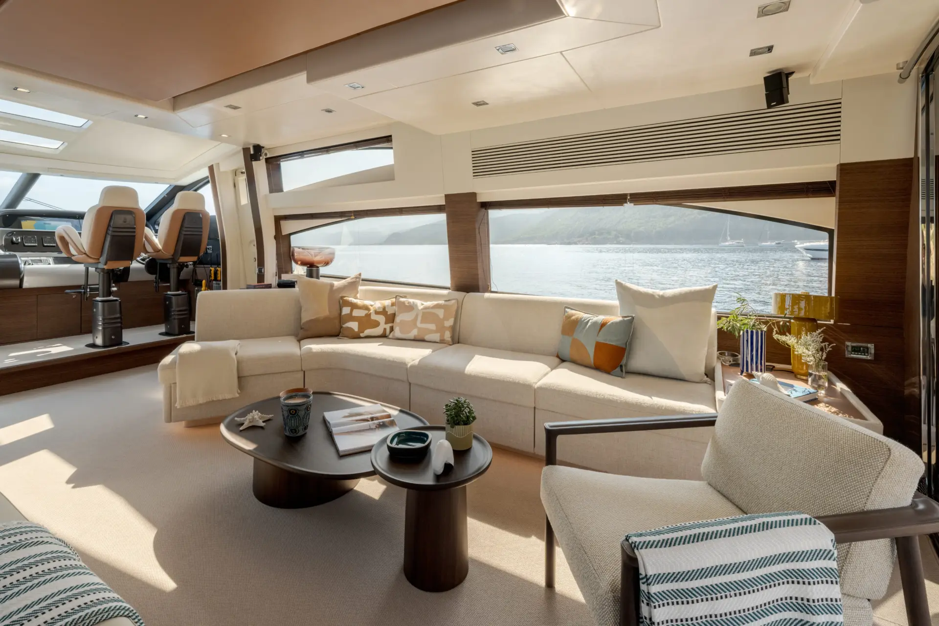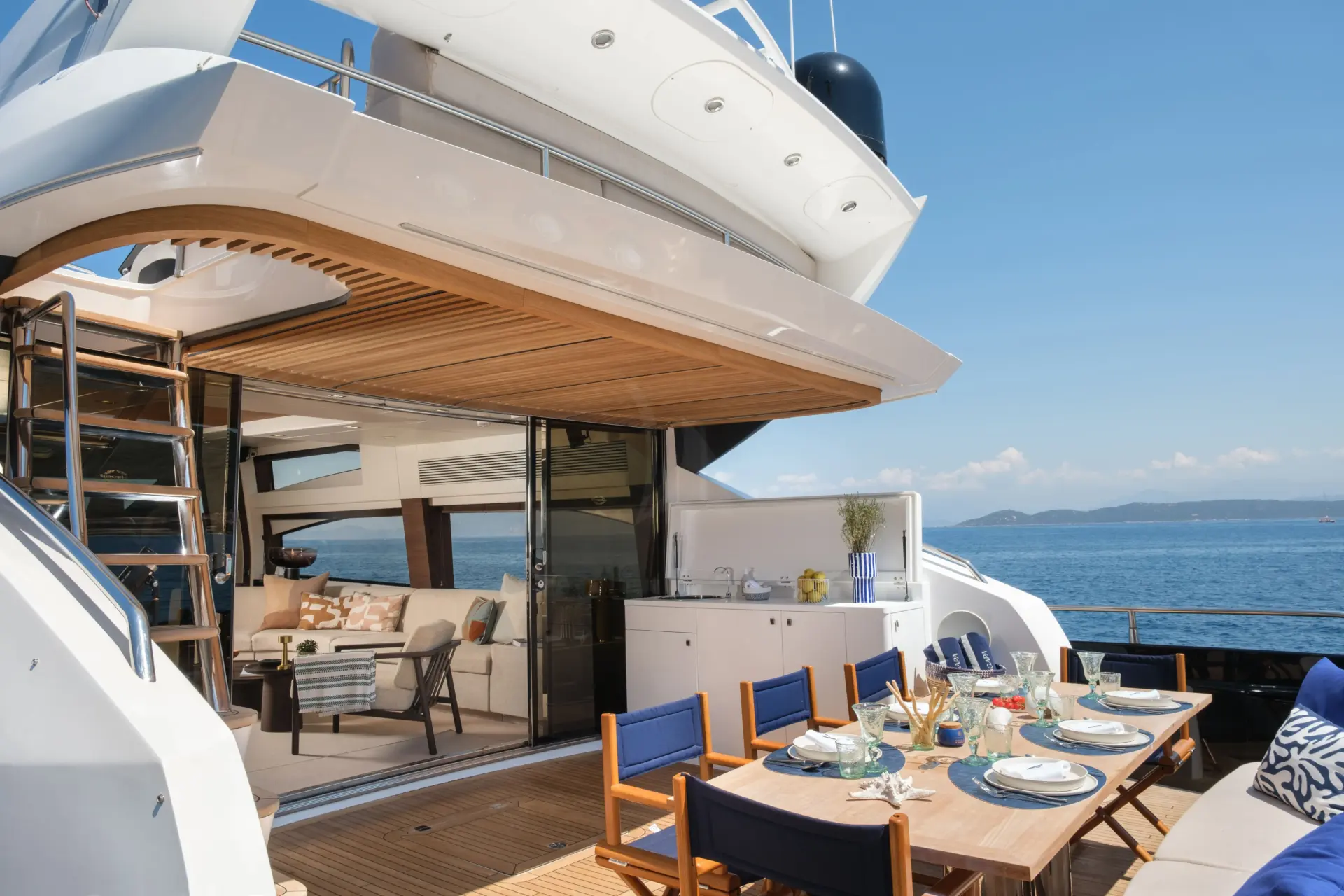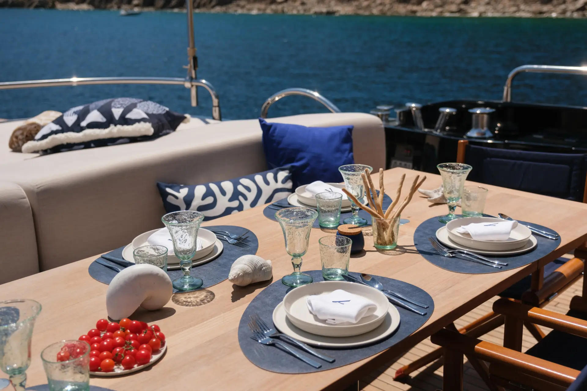 Her inviting exterior spaces are designed for effortless sociability and sun-soaked leisure. Relax on expansive foredeck sunpads, gather for al fresco dining in the stylish aft cockpit, or soak up panoramic views from the open sun deck. Steps from the cockpit lead directly to the water via a generous swim platform, enhanced further by a floating dock with sea pool – perfect for spontaneous dips and water play.
