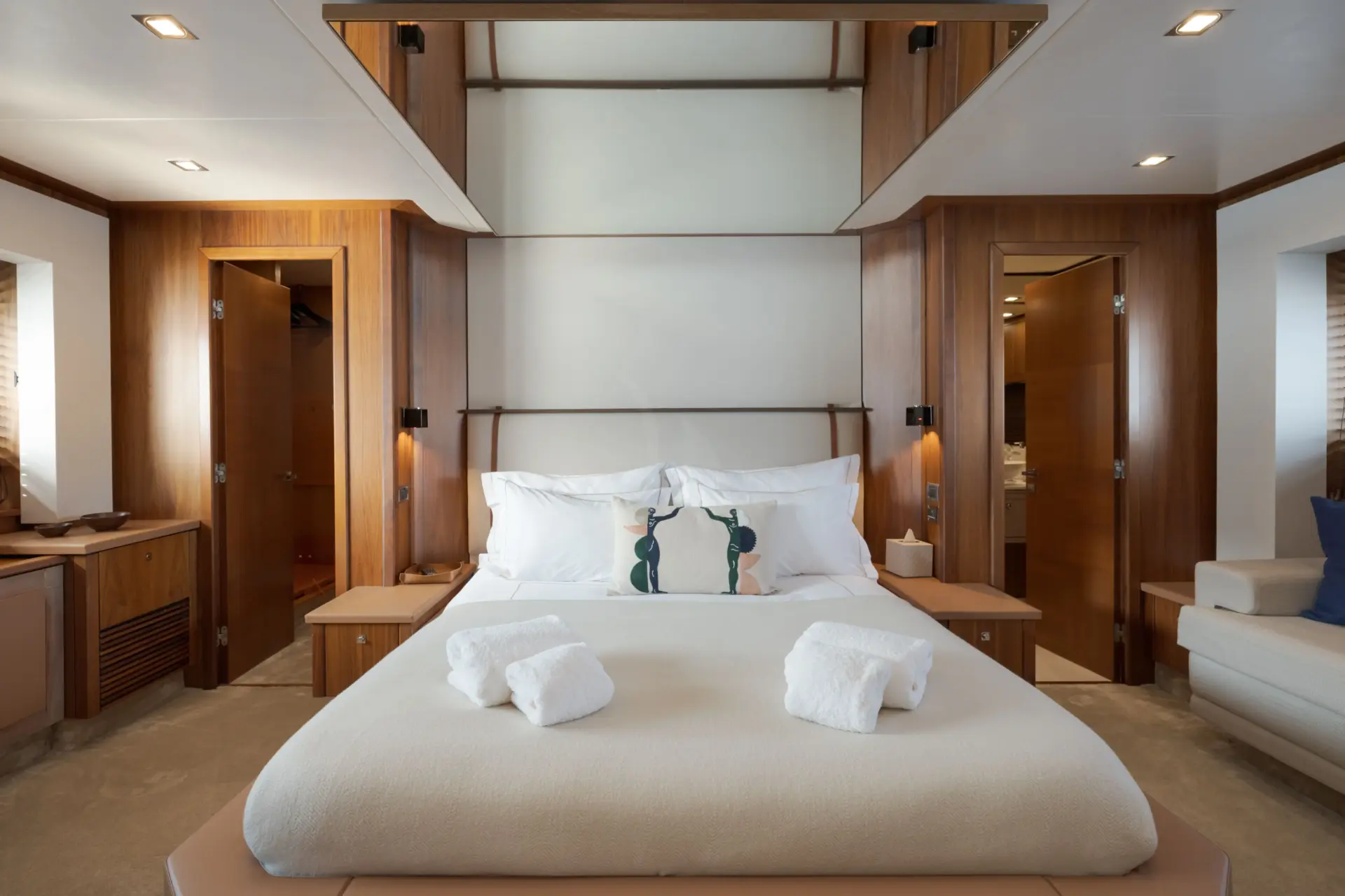 Agapa comfortably accommodates up to nine guests across four well-appointed cabins: a full-beam master suite, one double cabin, and two twin cabins - one with a Pullman berth - all serviced by a professional crew of three ensuring seamless hospitality at sea.