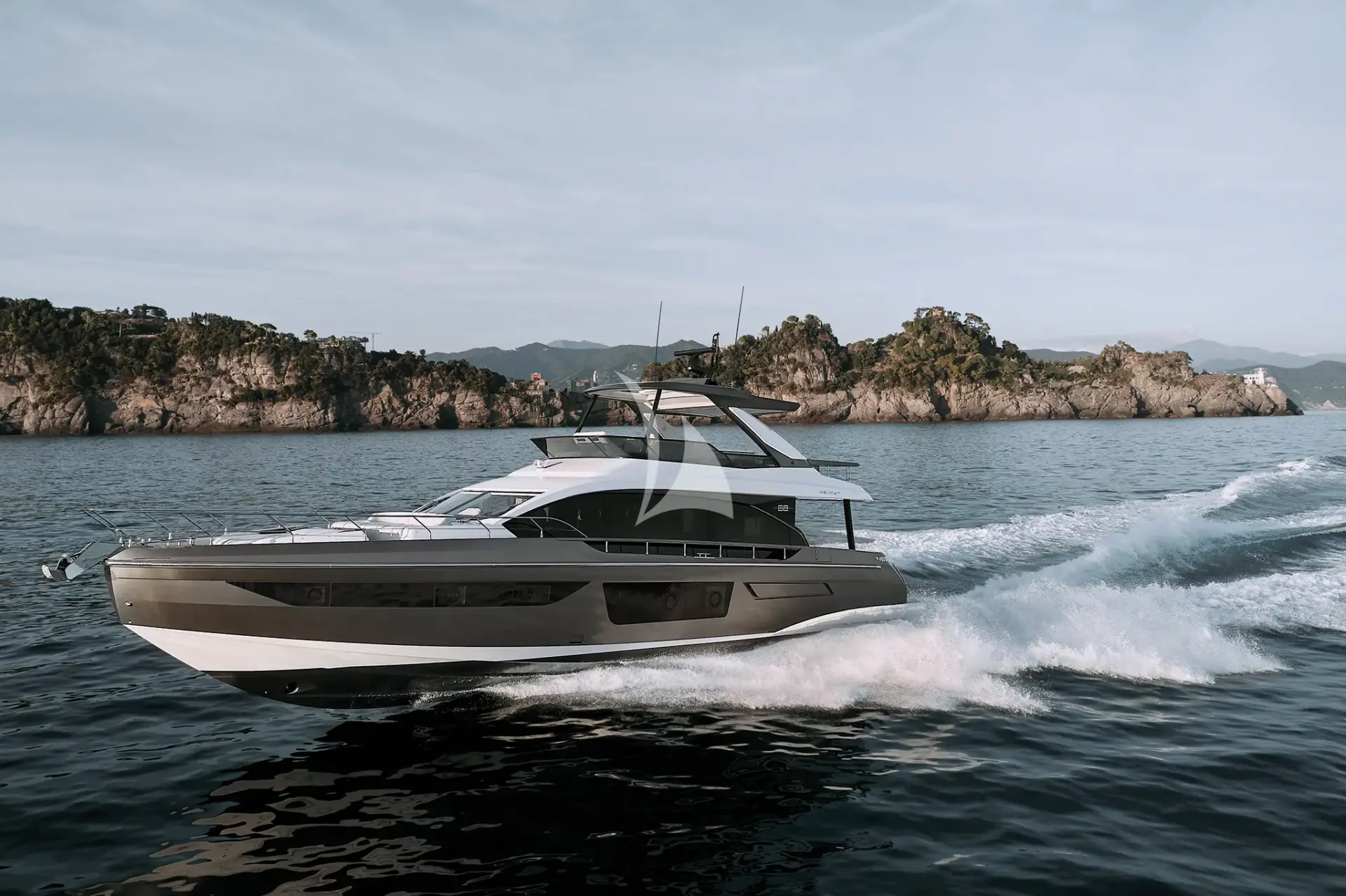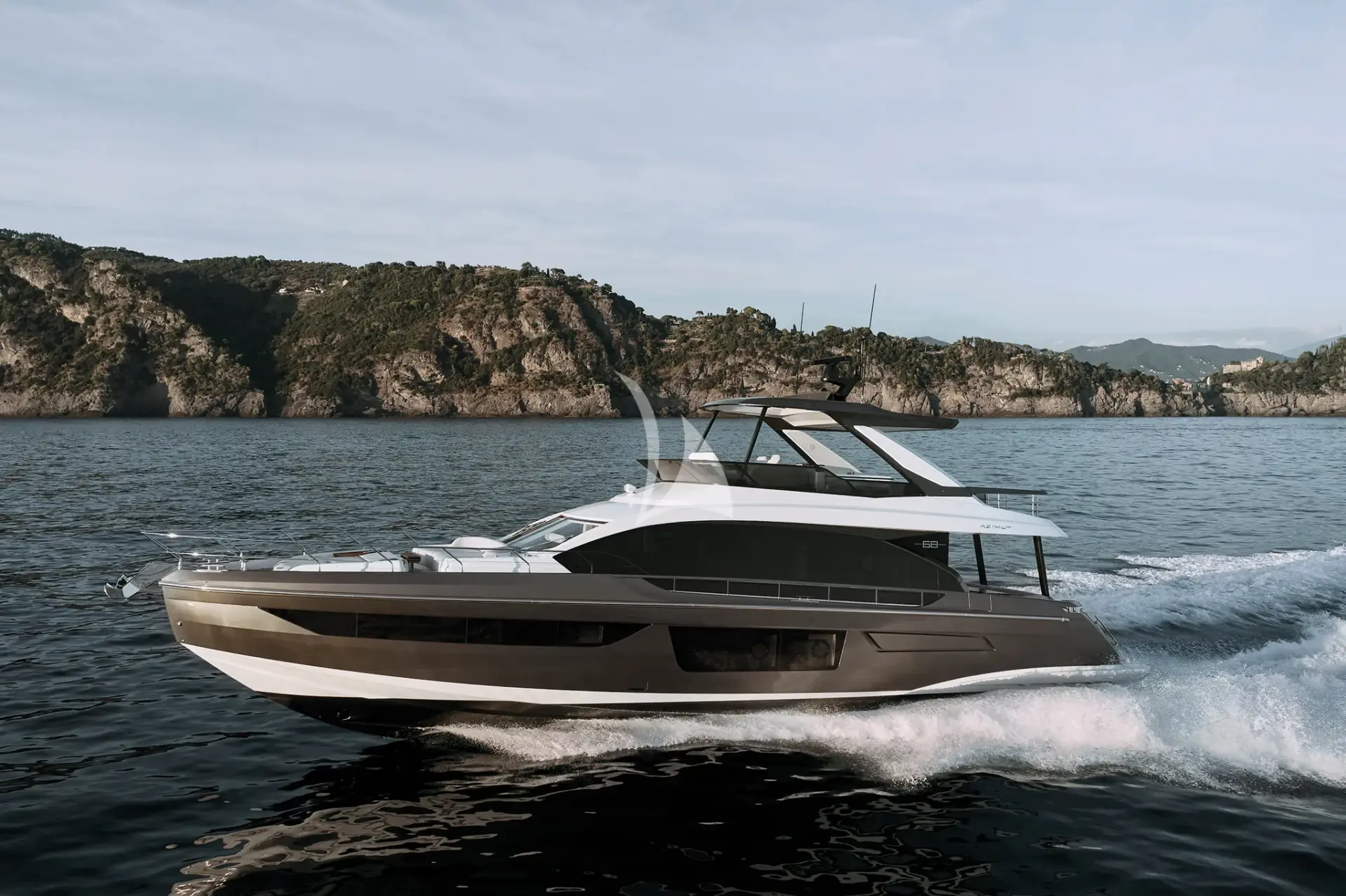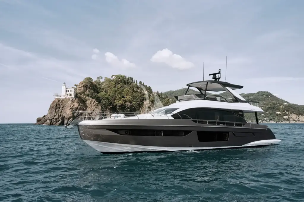AGLAYA's exterior features a sleek and sporty design, reflecting the timeless elegance of the Azimut 68 Fly model.