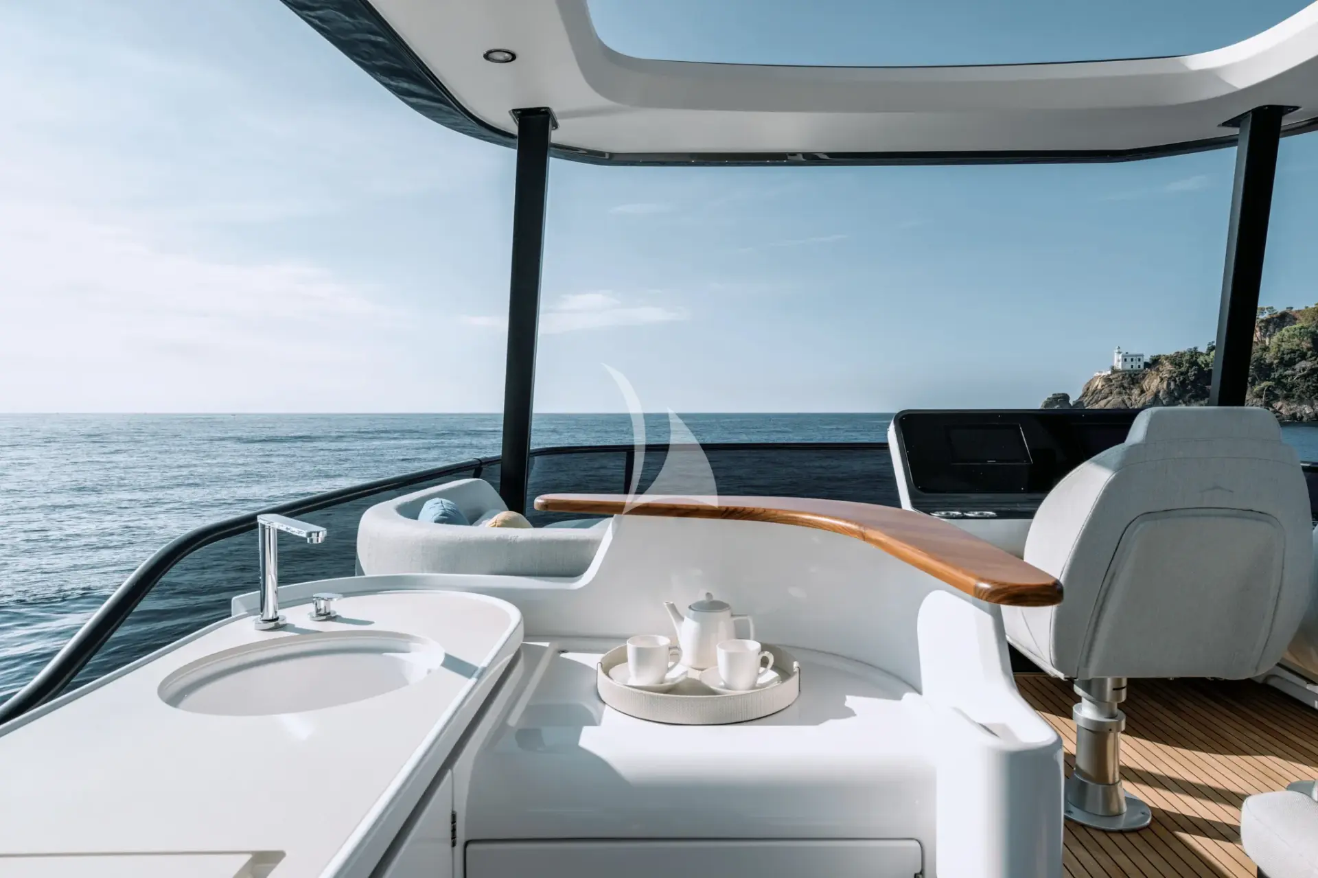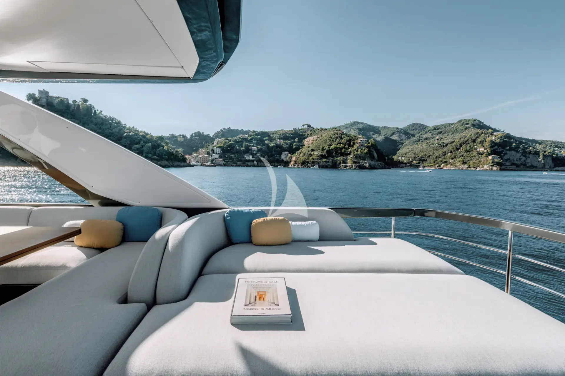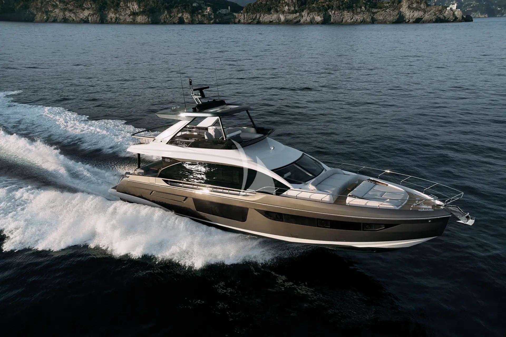 AGLAYA's exterior features a sleek and sporty design, reflecting the timeless elegance of the Azimut 68 Fly model.