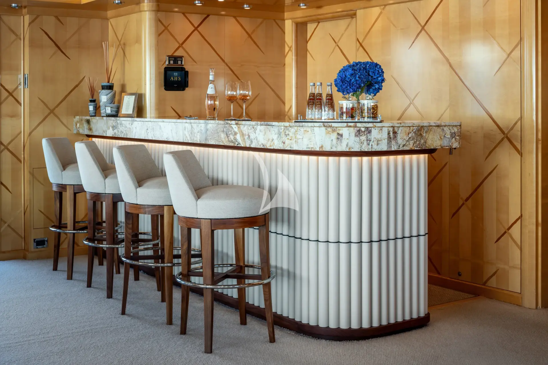 Sheltered dining adequate for up to 18 people, a stunning waterfall pool of more than 19,000 litres (5,000 gallons), a dedicated gym area and a beautiful classic stern with contemporary on-water access via the yachts beach club. AHS also knows a thing or two about fun on the water, with an extensive selection of action packed water toys and accessories for you and your guests to enjoy whilst on charter. Principle among these are waterslides letting guests speed from the sun deck to the water in seconds. Take to the sea on the Jet Skis offering you power and control on the water. In addition there are towable toys offering fun and adventure. If that isn't enough AHS also features waterskis, a seabob, beach games, inflatable water toys and paddleboards. When it comes to Tenders, AHS has you covered - with four tenders, including a 9.7m/31'10" Royal Denship Limo Tender, 8.3m/27'65" Royal Denship, 5.5m/18'04" Nautica Rib.