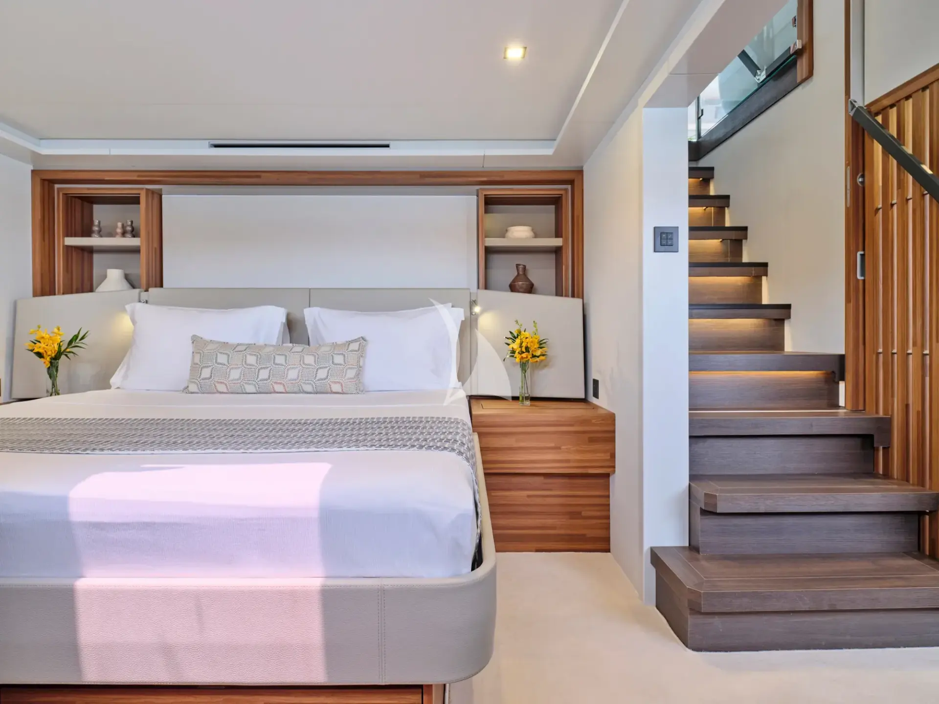 Inside, the beautifully appointed main saloon welcomes guests with refined décor, an indoor dining area, and a galley-down layout designed for both comfort and functionality. Every detail reflects superior craftsmanship, cutting-edge technology, and the finest materials.