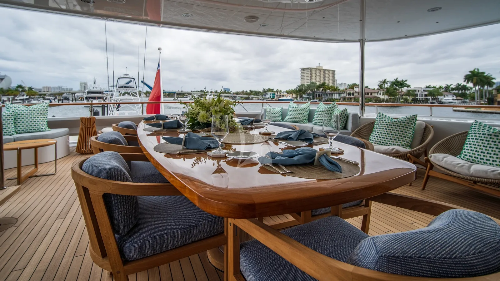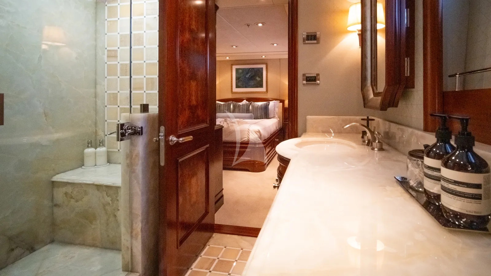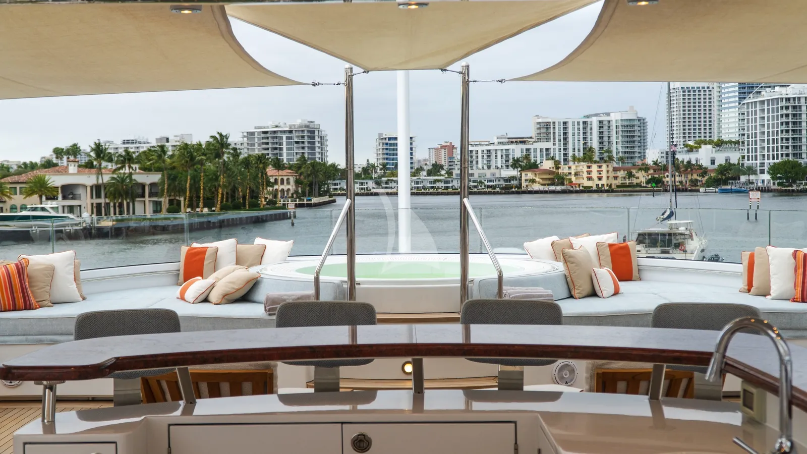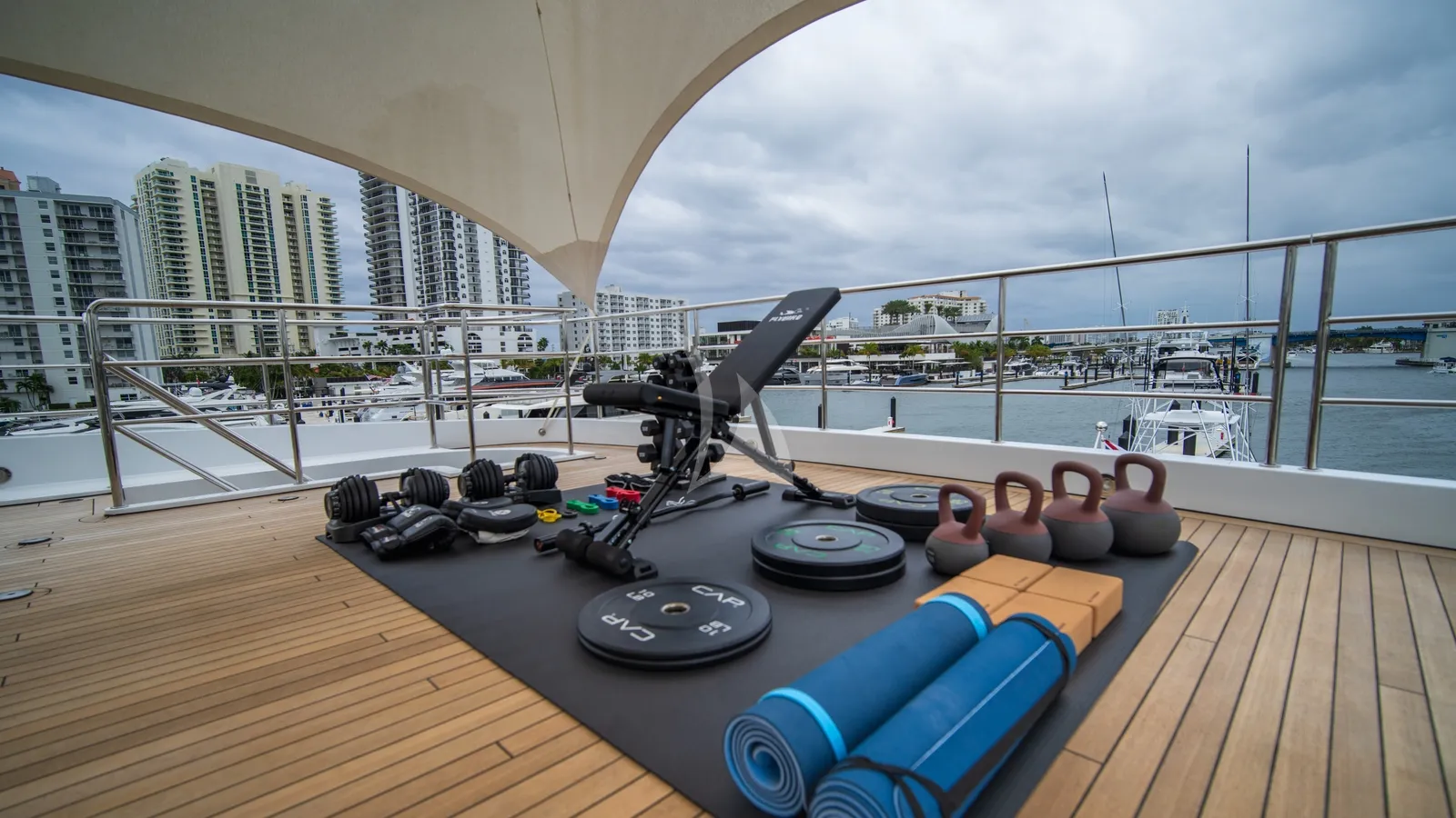 Watermakers, Air conditioning, Stabilisers underway, Stabilisers at anchor, Aft platform, Beach club, Master on main deck, Deck Jacuzzi, Movies library, Music library, Smart TV, TV in all cabins, TV in saloon, WiFi connection, Bluetooth speakers/sound system connection