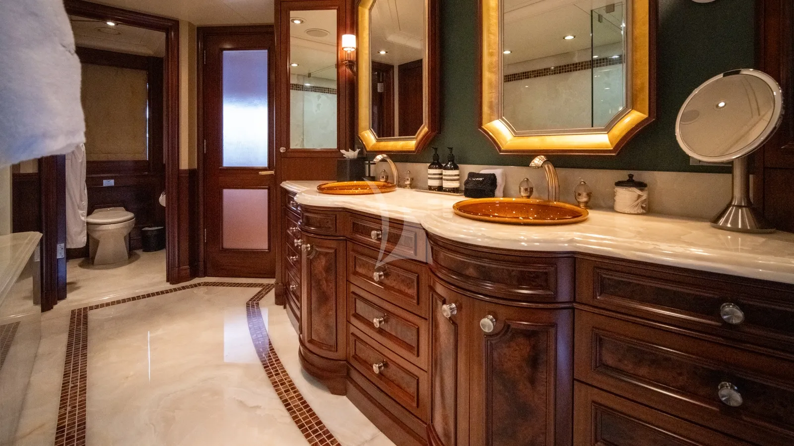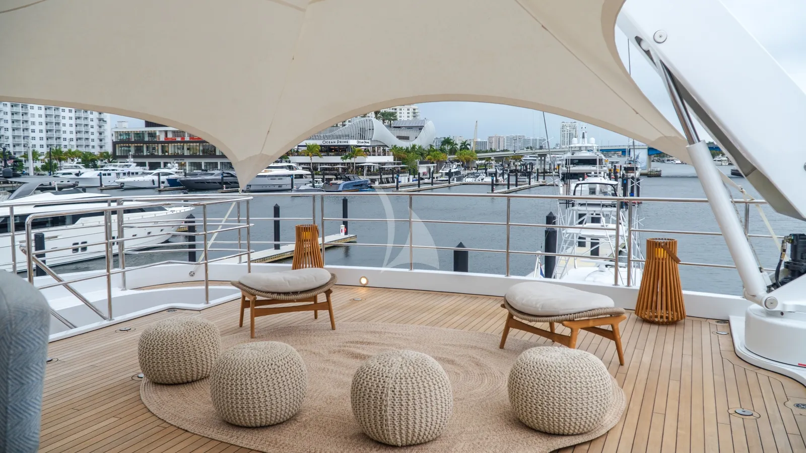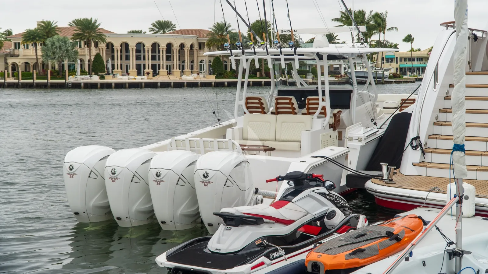Watermakers, Air conditioning, Stabilisers underway, Stabilisers at anchor, Aft platform, Beach club, Master on main deck, Deck Jacuzzi, Movies library, Music library, Smart TV, TV in all cabins, TV in saloon, WiFi connection, Bluetooth speakers/sound system connection