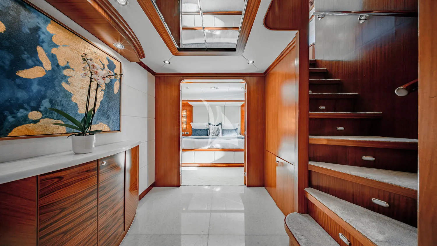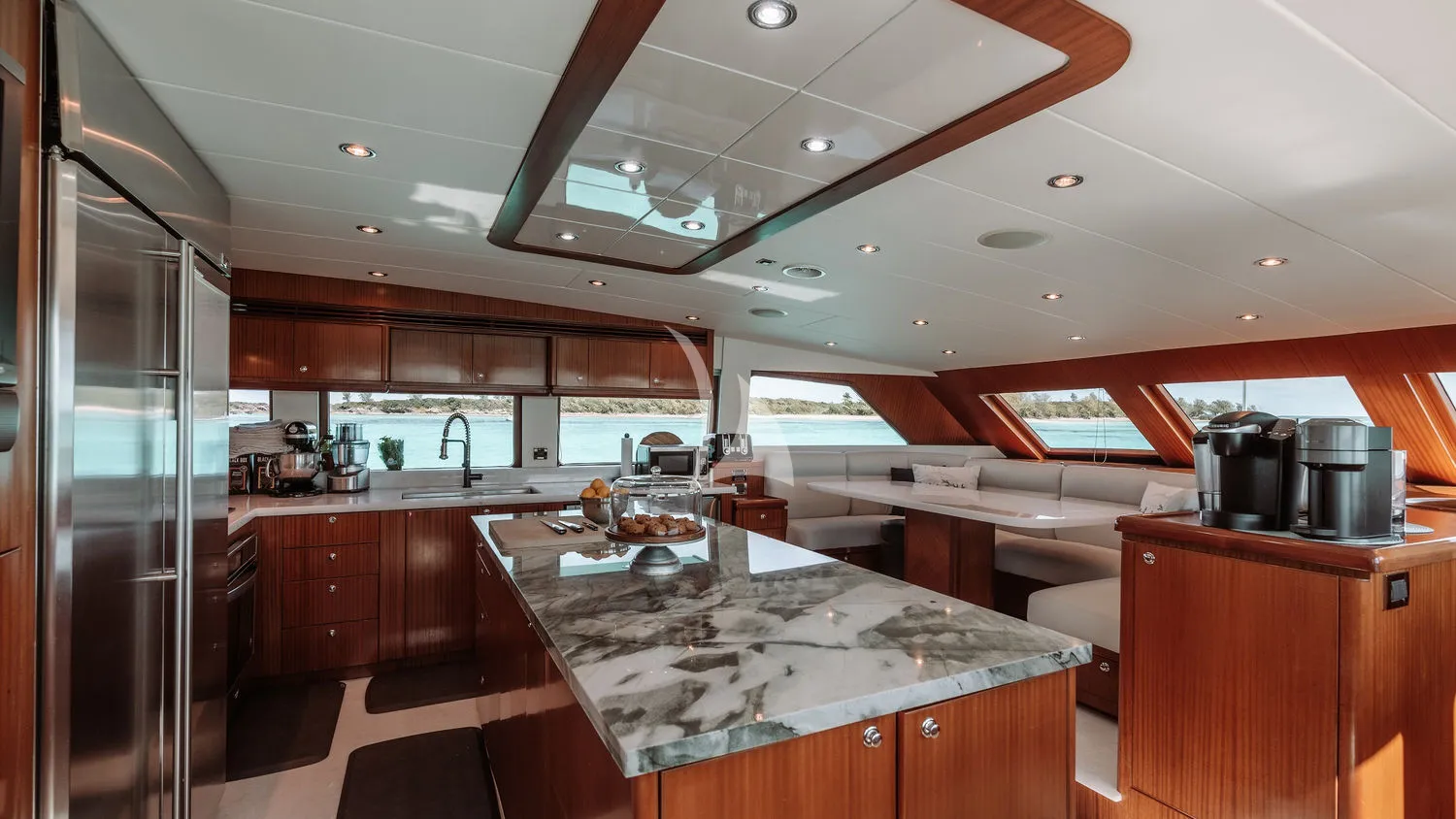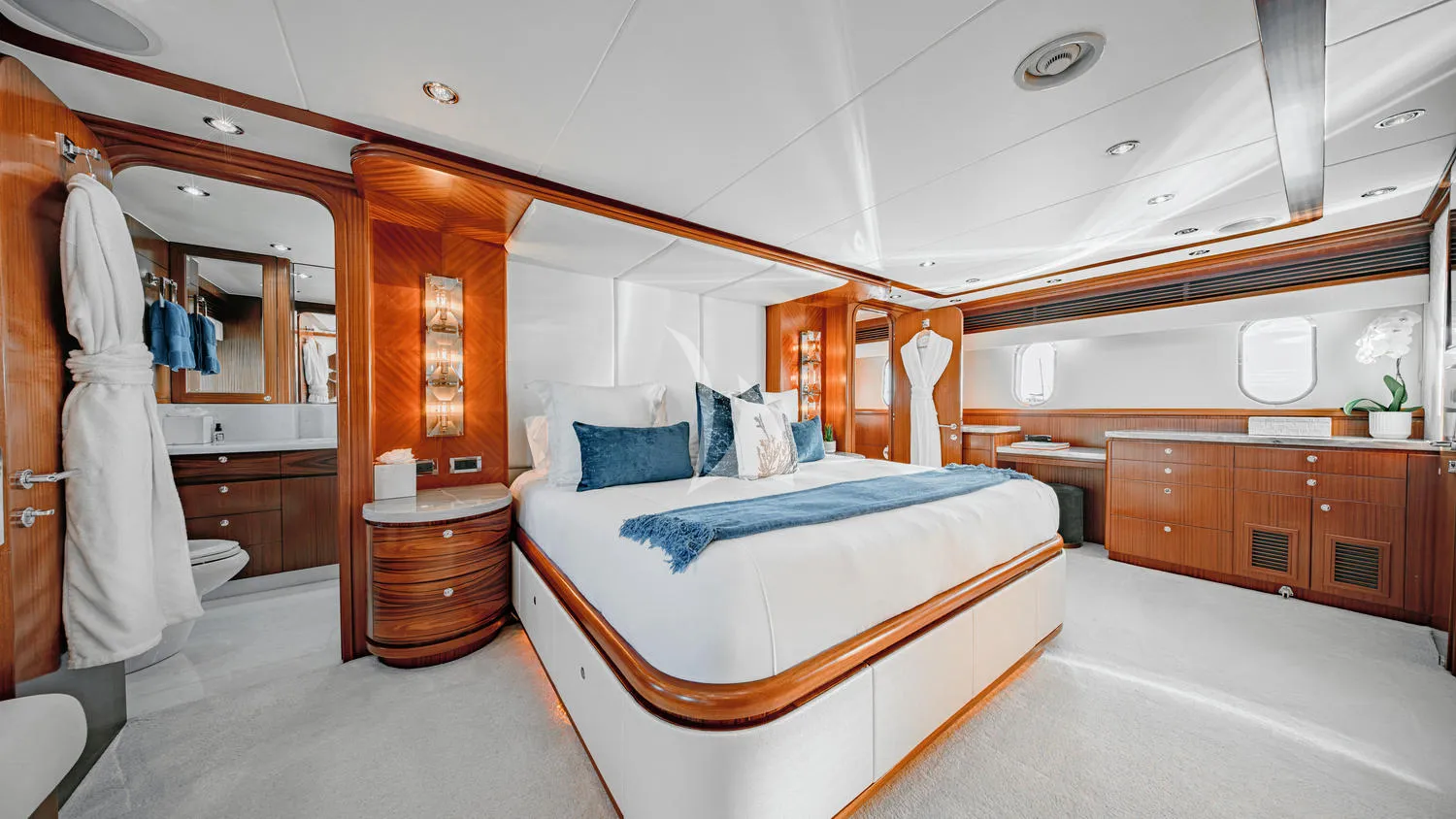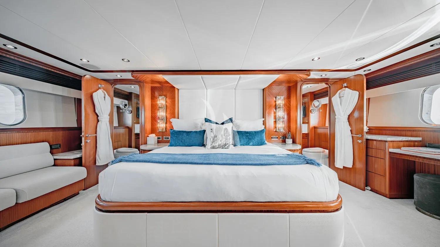 Accommodating up to 10 guests in five staterooms, BEACHFRONT offers an inviting and luxurious retreat. The full-beam master suite features double walk-in closets and a private lounge, providing a sanctuary of relaxation. Four additional well-appointed staterooms, including a VIP forward, all feature en-suite bathrooms. A guest common area is situated forward, creating a comfortable space for socializing and unwinding.