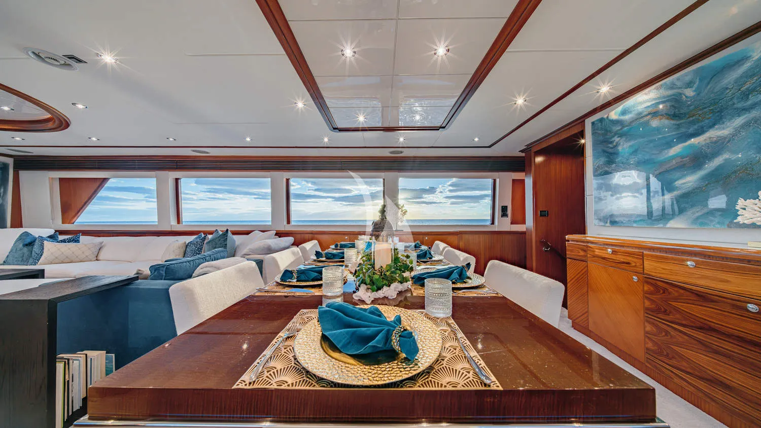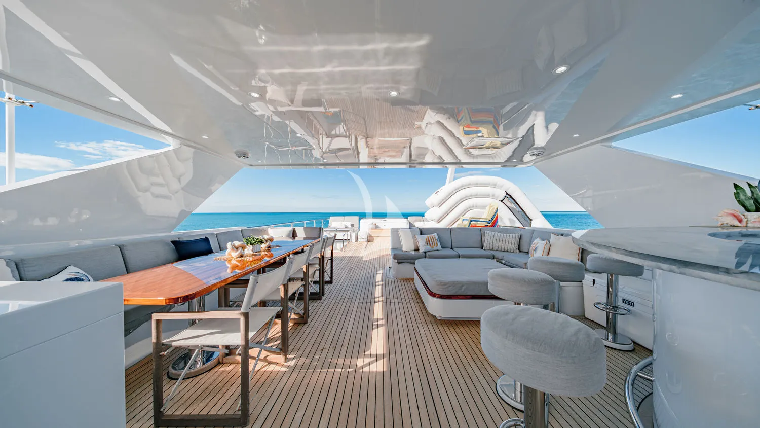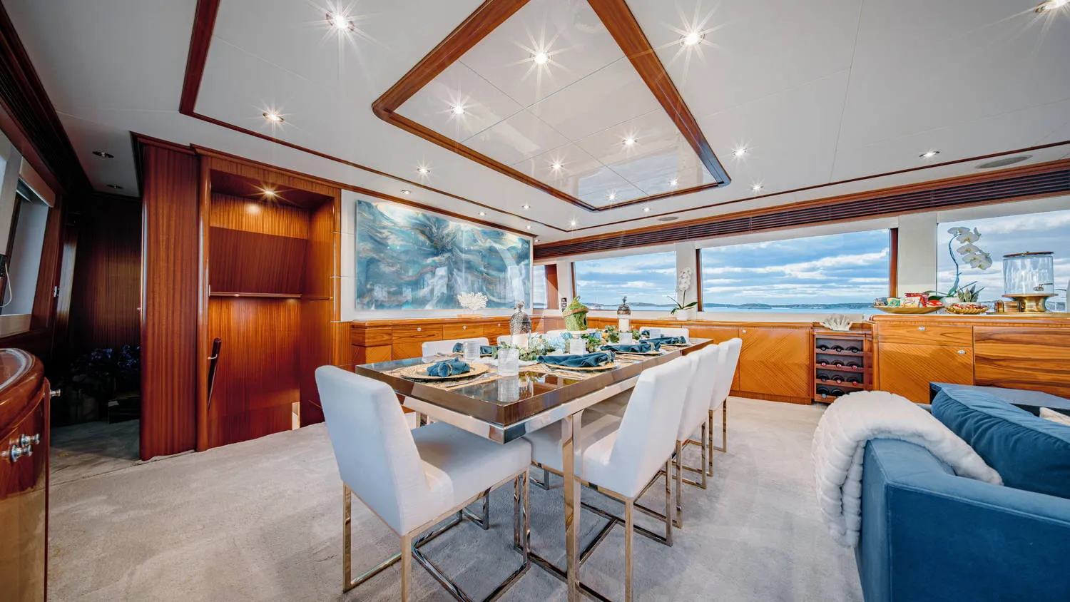 Accommodating up to 10 guests in five staterooms, BEACHFRONT offers an inviting and luxurious retreat. The full-beam master suite features double walk-in closets and a private lounge, providing a sanctuary of relaxation. Four additional well-appointed staterooms, including a VIP forward, all feature en-suite bathrooms. A guest common area is situated forward, creating a comfortable space for socializing and unwinding.