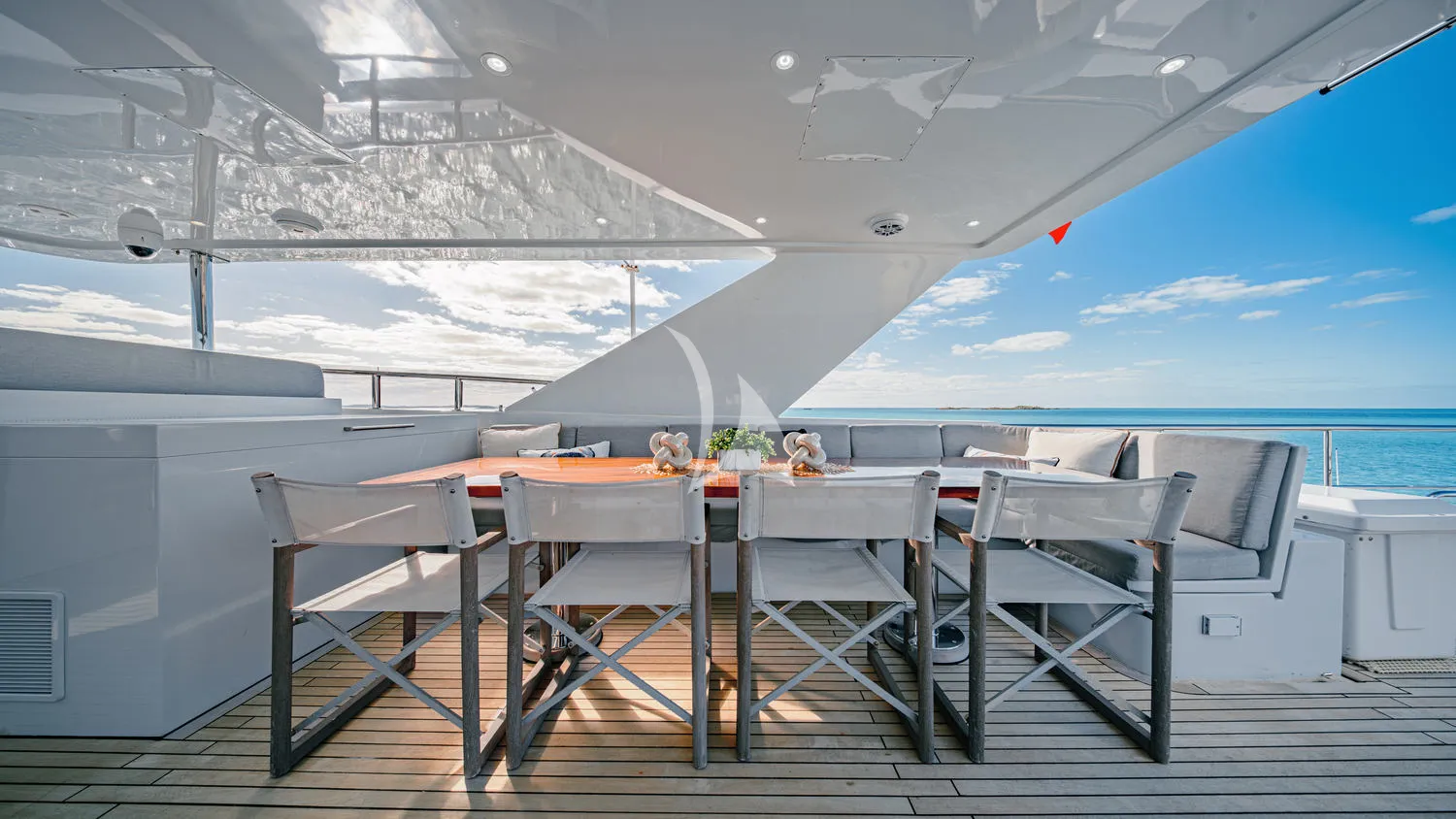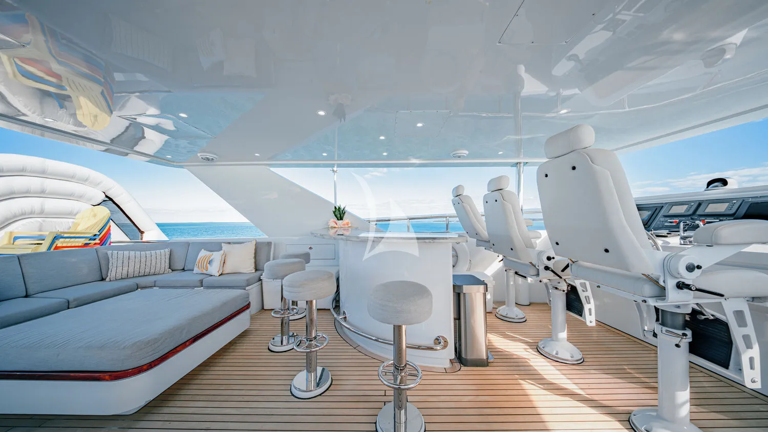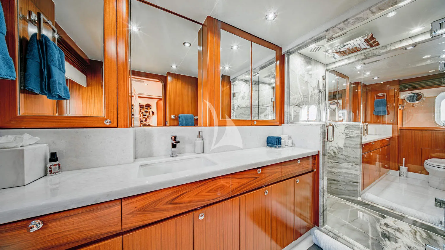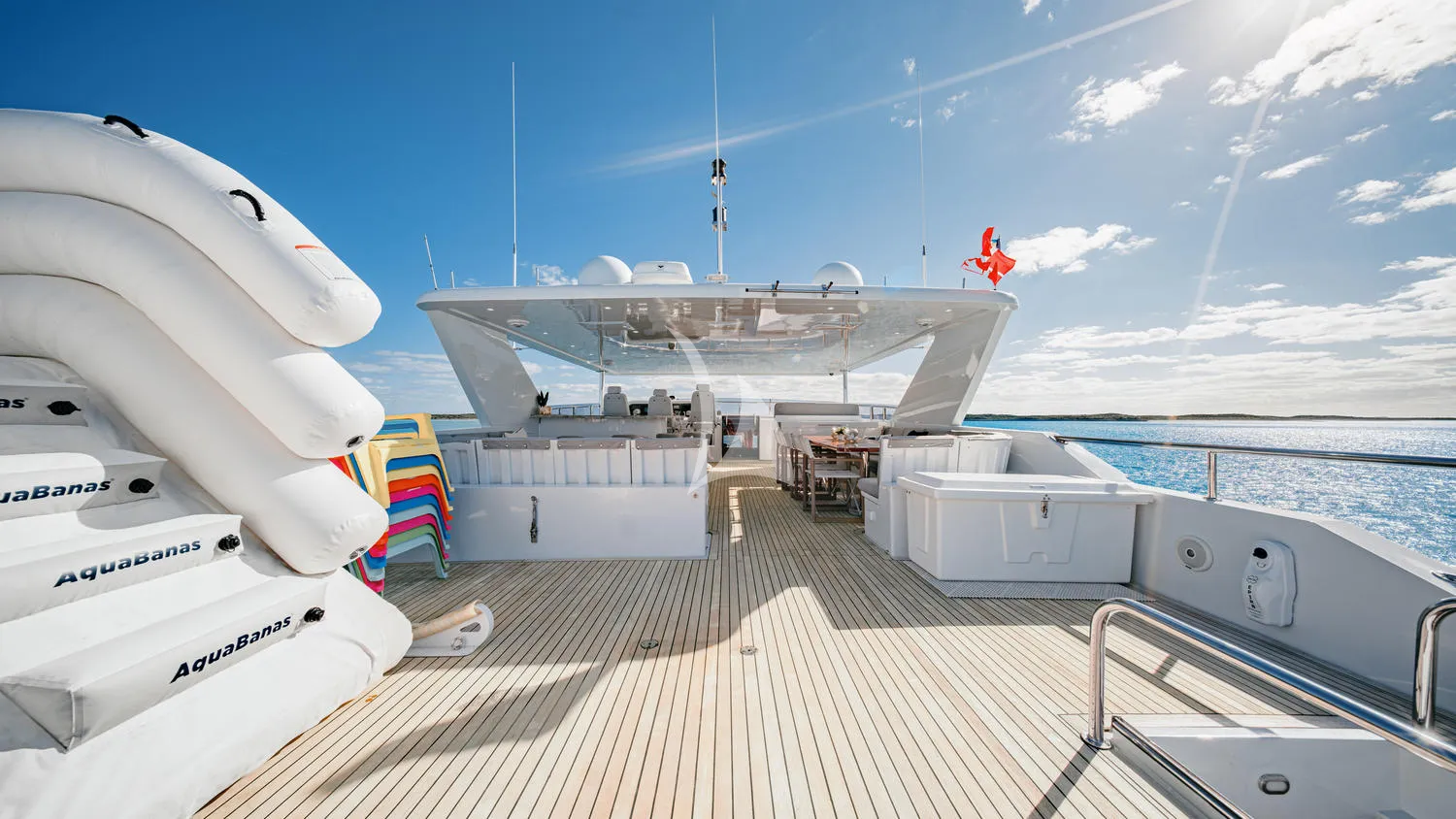 Accommodating up to 10 guests in five staterooms, BEACHFRONT offers an inviting and luxurious retreat. The full-beam master suite features double walk-in closets and a private lounge, providing a sanctuary of relaxation. Four additional well-appointed staterooms, including a VIP forward, all feature en-suite bathrooms. A guest common area is situated forward, creating a comfortable space for socializing and unwinding.