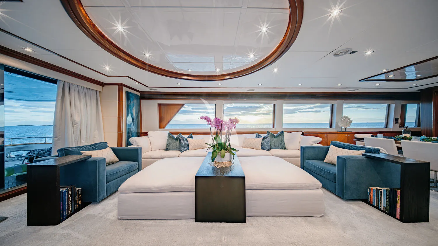 BEACHFRONT’s interior exudes contemporary elegance, designed with both comfort and versatility in mind. She effortlessly adapts to any occasion, whether entertaining guests or offering a serene retreat at sea. A high-tech home theater boasts a collection of over 500 HD movies, complemented by a music library of more than 70,000 songs. Airplay broadcasting is available throughout, ensuring seamless audio experiences in nearly every space on board.