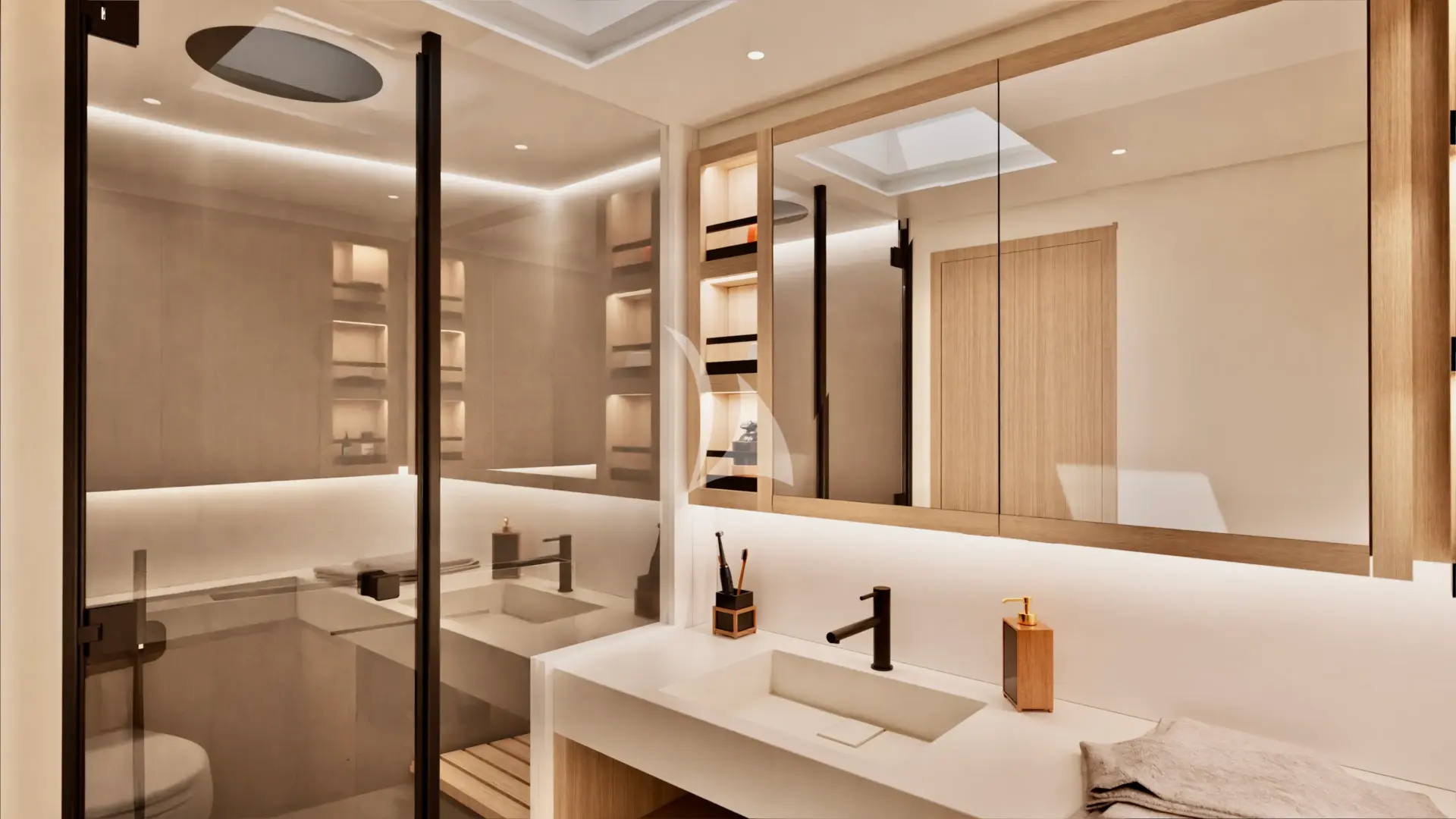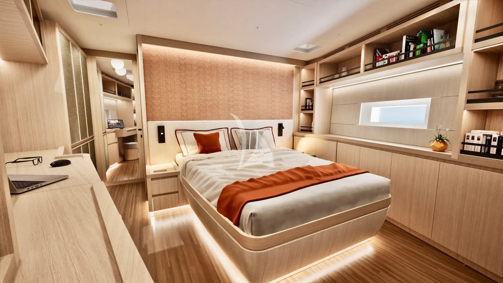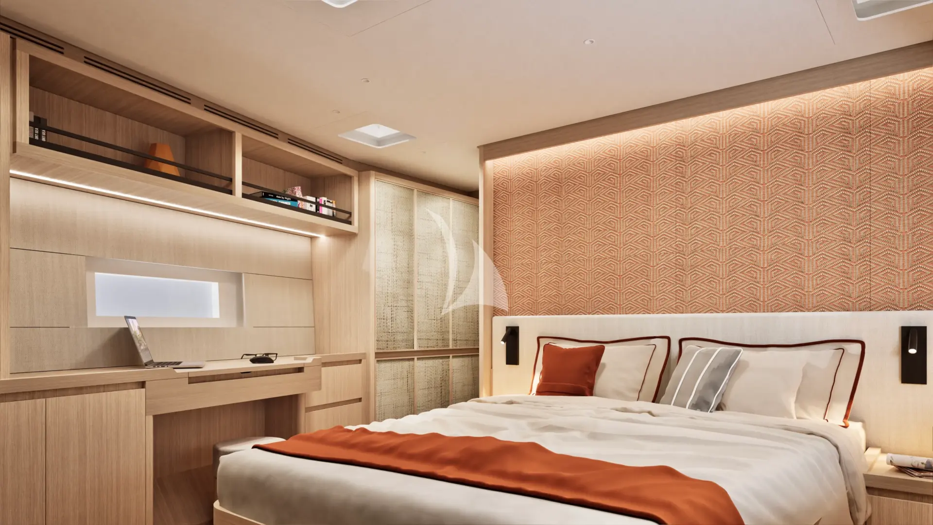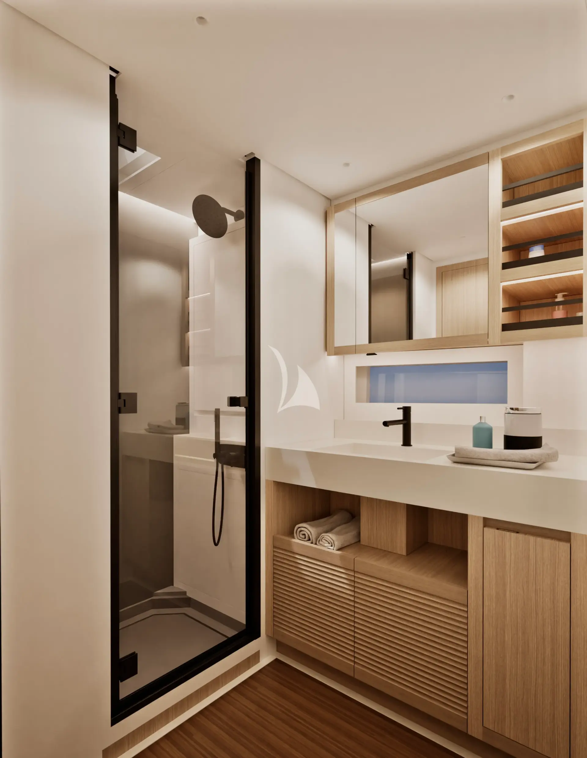 Below deck, BIANCA II feels bright, open, and contemporary. The lowered saloon floor enhances headroom and creates a strong sense of space, while large windows flood the interior with natural light. She accommodates up to 10 guests in 4 well-appointed cabins: a Master cabin, a VIP cabin with Pullman bed, a Twin cabin with Pullman bed, and a Twin cabin convertible into a double. All cabins feature en-suite bathrooms with separate shower boxes, ensuring comfort and privacy for every guest.